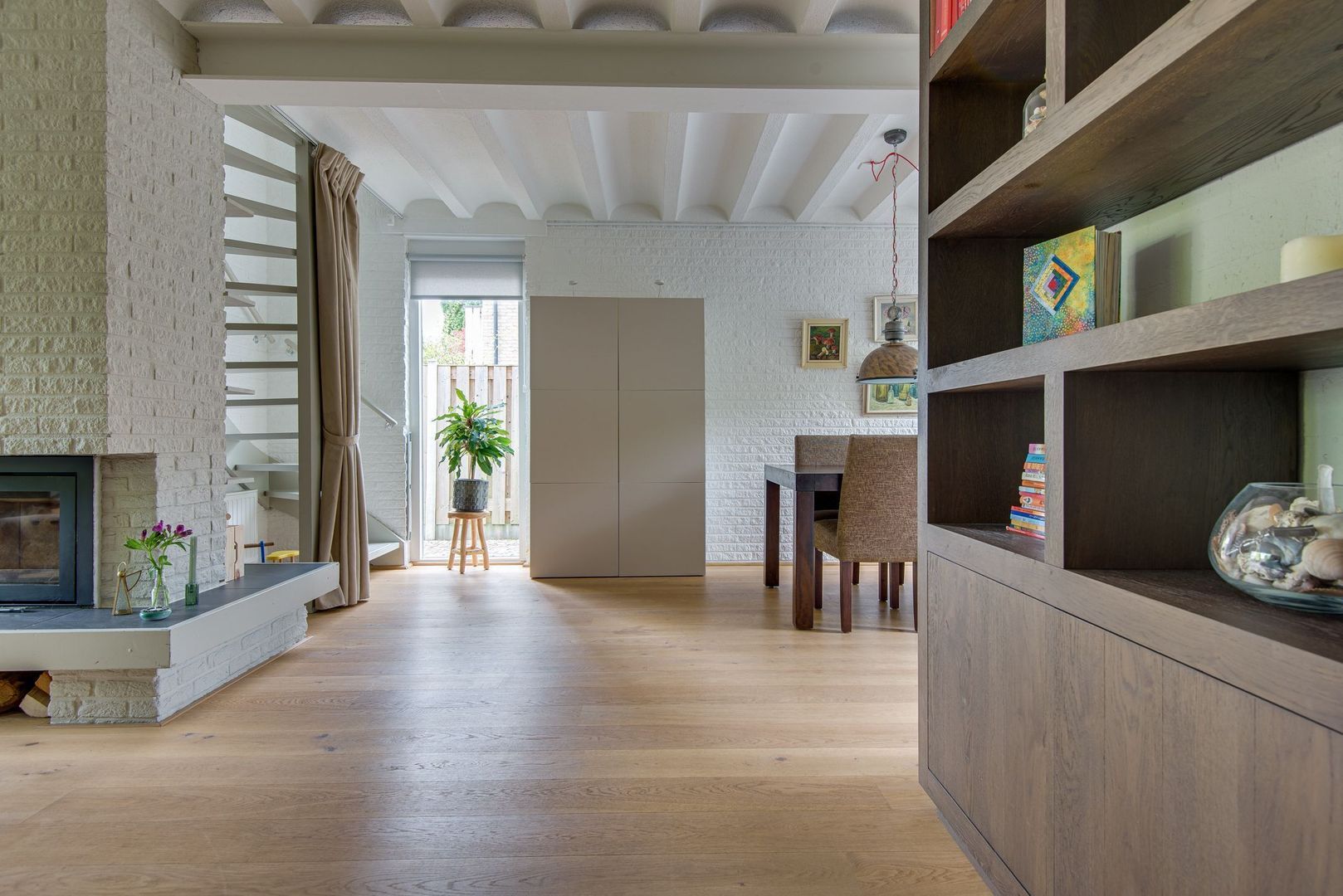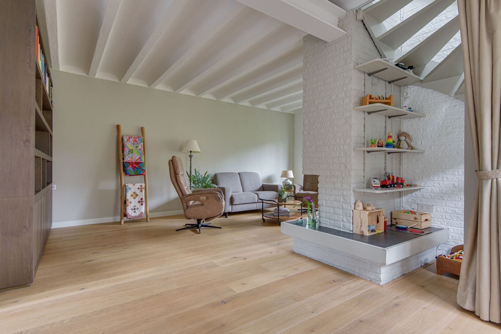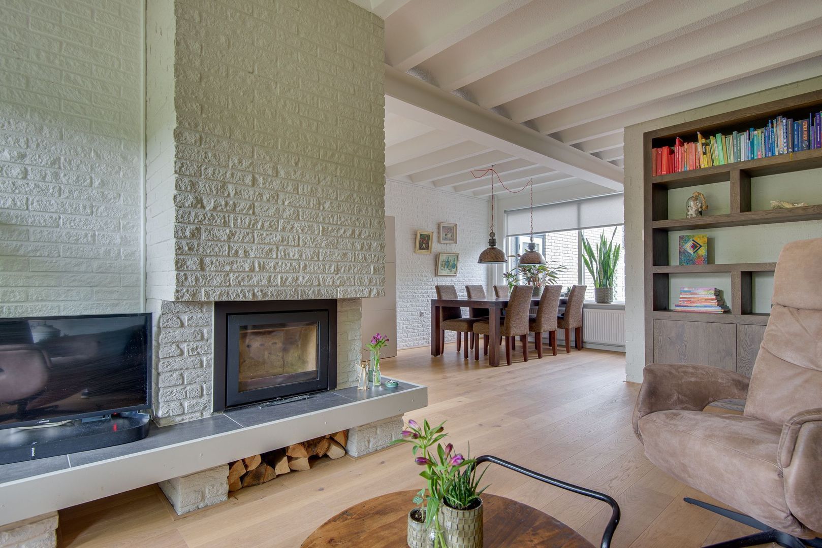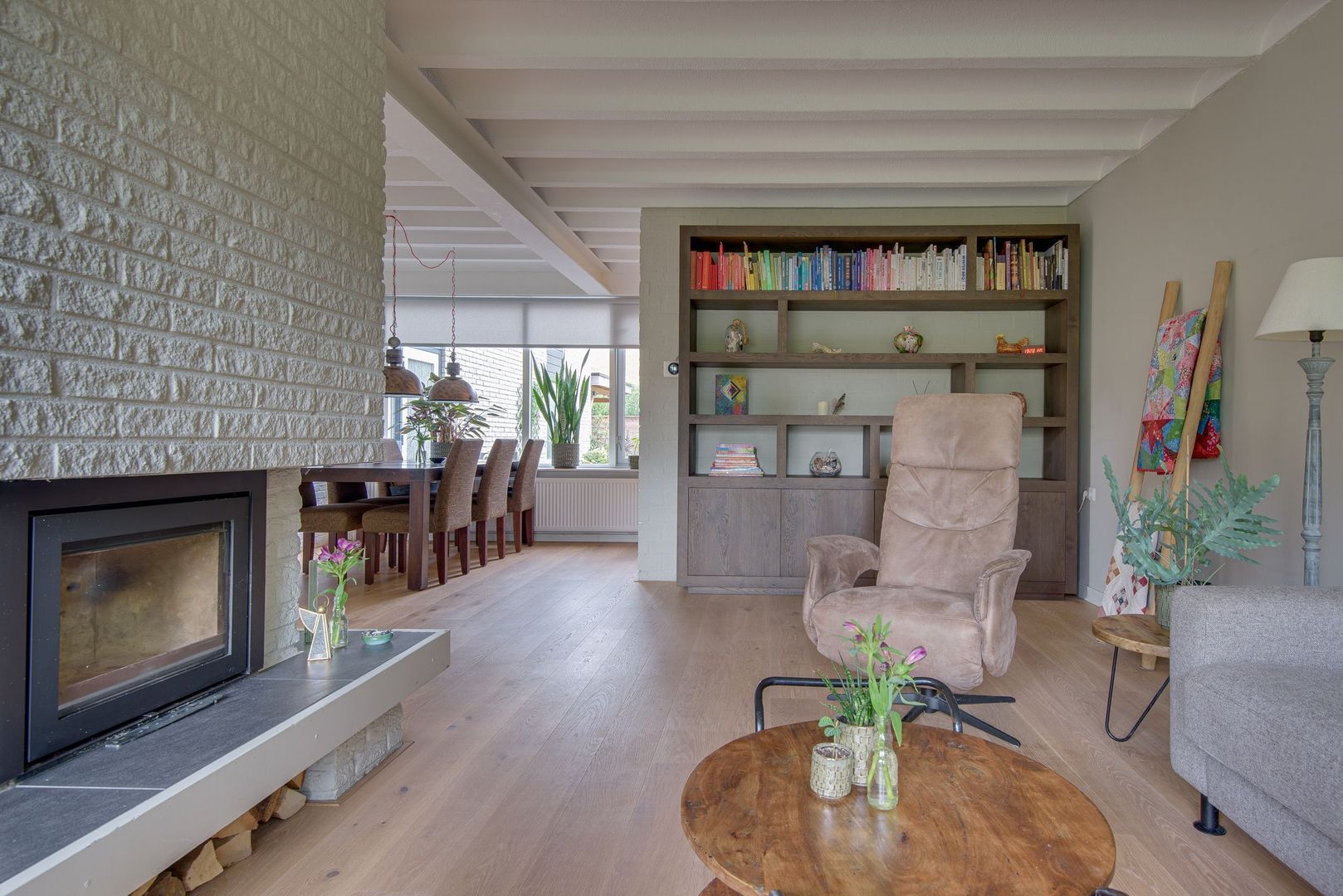De royale woonkamer is verdeeld in een gezellige zithoek aan de voorzijde met sfeervolle open haard en een ruim eetgedeelte aan de achterzijde, waar je geniet van het uitzicht op de achtertuin. Aansluitend bevindt zich de half open keuken, compleet met een royale keukenopstelling inclusief inbouwapparatuur. Vanuit de keuken is er een doorloop naar de bijkeuken, die toegang biedt tot de besloten achtertuin.