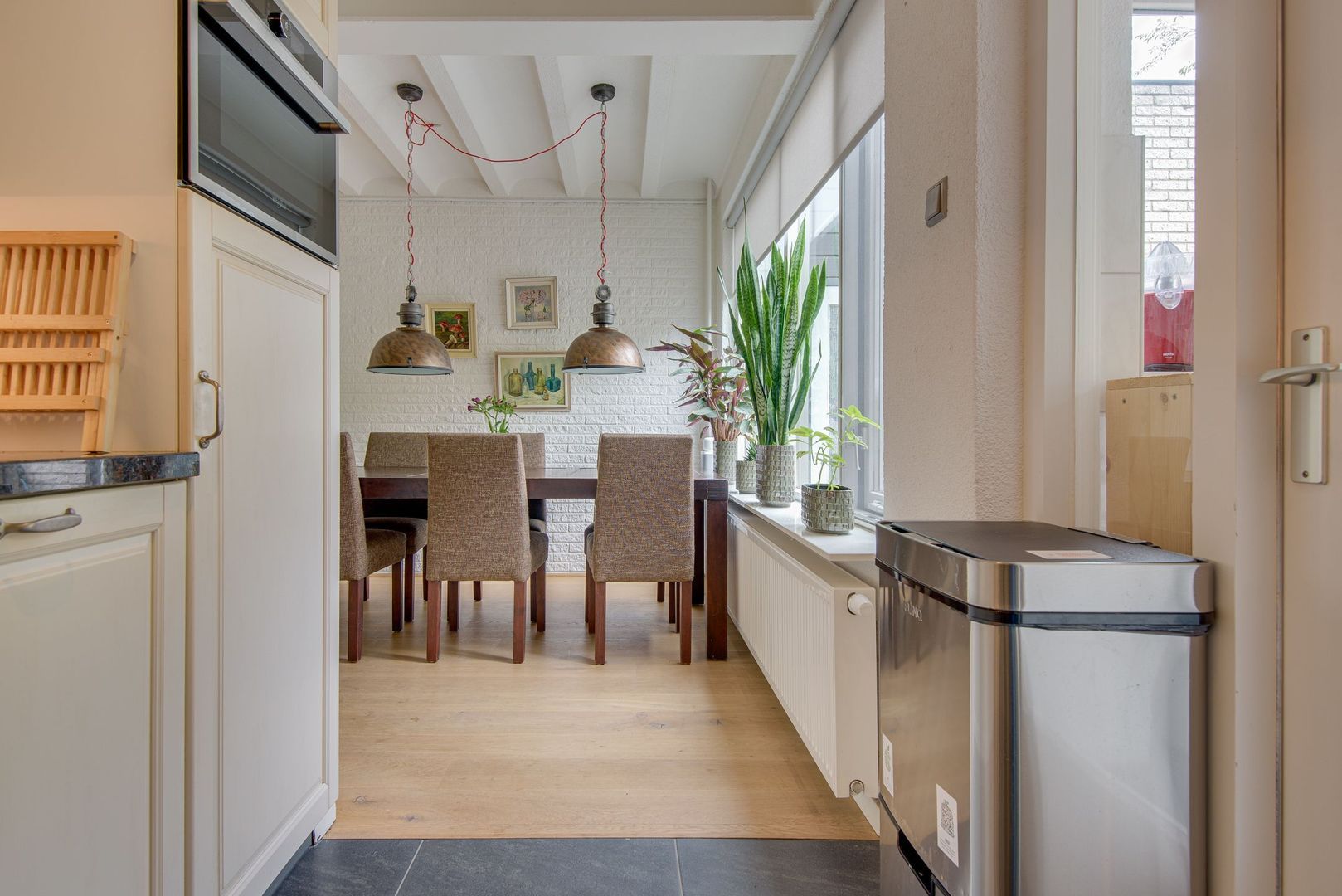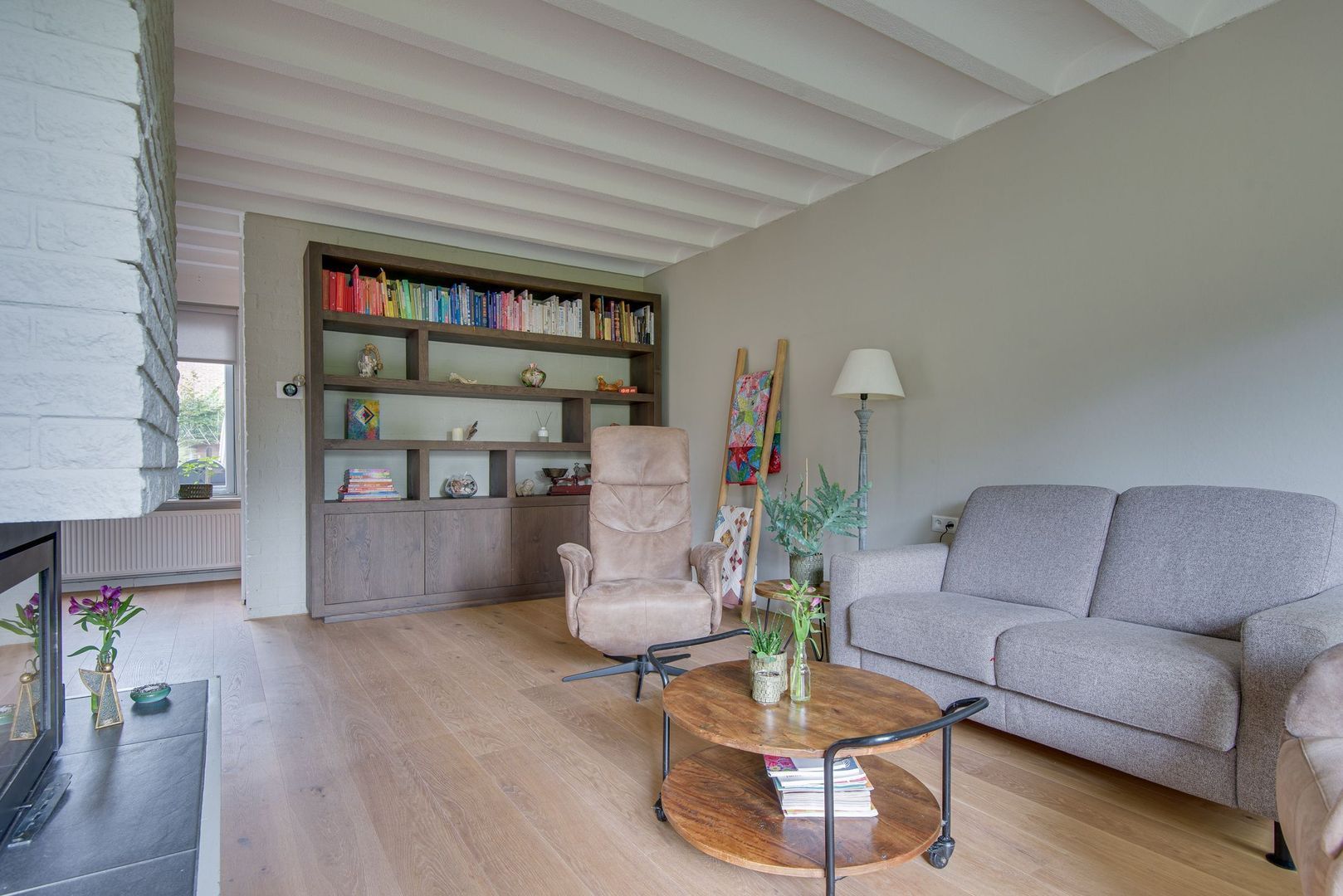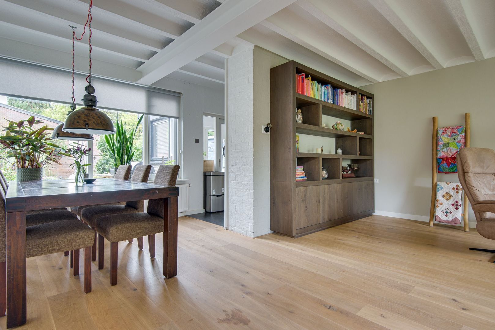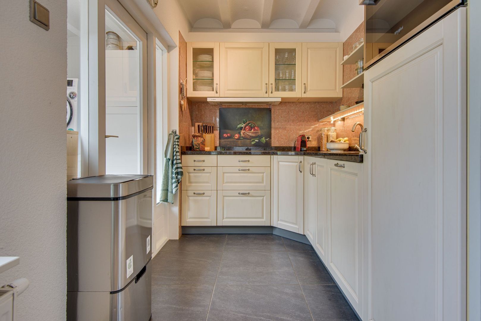 De royale woonkamer is verdeeld in een gezellige zithoek aan de voorzijde met sfeervolle open haard en een ruim eetgedeelte aan de achterzijde, waar je geniet van het uitzicht op de achtertuin. Aansluitend bevindt zich de half open keuken, compleet met een royale keukenopstelling inclusief inbouwapparatuur. Vanuit de keuken is er een doorloop naar de bijkeuken, die toegang biedt tot de besloten achtertuin.