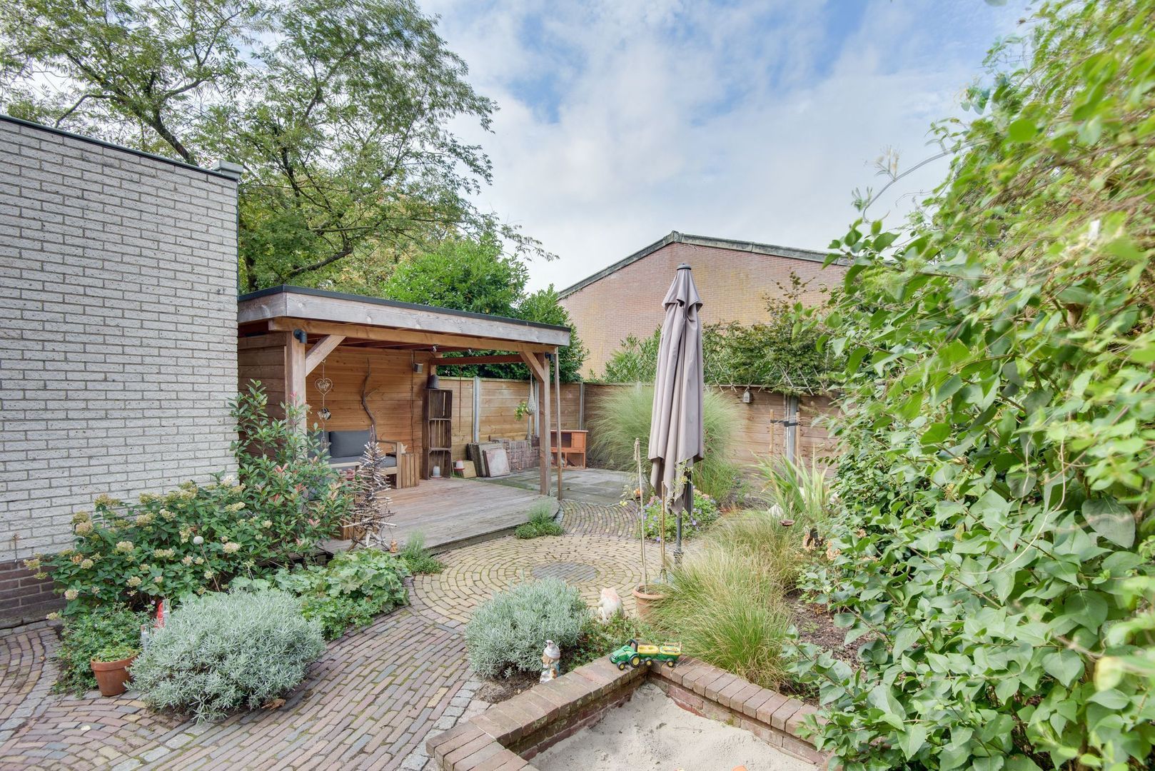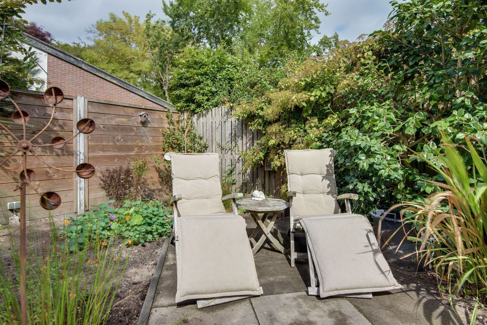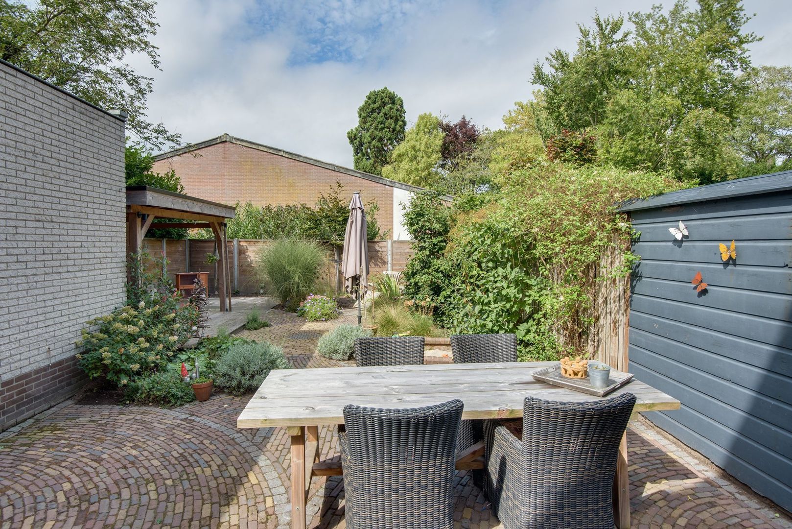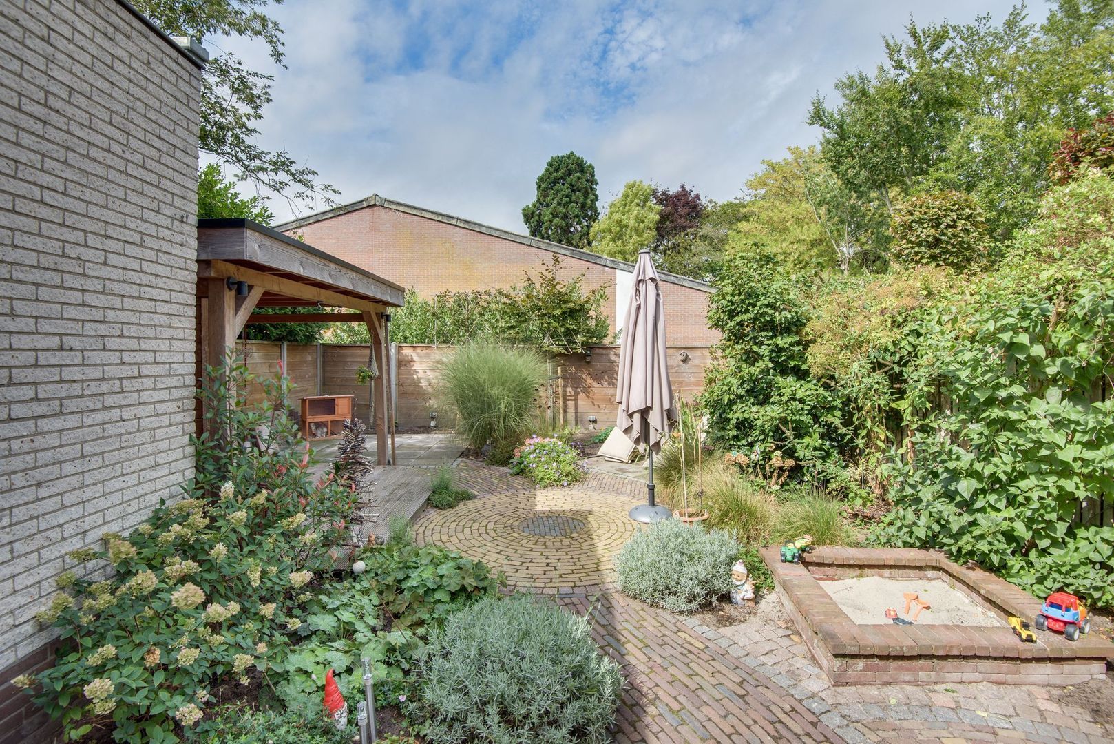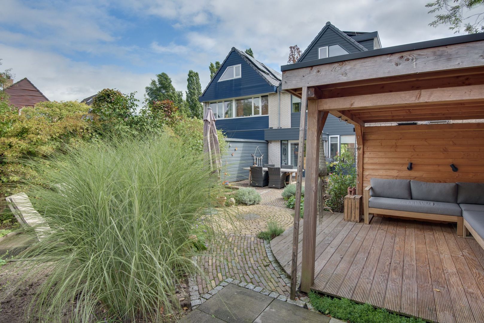 De achtertuin, gelegen op het noordwesten, is een fijne tuin met een mooie afwisseling van terras en diverse borders. De eigentijdse veranda is een sfeervolle buitenruimte waar je het hele jaar door kunt genieten van het buitenleven, ongeacht het weer. Dankzij de privacy is dit een heerlijke plek om van het buitenleven te genieten, van ochtend tot avond.