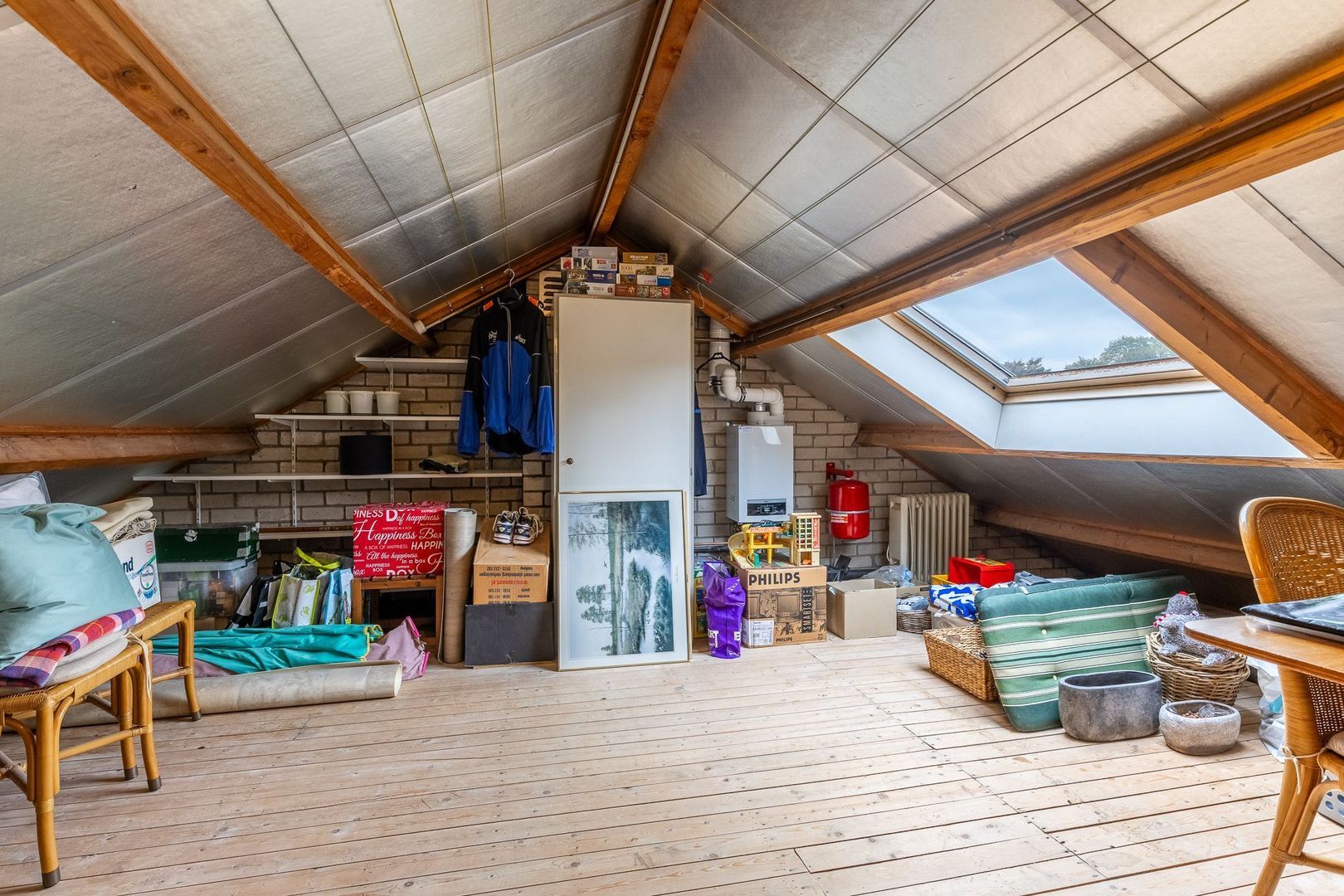Tweede verdieping: via vaste trap te bereiken royale zolderverdieping met groot Velux dakraam en twee ruime afsluitbare bergruimtes.