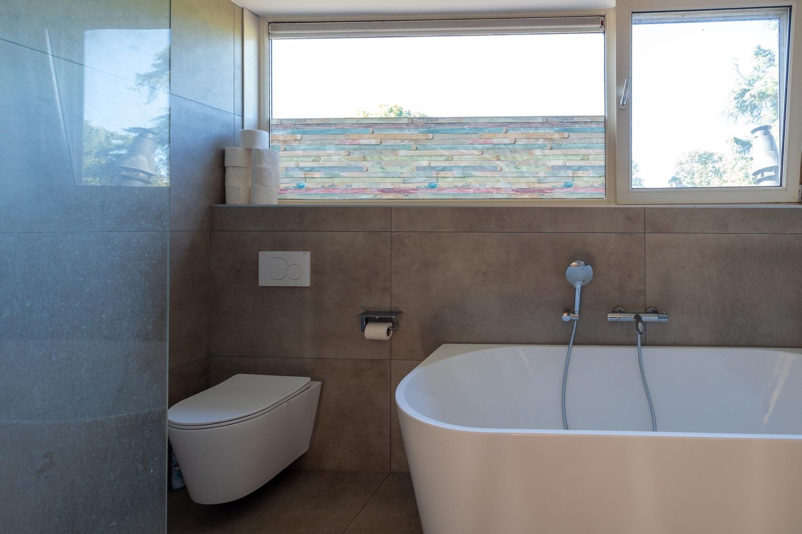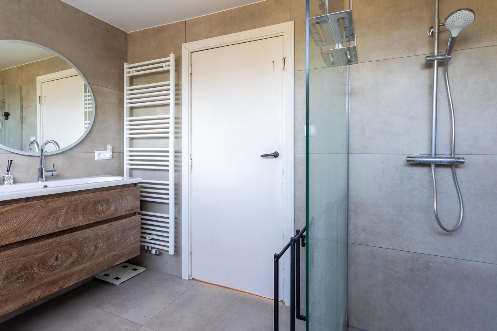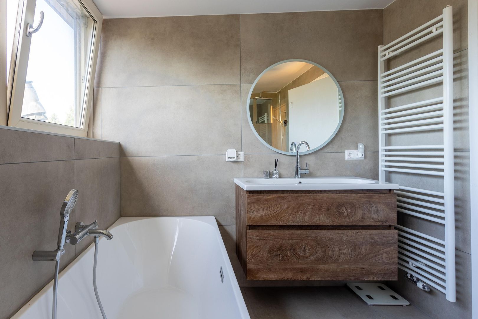 De badkamer is in november 2024 gerealiseerd en is voorzien van een brede wastafel met daaronder lades, een inloopdouche en ligbad. Door de aanwezige ramen kun je goed ventileren en begin je aangenaam aan de dag door het binnenvallende daglicht.