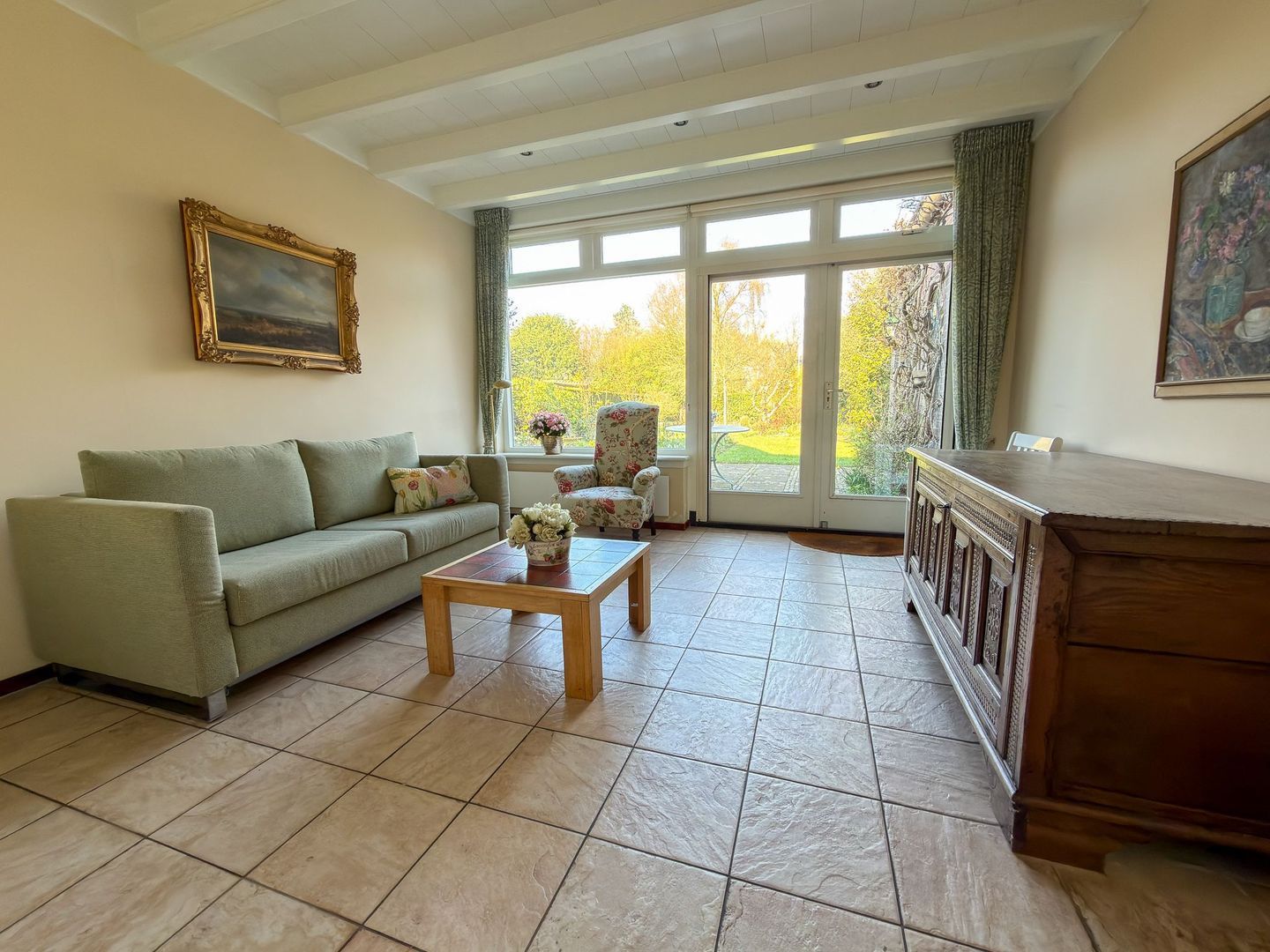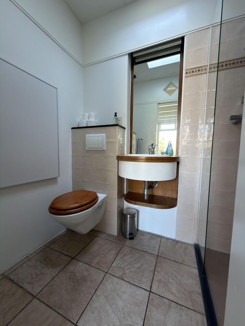 Aan de achterzijde van de woning ligt de heerlijke tuinkamer. Deze ruimte is voorzien van vloerverwarming en een, doormiddel van een schuifdeur afgeschermd, apart toilet met een wasmeubel en een douchecabine. Het is een lichte ruimte die zich goed leent als zitkamer, eetkamer of werkplek. Door de openslaande deuren is deze kamer verbonden met de diepe achtertuin.