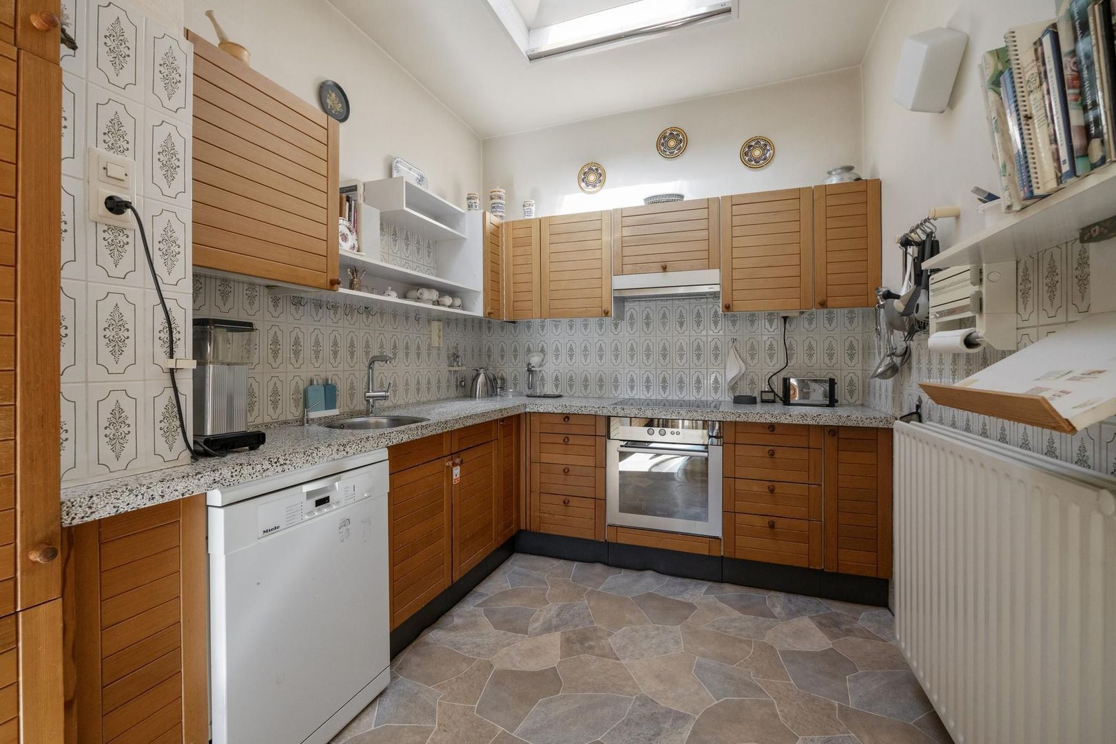 Je stapt binnen in de hal met meterkast. Aansluitend kom je de ruime eetkeuken waar het bereiden van heerlijke gerechten en het samenzijn gecombineerd kunnen worden. De keuken heeft een L-vormige opstelling en is voorzien van een vaatwasser, koel-vriescombinatie, inductiekookplaat, elektrische oven en afzuigkap. Daarnaast verleent de keuken toegang via een schuifpui naar de heerlijke tuin.