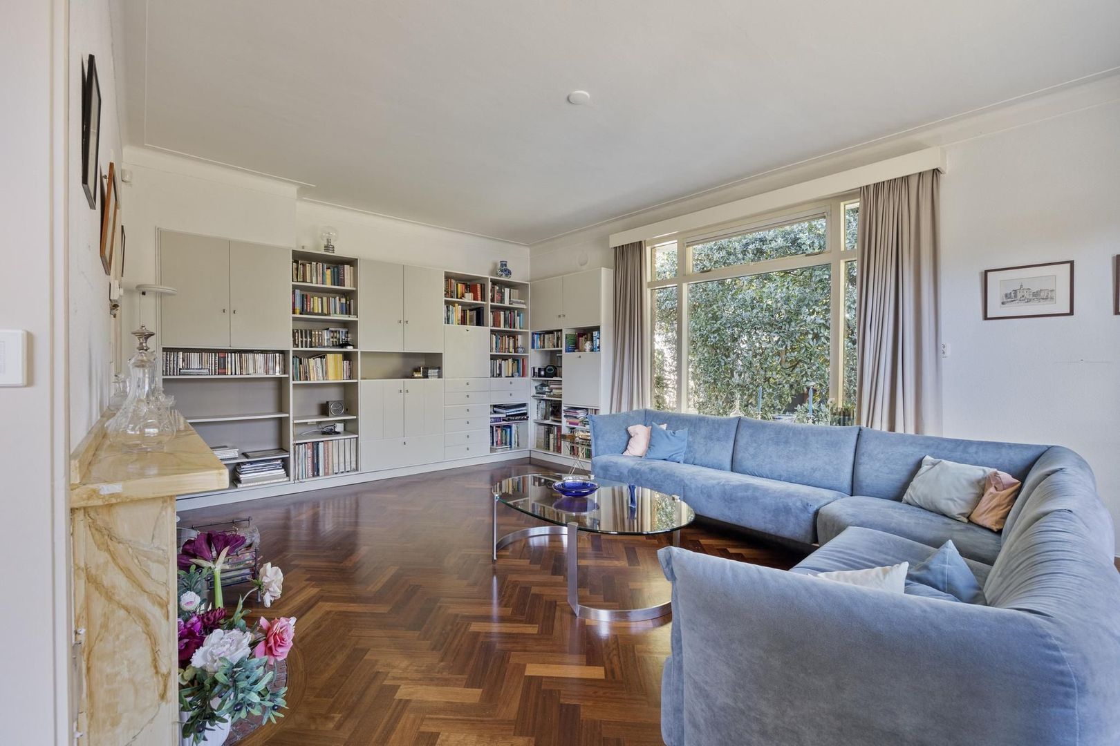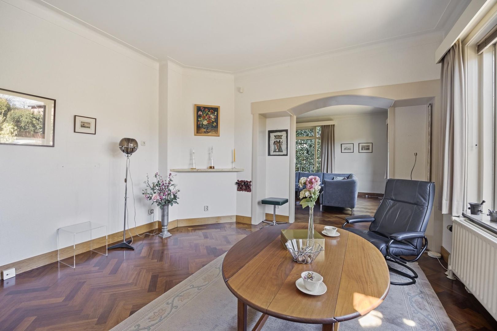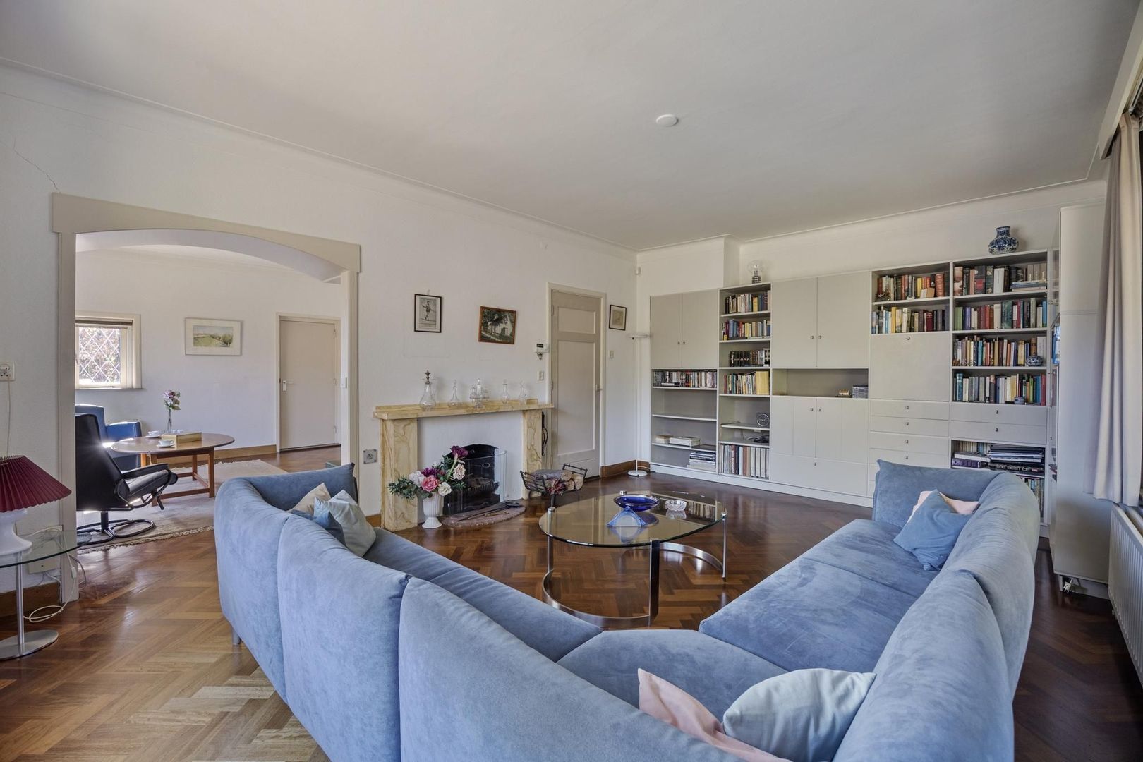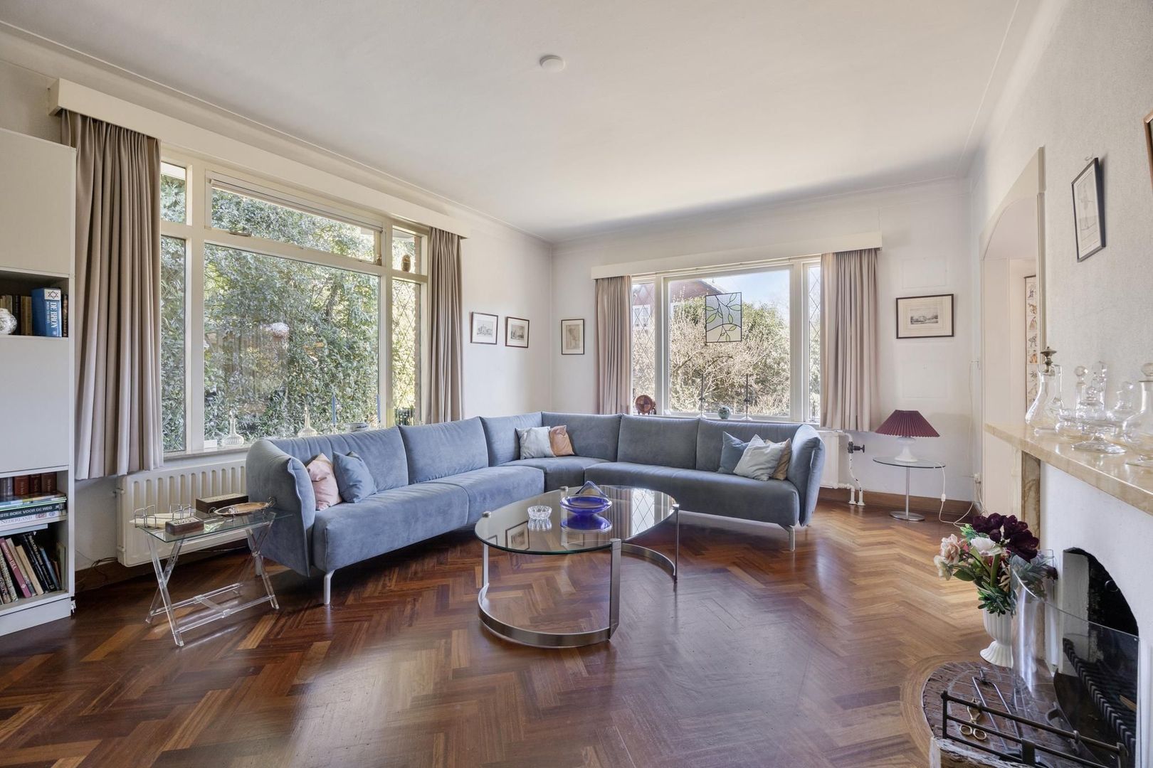 Via de hal is de L- vormige royale woonkamer met openhaard te bereiken. Door de raampartijen is er volop lichtinval. De mooie details van glas in lood zijn hier ook terug te vinden.