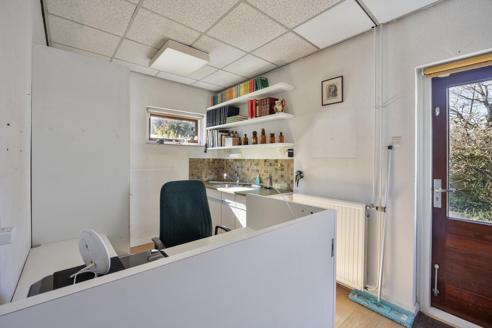 Zowel via de woonkamer als via de hal is het voormalige praktijkgedeelte te bereiken. Deze heeft een aparte entree. Hier is nog de wachtkamer en receptie/ apotheekgedeelte met pantry te vinden alsook een toegangsdeur tot de achtertuin.