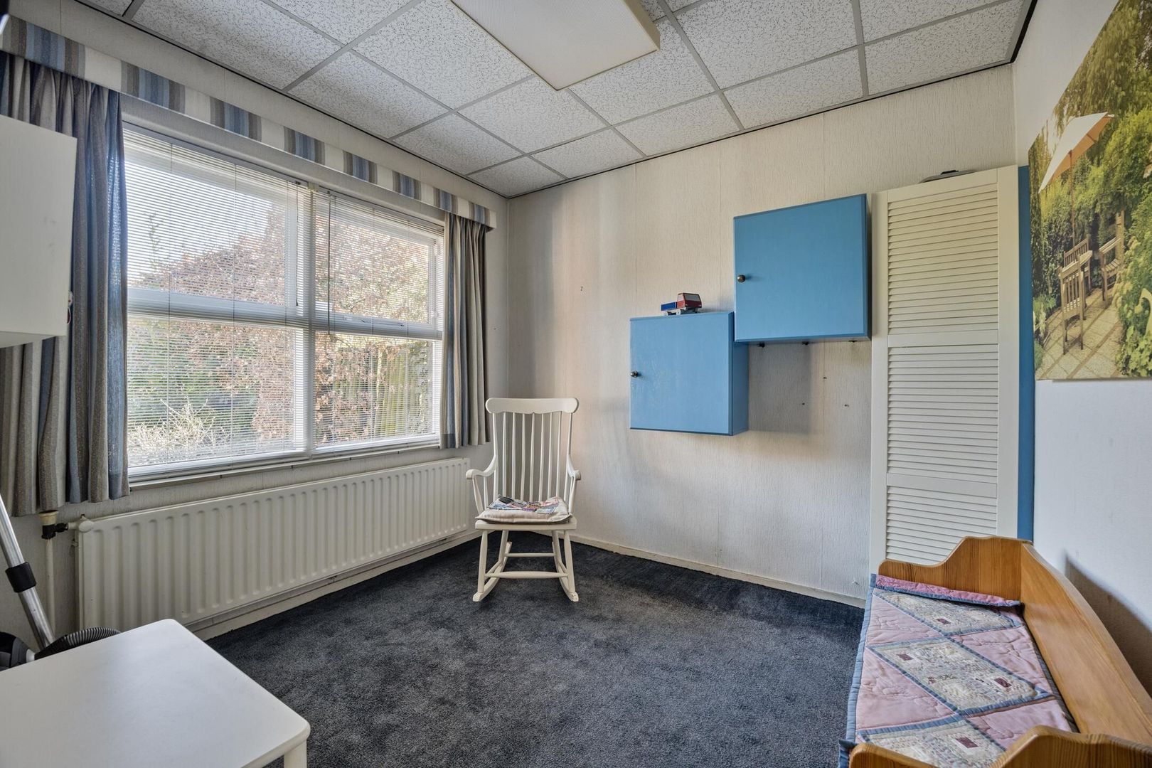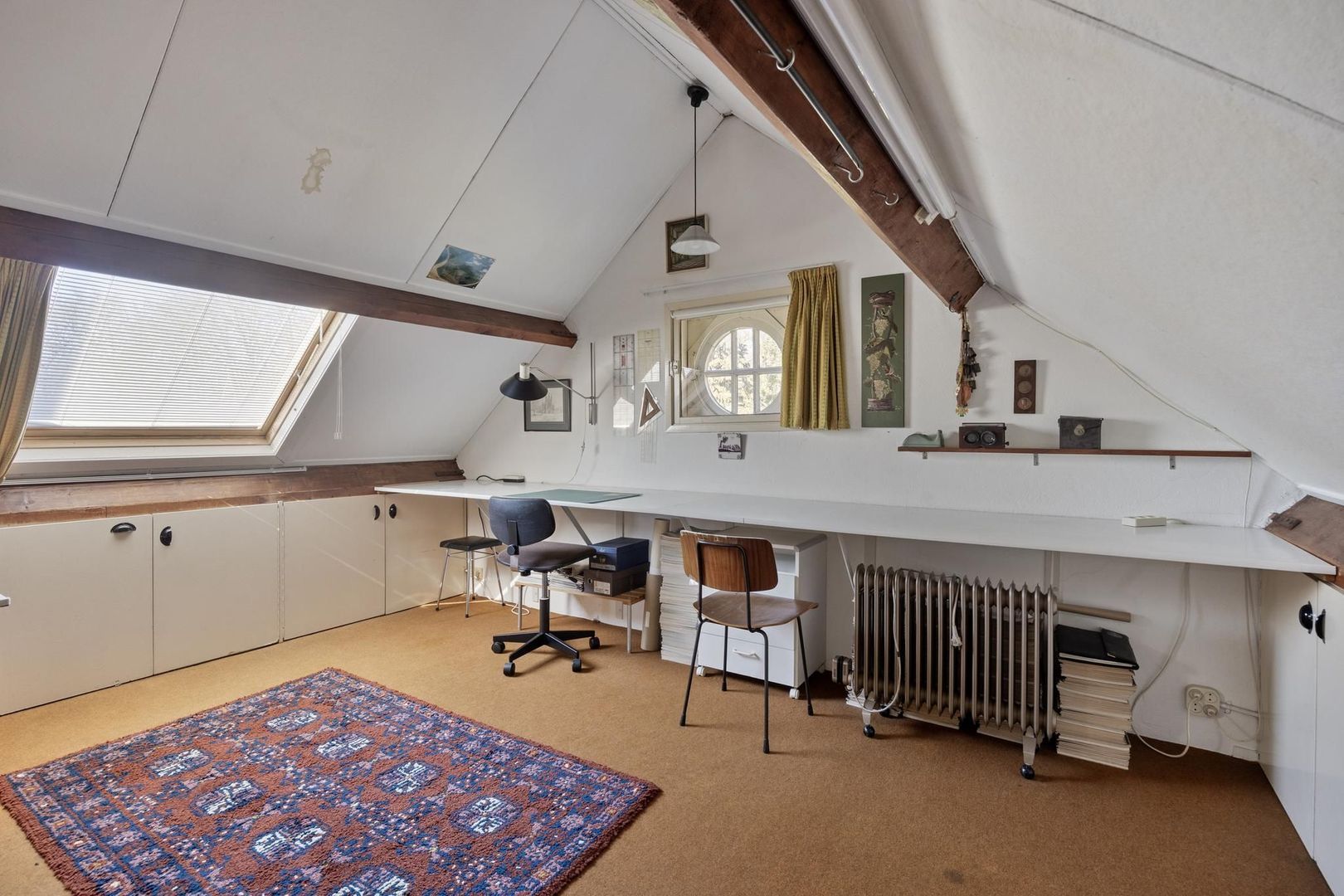 Tweede verdieping: via een vaste trap kom je op de voorzolder waar ook een wasmachine aansluiting te vinden is deze zou ook prima als werkkamer gebruikt kunnen worden. Hier is ook de 4e slaapkamer te vinden met Velux dakraam. Achter knieschotten is een zee aan bergruimte voor niet alledaagse spullen.