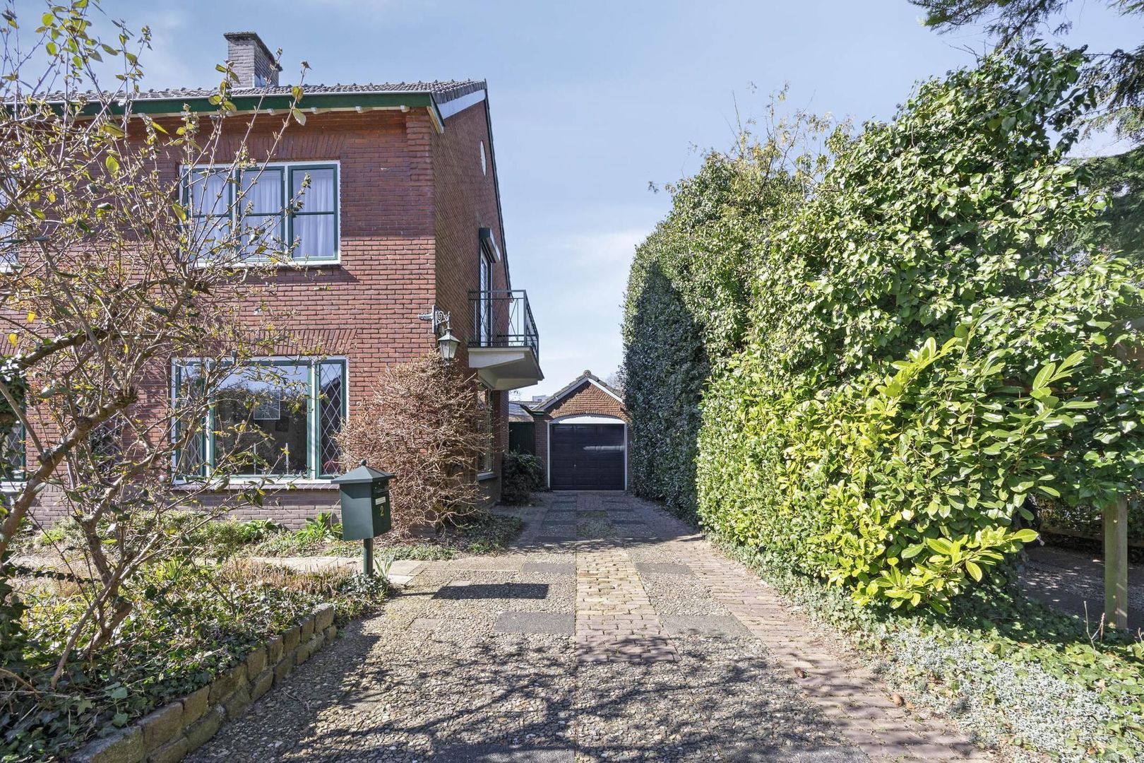 Via de oprit is de vrijstaande stenen garage met elektrische garagedeur te bereiken.