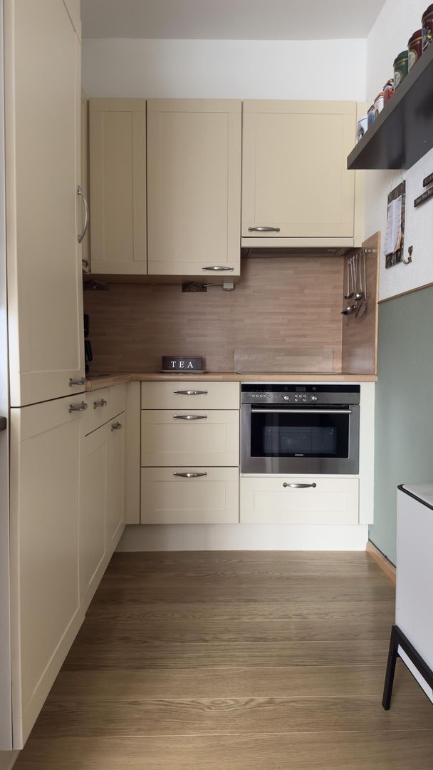 Aansluitend vind je de halfopen keuken. Deze is uitgevoerd in een lichte kleurstelling en voorzien van diverse inbouwapparatuur, waaronder een koelkast, combi-oven en inductiekookplaat.