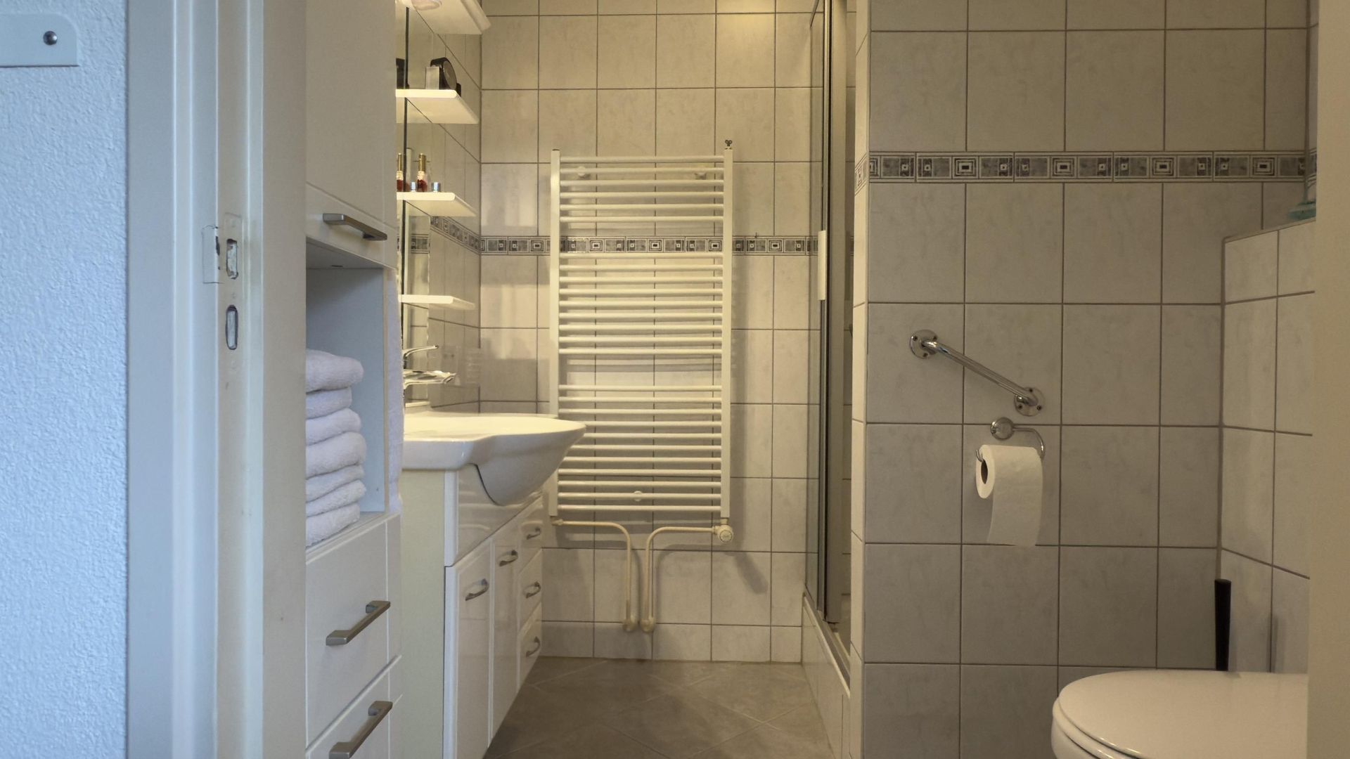 Daarnaast ligt de badkamer, compleet met toilet, douche, wastafelmeubel en designradiator.