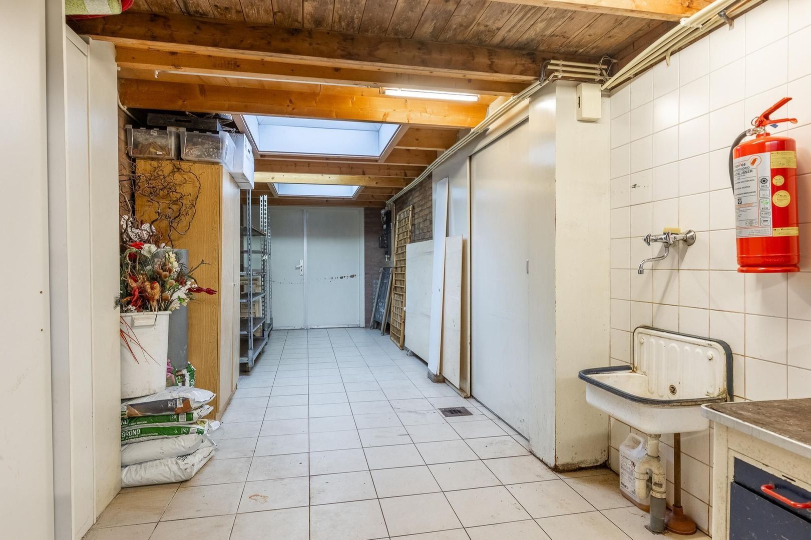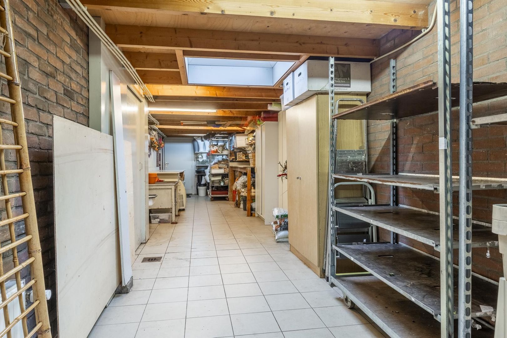 Je stapt binnen in een zeer royale winkelruimte ontstaan door de uitbouw aan de achterzijde. De ruimte heeft een toegang tot de ruime kelderkast en ook toegang naar de hal van de bovenwoning. Via de winkelruimte kom je in de zeer ruime garage c.q. werkplek met aansluitend het kantoortje voorzien van een aparte toiletruimte en de cv-ketel.