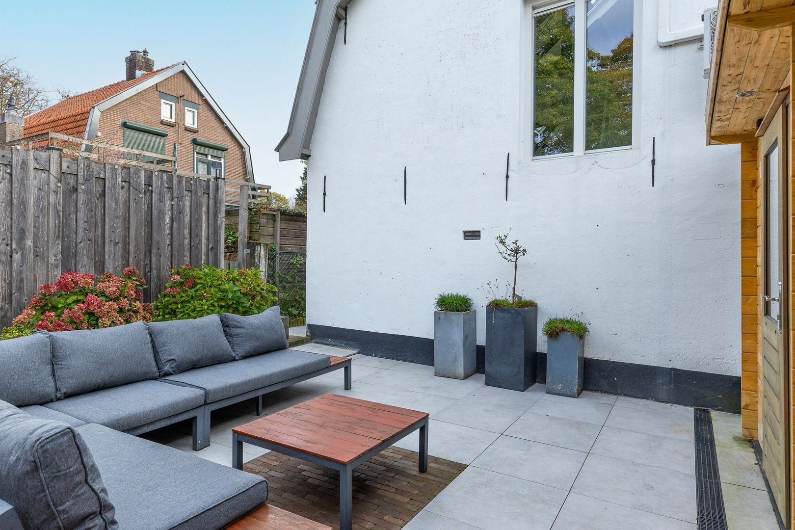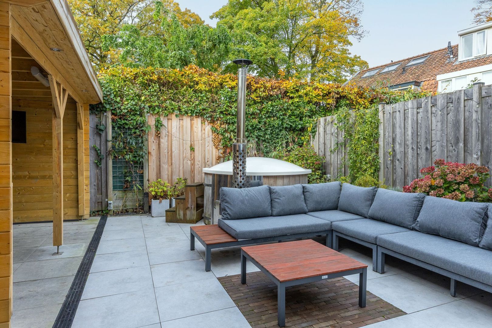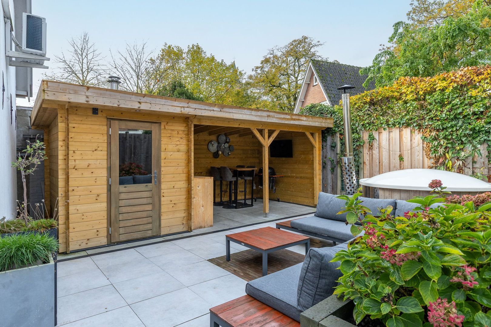 De privacy rijke achtertuin op het westen is voorzien van houten schuur met daaraan vast een ruime veranda.