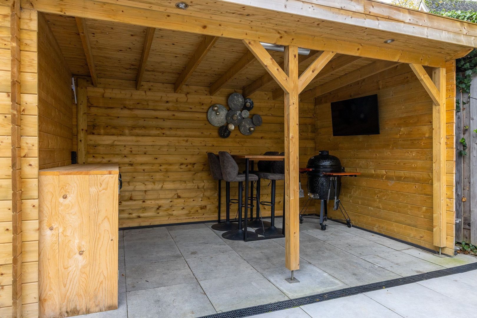 De achtertuin, gelegen op het westen, is strak aangelegd gecombineerd met ‘groen’. Een heerlijke plek om te ontspannen. Vanwege de ligging achter de woning zit je beschut en ervaar je veel privacy. Het grote terras is perfect voor lange zomeravonden met vrienden en familie. De groene borders rondom zorgen voor een sfeervolle, natuurlijke uitstraling. De grote veranda, direct verbonden met de houten schuur, is echt een bonus — een extra buitenkamer waar je zomer én winter plezier van hebt.