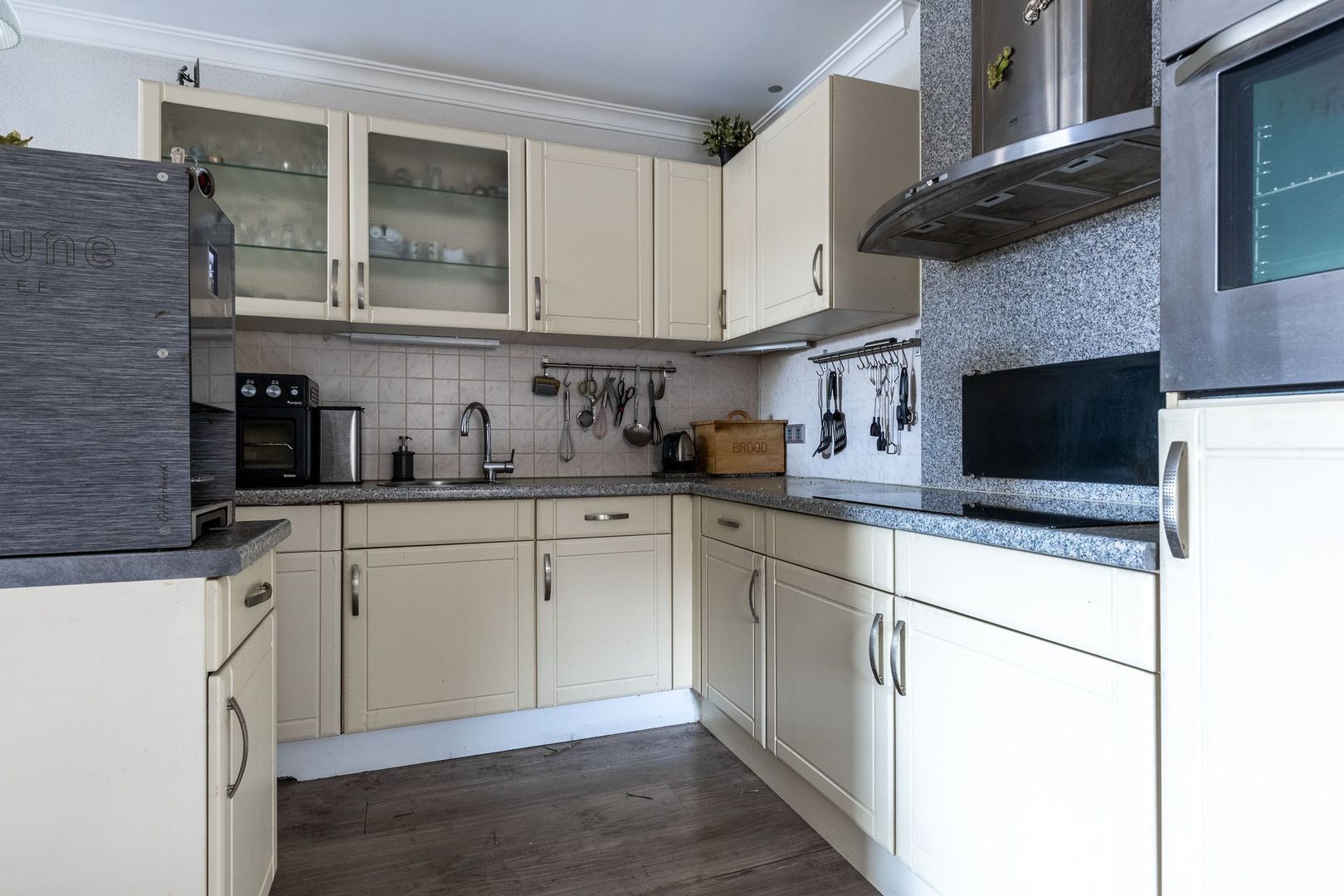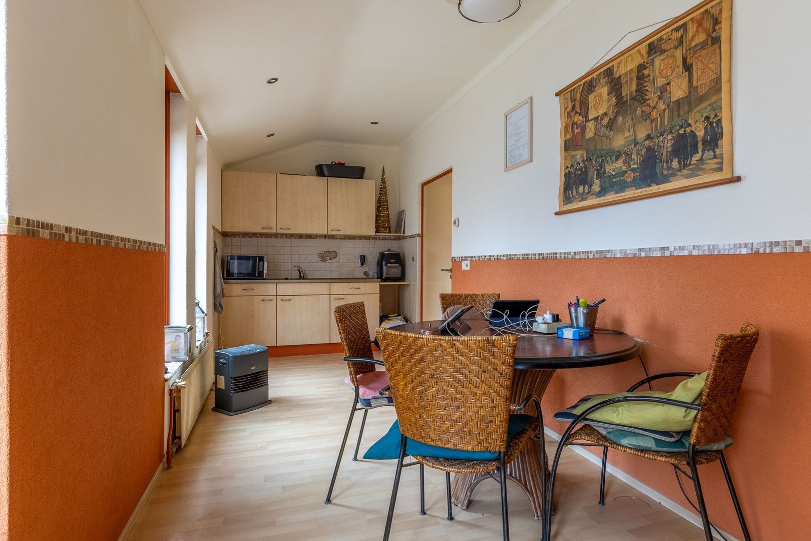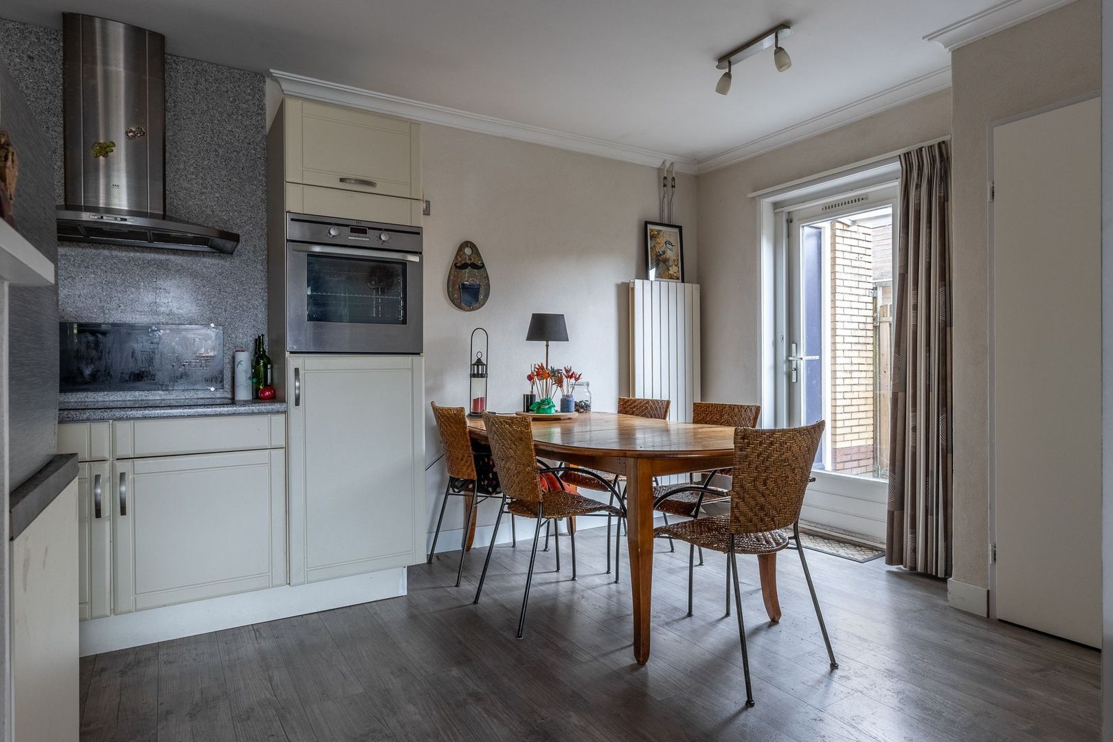 De halfopen keuken aan de achterzijde is praktisch ingedeeld in een U-vorm en voorzien van inbouwapparatuur. Er is voldoende plek voor een eettafel en dankzij de toegang tot de zijtuin loop je zo naar buiten.