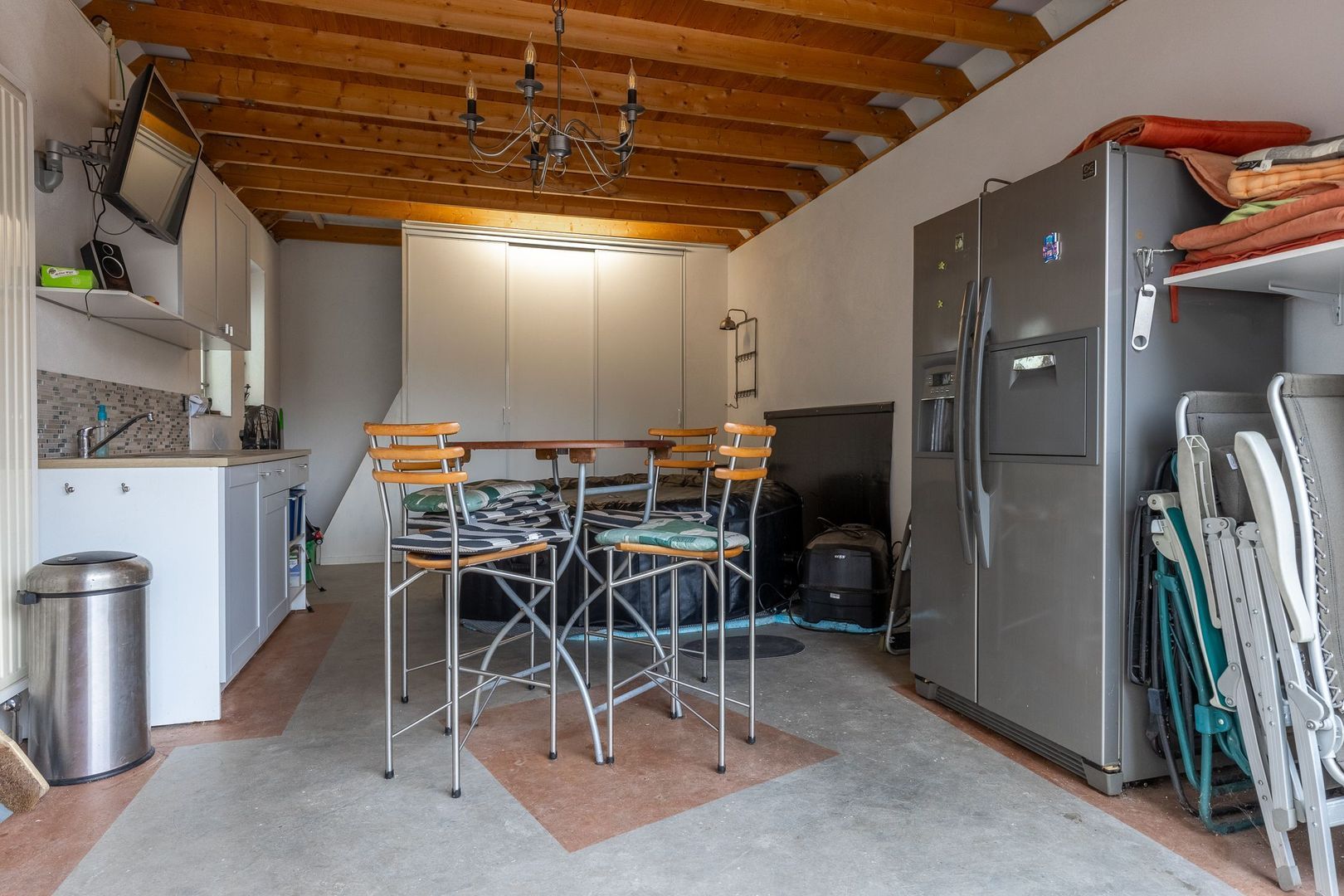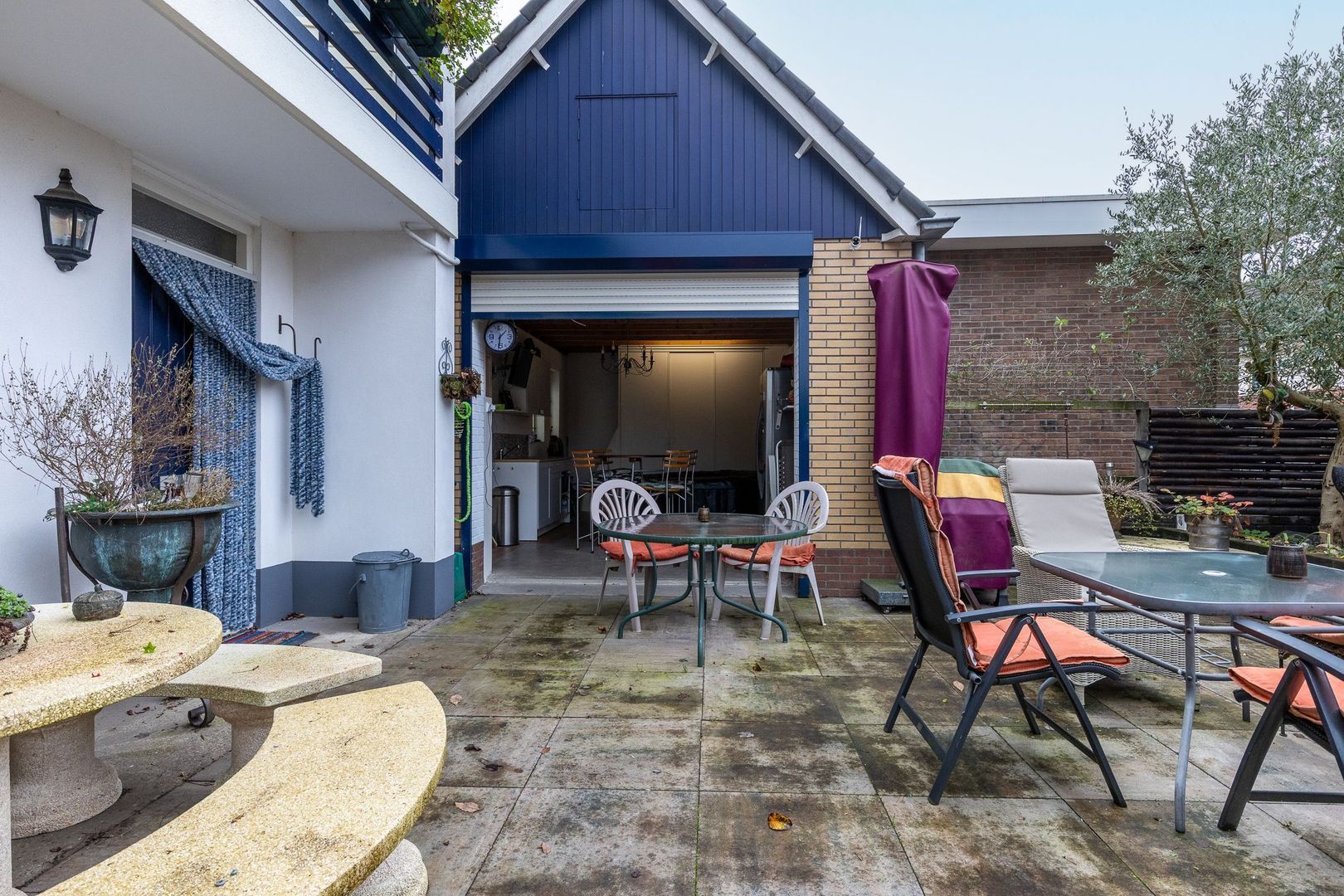 Aan de voorzijde van het perceel staat een vrijstaande garage, momenteel in gebruik als extra leefruimte. Met de roldeur open creëer je een heerlijk verlengstuk van het buitenleven. Bovendien beschikt de garage over een vliering met veel opslagruimte.