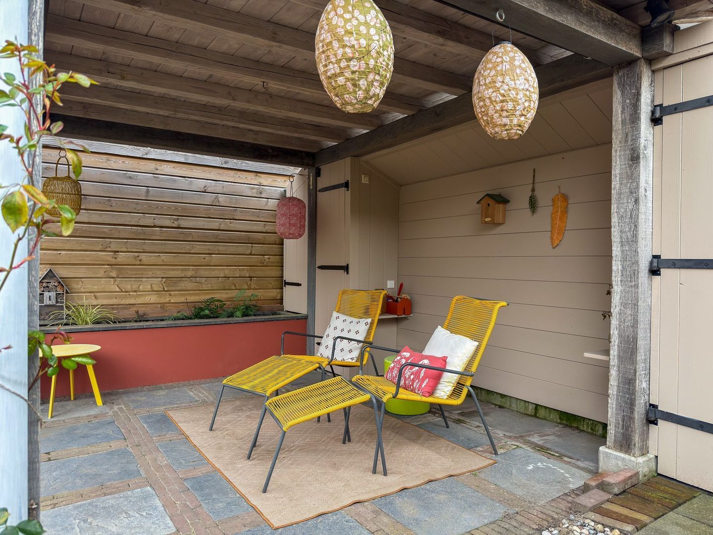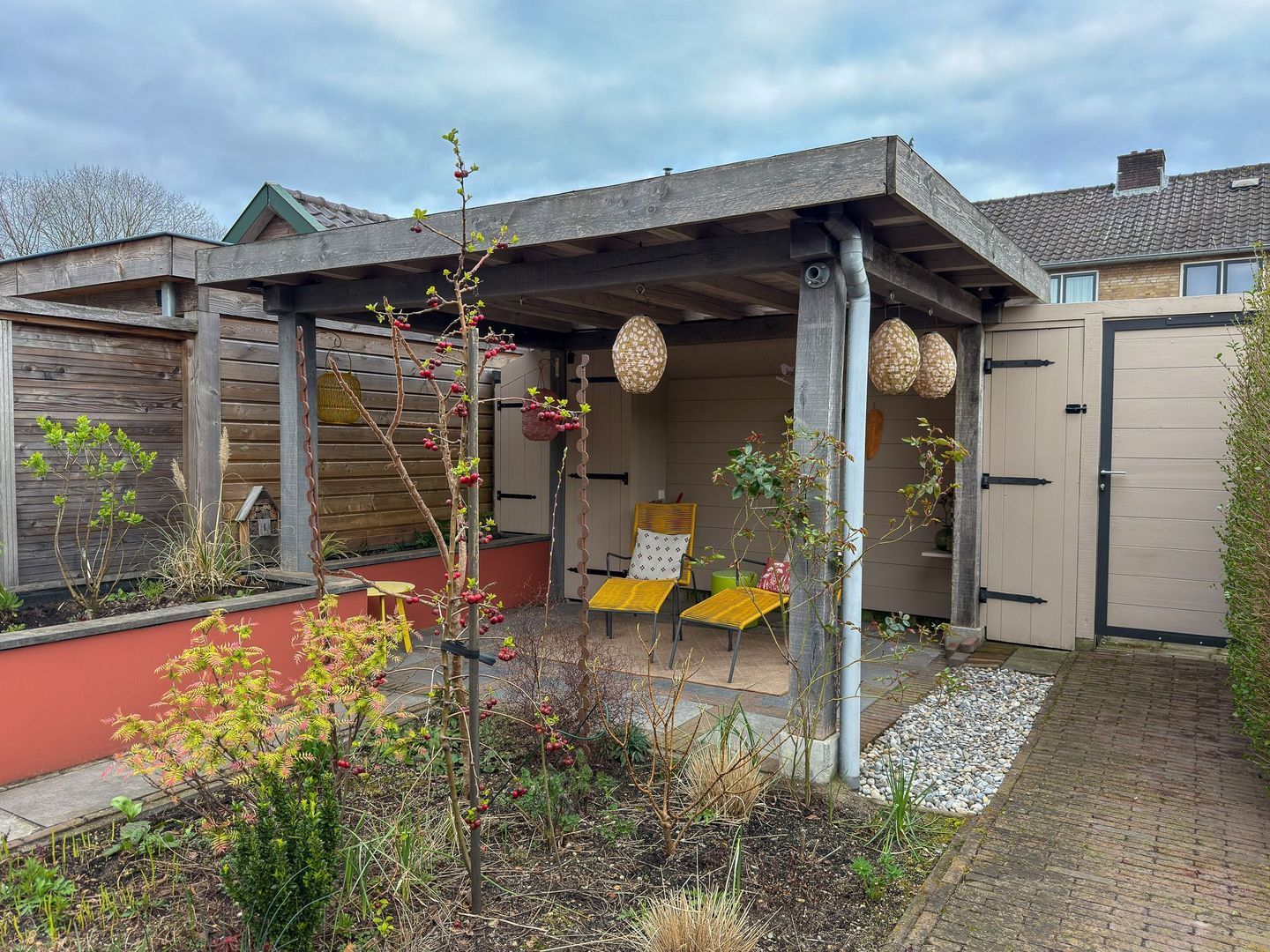 De achtertuin is diep en verzorgd aangelegd, met een fijne combinatie van groen en bestrating. Achter in de tuin staat een sfeervolle overkapping waar je beschut zit en waar je al vroeg in het voorjaar en tot laat in de avond kunt genieten.