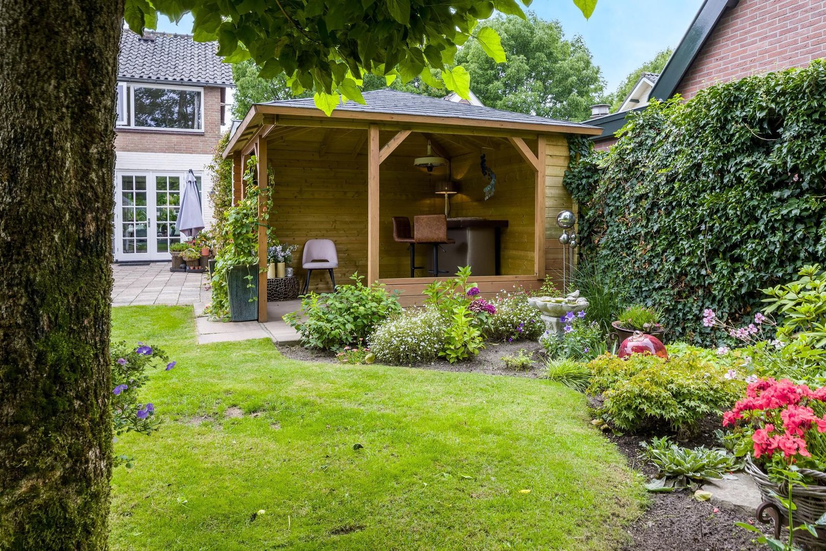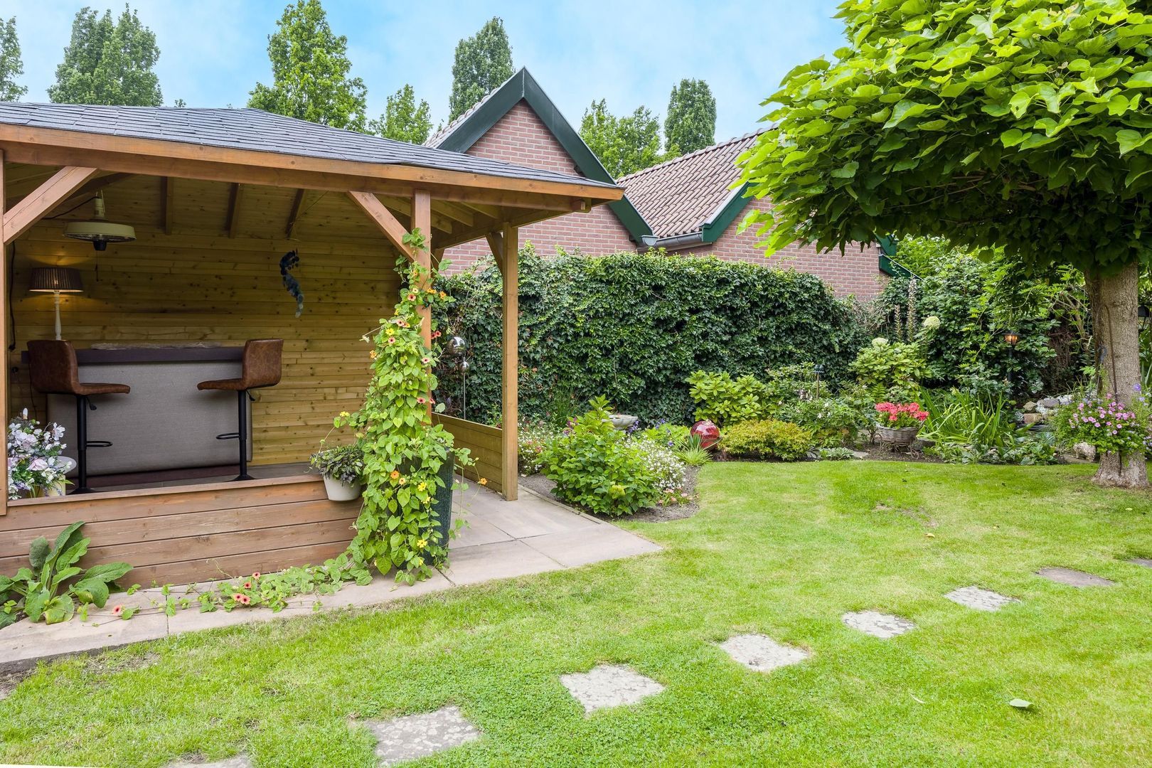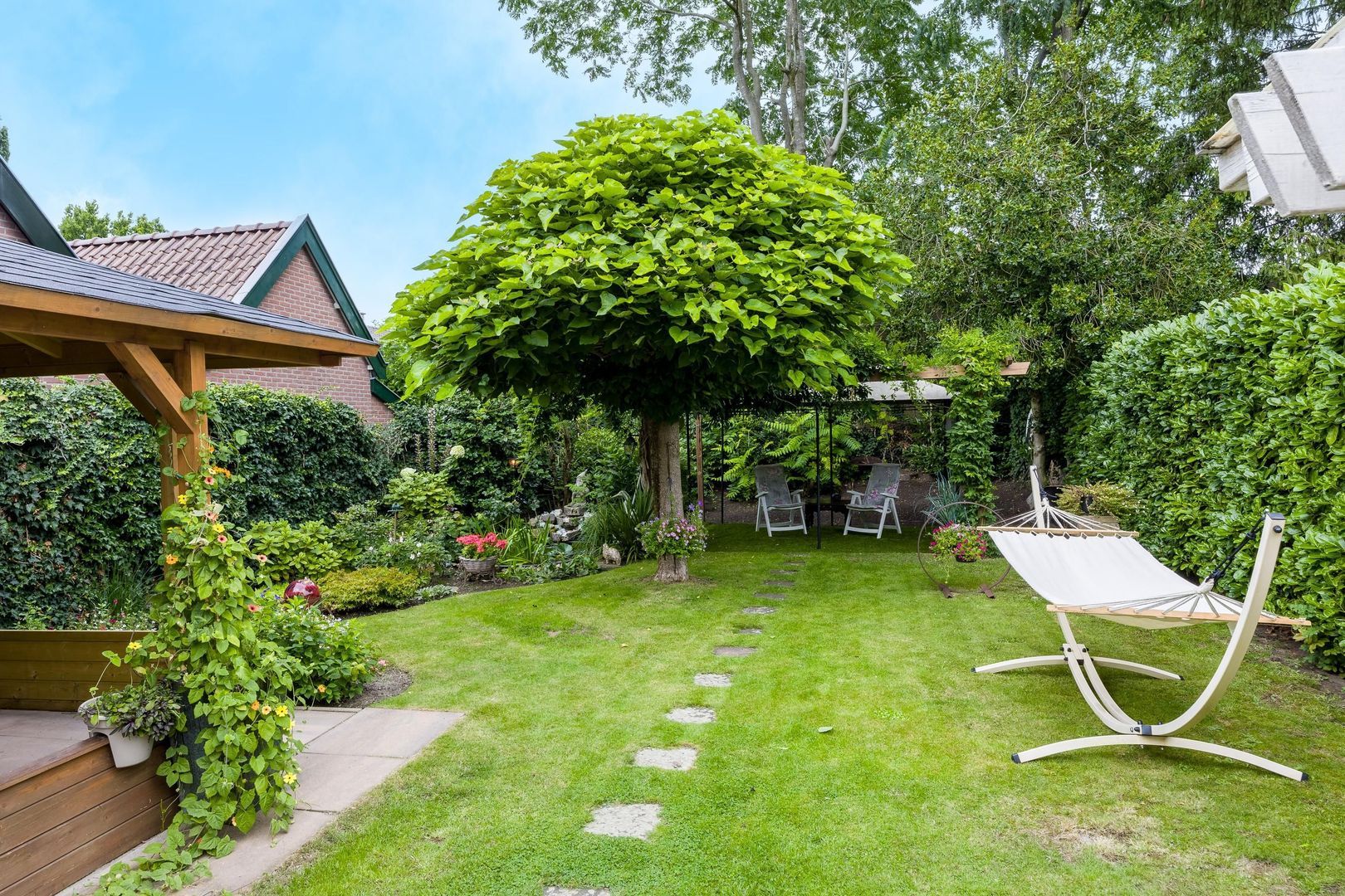 De achtertuin is een ware verrassing. Hoewel deze op het noordoosten is gelegen, zorgt de royale diepte ervoor dat er de hele dag door volop zon aanwezig is. Dankzij de twee overkappingen is er altijd een beschutte plek om te ontspannen, ongeacht het weer. De vijver in de tuin sluit mooi aan bij de diverse beplanting, waardoor de tuin een fijne uitstraling heeft en elk jaargetijde wat nieuws laat zien.