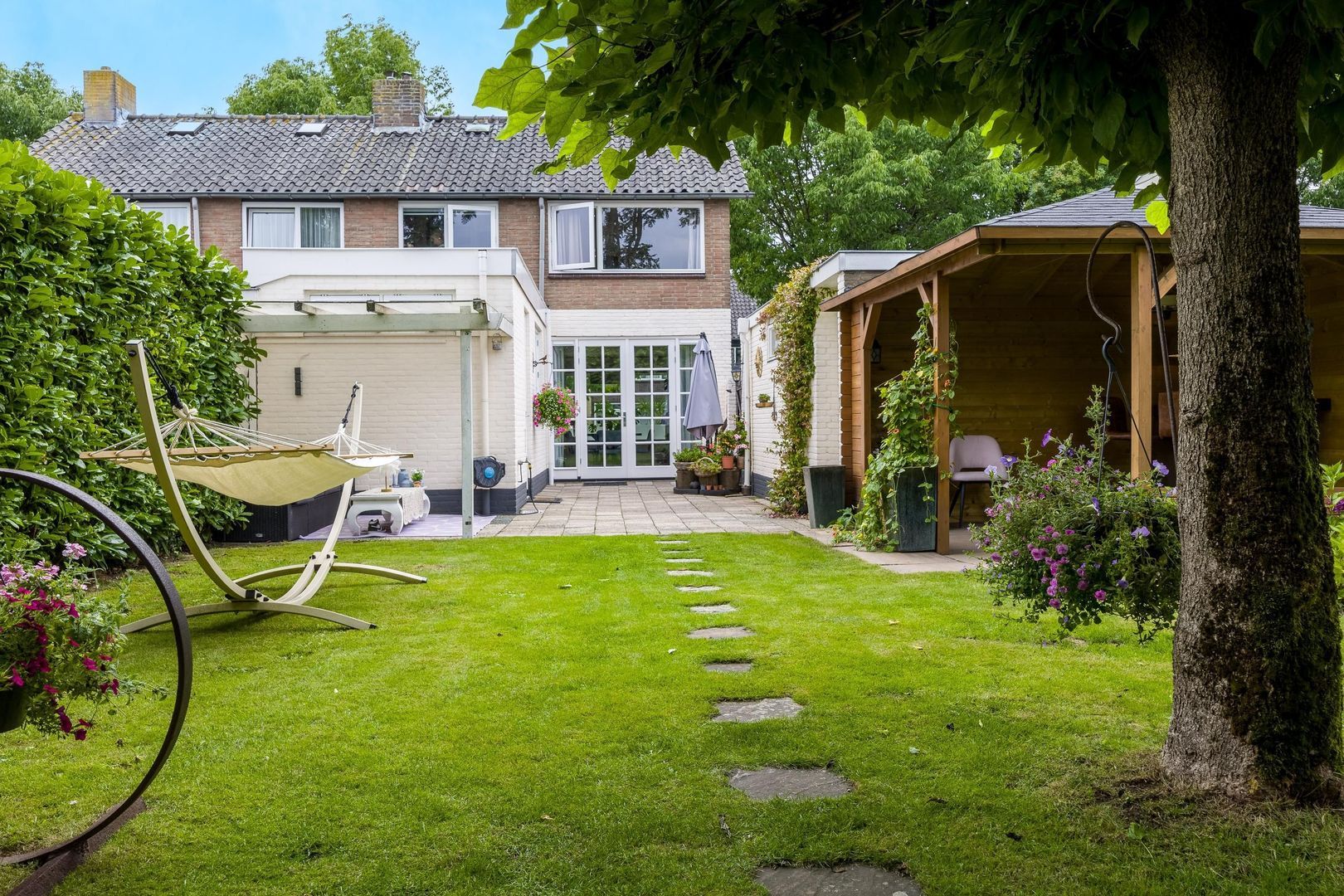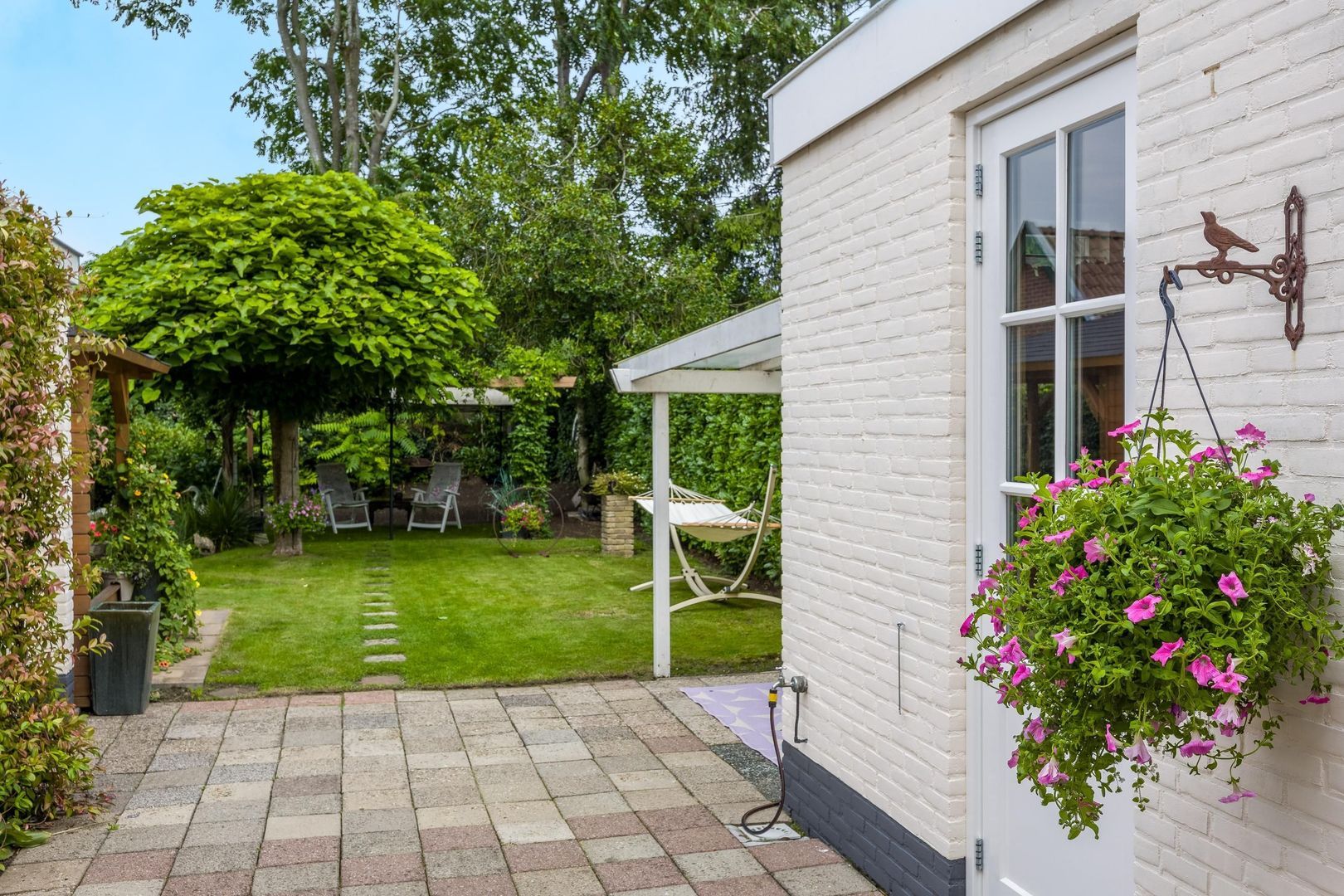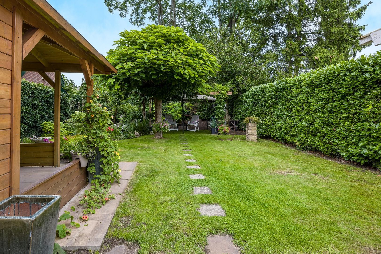De achtertuin is een ware verrassing. Hoewel deze op het noordoosten is gelegen, zorgt de royale diepte ervoor dat er de hele dag door volop zon aanwezig is. Dankzij de twee overkappingen is er altijd een beschutte plek om te ontspannen, ongeacht het weer. De vijver in de tuin sluit mooi aan bij de diverse beplanting, waardoor de tuin een fijne uitstraling heeft en elk jaargetijde wat nieuws laat zien.