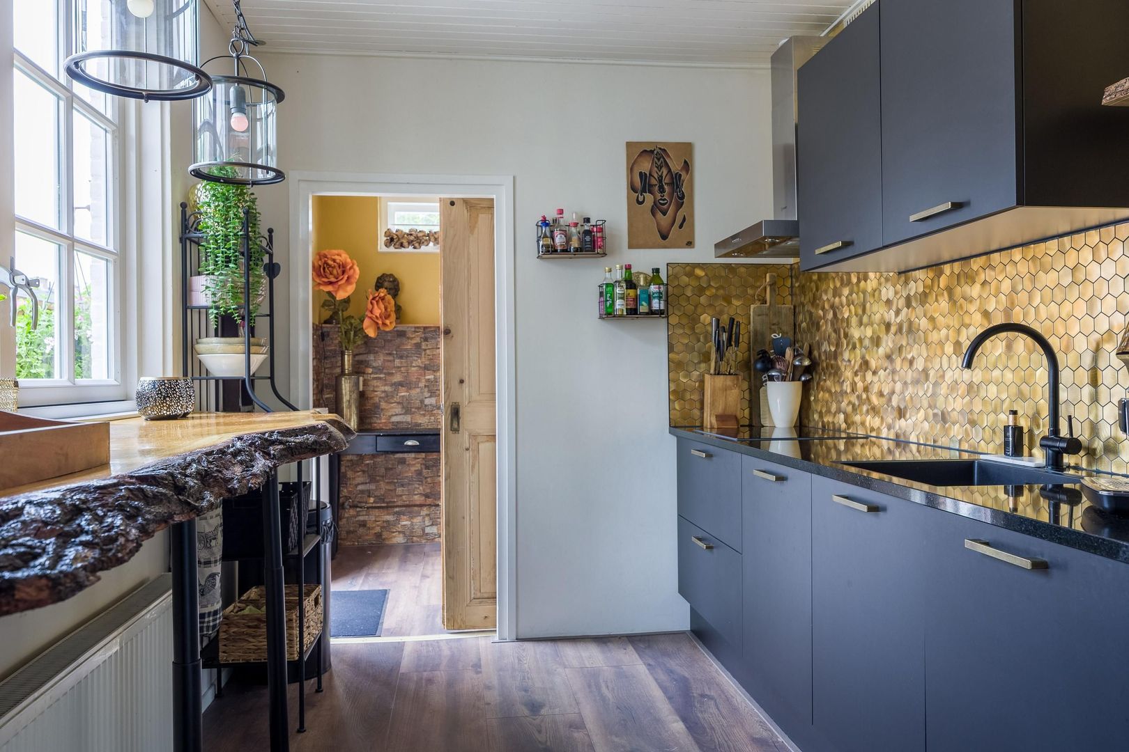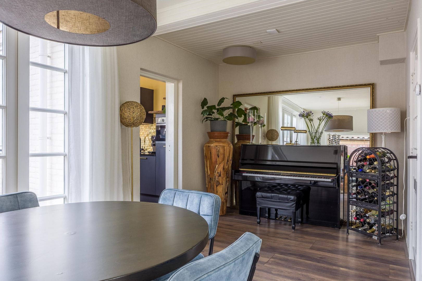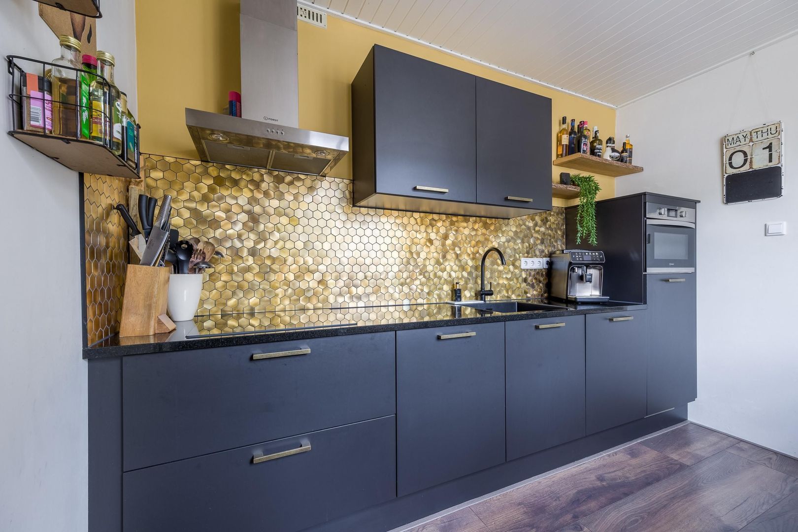 Vanuit de lichte doorzonwoonkamer, met een royale raampartij aan de voorzijde en openslaande deuren naar het terras, loopt binnen en buiten moeiteloos in elkaar over. De gesloten keuken, vernieuwd in 2022, is een echte blikvanger: de keukenopstelling is voorzien van moderne inbouwapparatuur en springt direct in het oog dankzij de stijlvolle achterwand. Een sfeervolle houten boomstambar maakt het geheel compleet. Direct aansluitend bevindt zich de praktische bijkeuken met witgoedaansluitingen en een extra toegang tot de achtertuin.