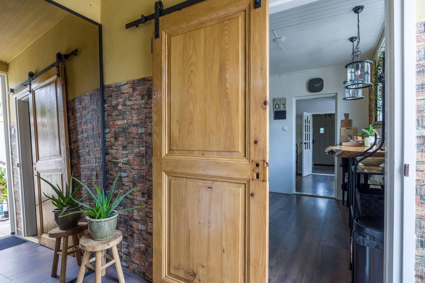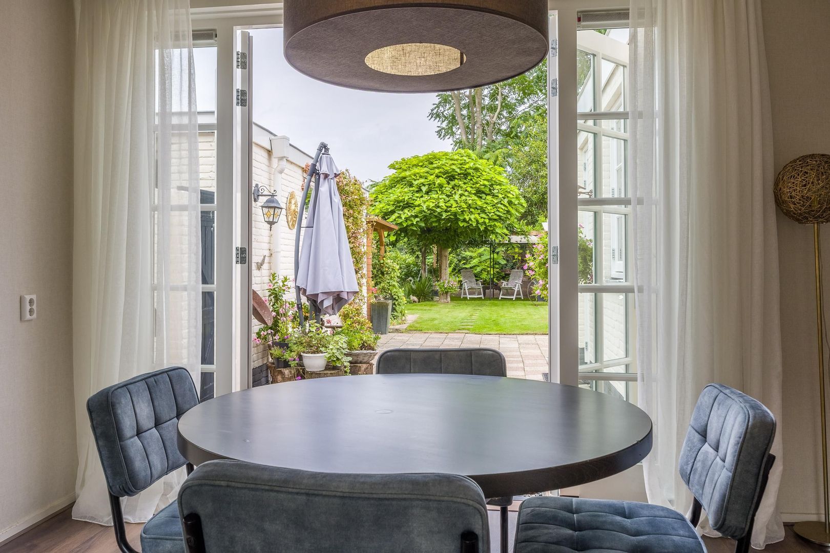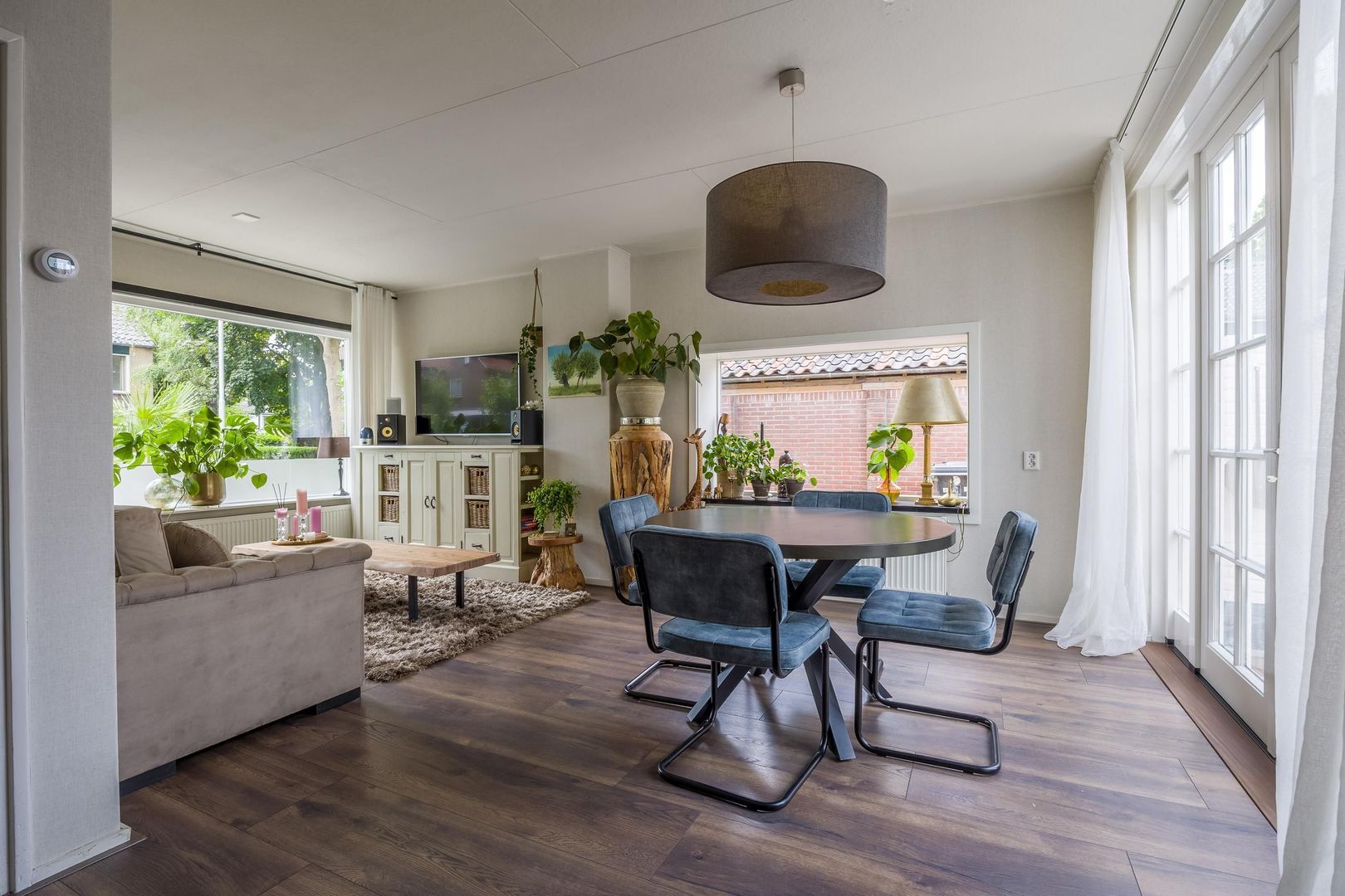 Vanuit de lichte doorzonwoonkamer, met een royale raampartij aan de voorzijde en openslaande deuren naar het terras, loopt binnen en buiten moeiteloos in elkaar over. De gesloten keuken, vernieuwd in 2022, is een echte blikvanger: de keukenopstelling is voorzien van moderne inbouwapparatuur en springt direct in het oog dankzij de stijlvolle achterwand. Een sfeervolle houten boomstambar maakt het geheel compleet. Direct aansluitend bevindt zich de praktische bijkeuken met witgoedaansluitingen en een extra toegang tot de achtertuin.