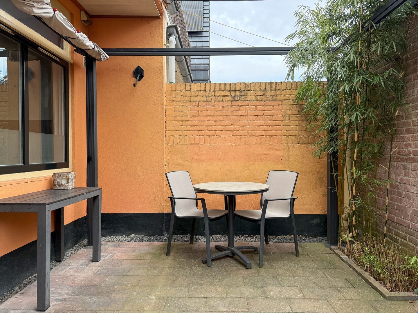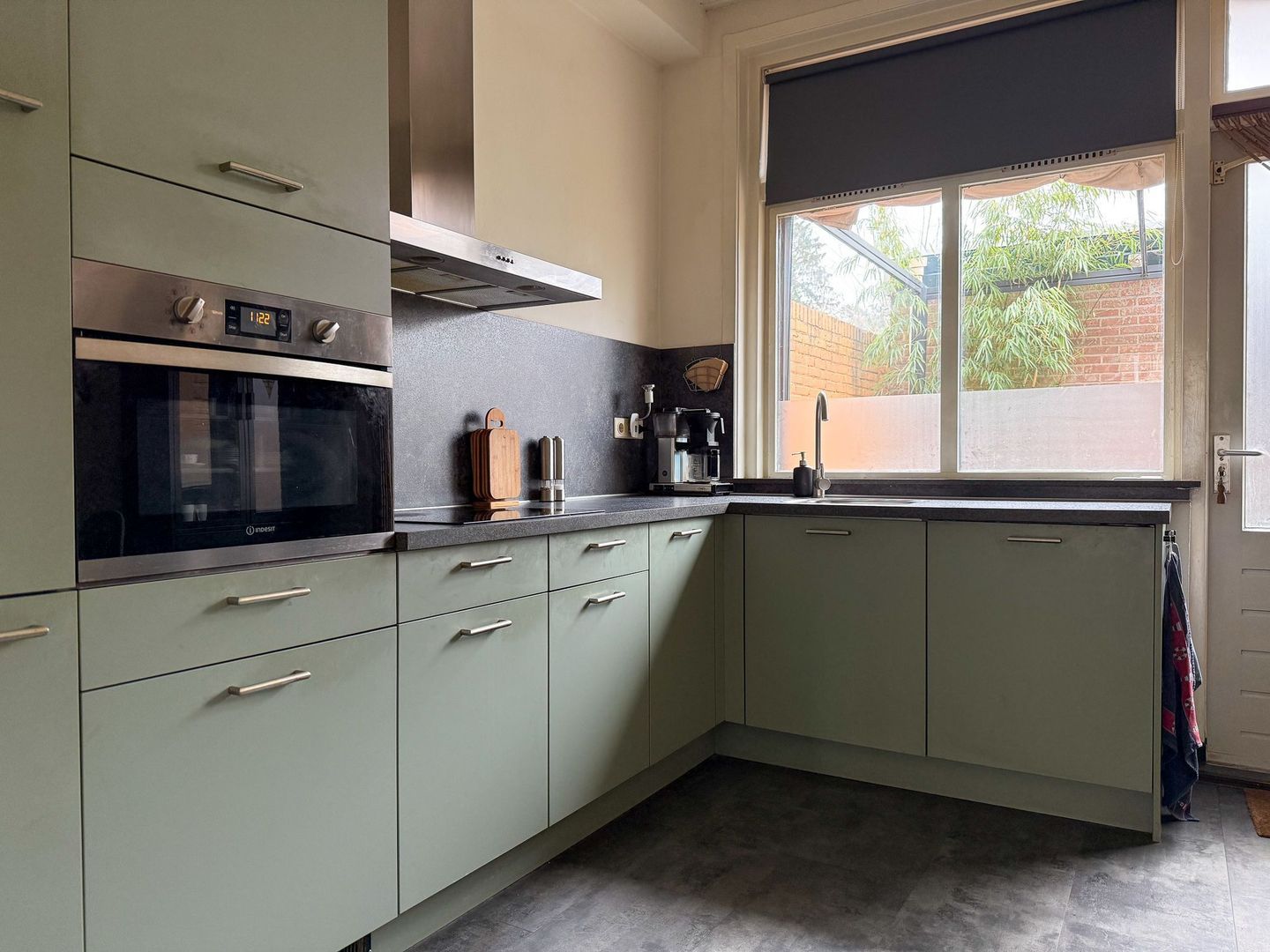 Aan de tuinzijde ligt de keuken, ingericht met een lichte hoekopstelling. Je hebt hier fijne werk- en kastruimte, zodat je makkelijk kunt koken en bakken. Vanuit de keuken loop je zo de achtertuin in. Op warme dagen zet je de deur open en loopt binnen en buiten naadloos in elkaar over: ontbijten in de tuin of ’s avonds nog even buiten eten aan de tuintafel.