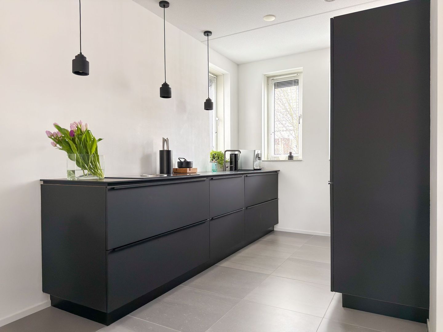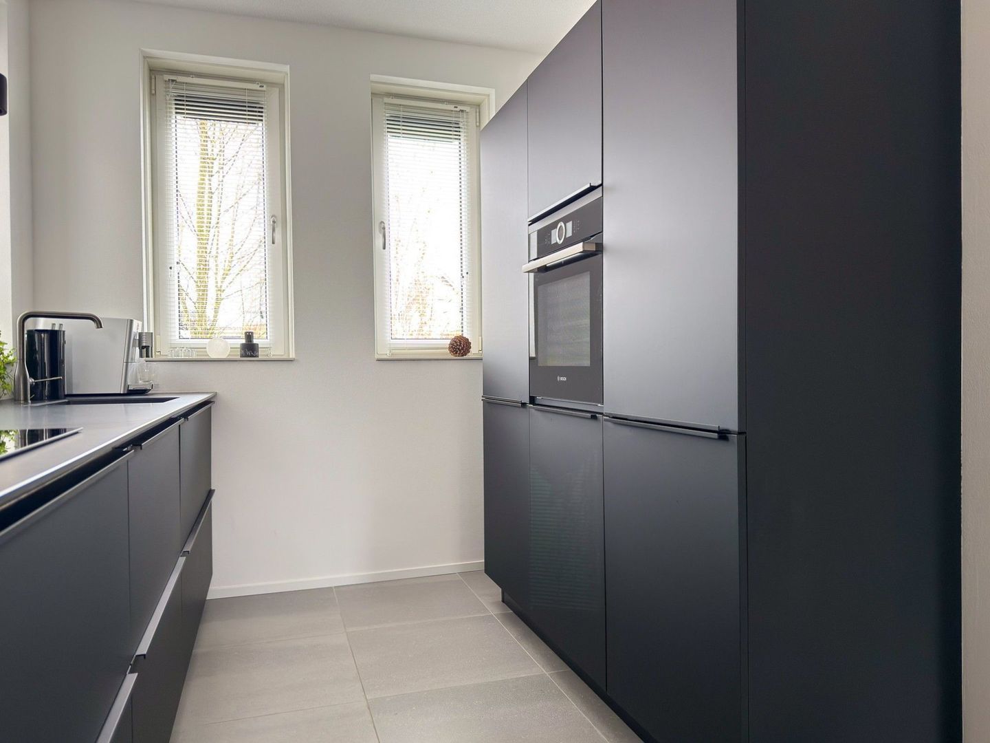De moderne keuken is uitgevoerd in een strakke zwarte kleurstelling en heeft een eigentijdse uitstraling. Het beschikt over voldoende werk- en kastruimte en is voorzien van diverse inbouwapparatuur. De keuken sluit mooi aan op de leefruimte en vormt een geheel met de rest van de begane grond.