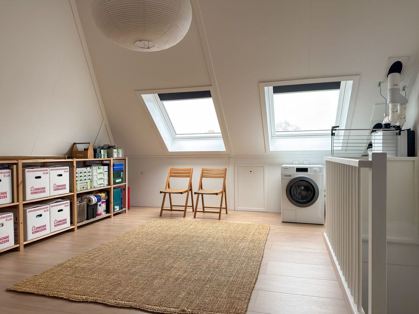 De tweede verdieping is een grote, open ruimte met veel mogelijkheden. Momenteel is deze ingericht als logeer- en bergruimte, maar je kunt hier eenvoudig een extra slaapkamer, werkplek of hobbyruimte realiseren. Dankzij de grote dakramen is ook deze verdieping prettig licht.