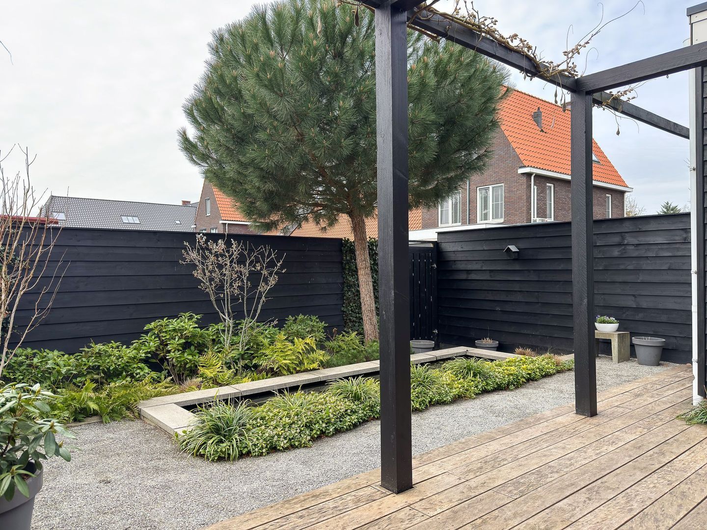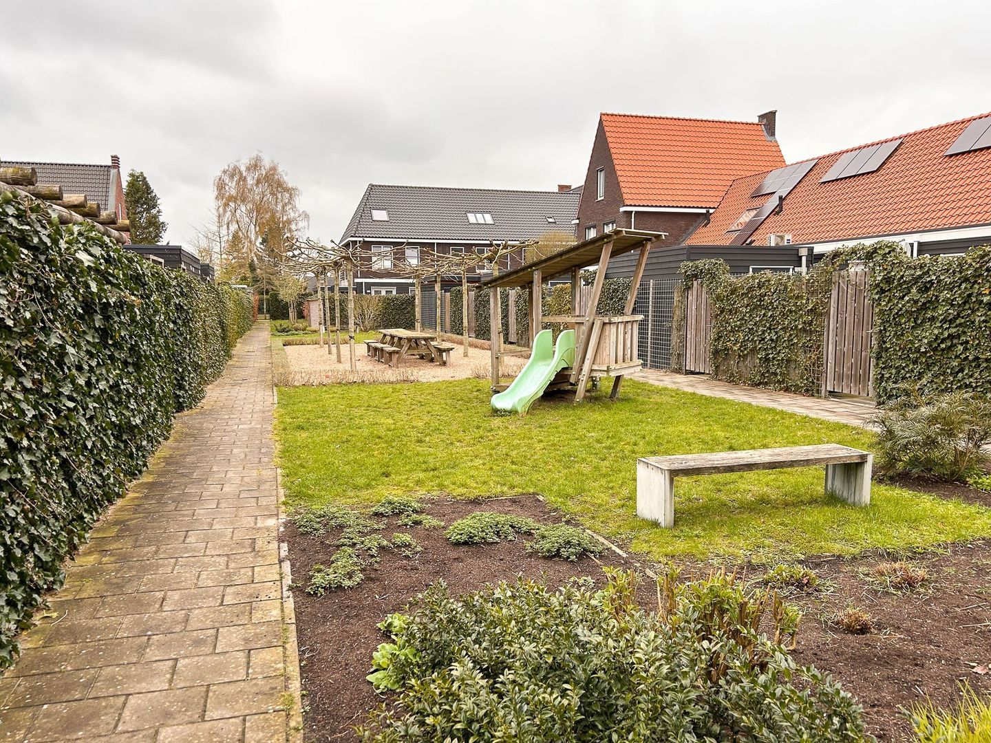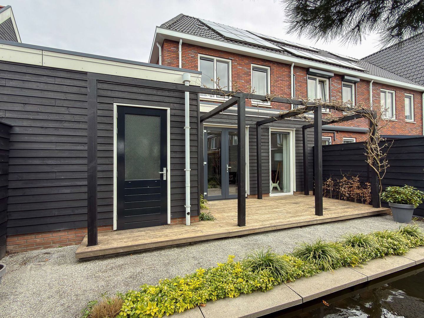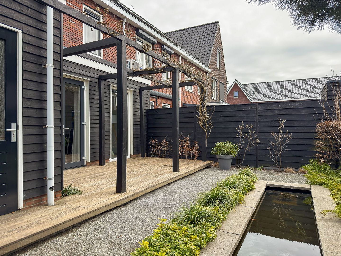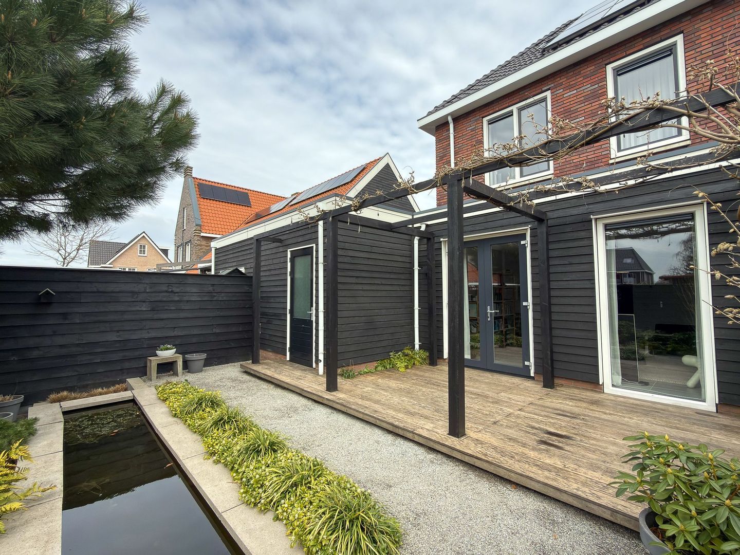 De achtertuin is fraai aangelegd en heeft een speels karakter door de hoogteverschillen en de aanwezigheid van een vijver. Er is een fijn terras gerealiseerd waar je heerlijk in de zon geniet. Het geheel is verzorgd en biedt een prettige balans tussen groen en gemak. De woning is daarnaast voorzien van 9 zonnepanelen en beschikt over een laadpaal voor een elektrische auto, wat het wooncomfort en de duurzaamheid extra versterkt.