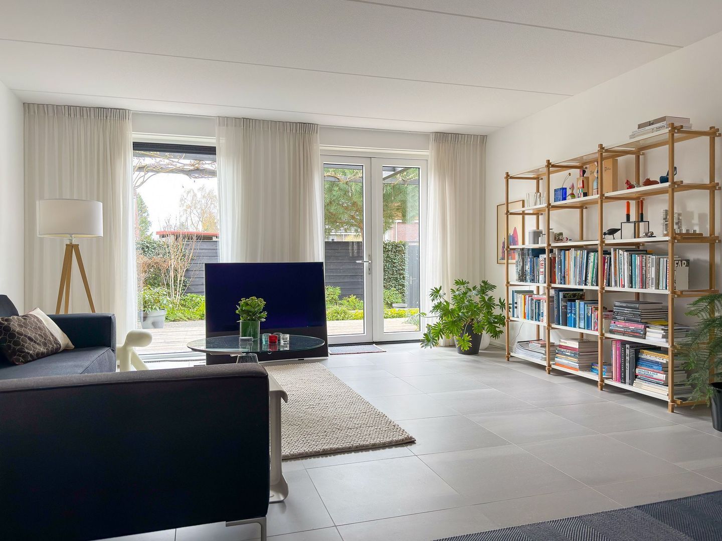 Je komt binnen in de hal met toegang tot het toilet, de meterkast en de trap naar de eerste verdieping. Vanuit de hal stap je de woonkamer in, waar de open en rustige sfeer direct opvalt. De ruimte voelt prettig aan en is makkelijk in te delen, of je nu houdt van een grote zithoek of juist een royale eettafel. De openslaande deuren zorgen voor een directe verbinding met de mooie tuin, waar je op het vlonderterras heerlijk van een kop koffie of een maaltijd geniet. Handig is ook de extra bergruimte in de woonkamer, waar je spullen netjes uit het zicht kunt opbergen en voorraad kunt bewaren.