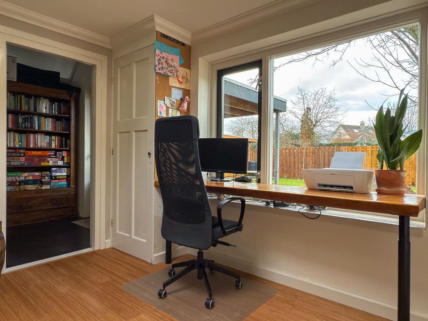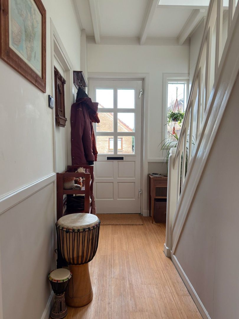 Aangrenzend vind je een werkkamer, ideaal als thuiswerkplek. Ook is hier de cv-opstelling te vinden, netjes weggewerkt in een kast. Via de werkkamer kom je in de ruime hal aan de achterzijde met veel opbergruimte. Daarachter ligt de royale badkamer met ligbad, zeer ruime douchecabine en een wastafelmeubel. Het wonen op de begane grond is hier dus comfortabel en praktisch ingericht, met meerdere vertrekken die je voor verschillende doeleinden kunt gebruiken.
