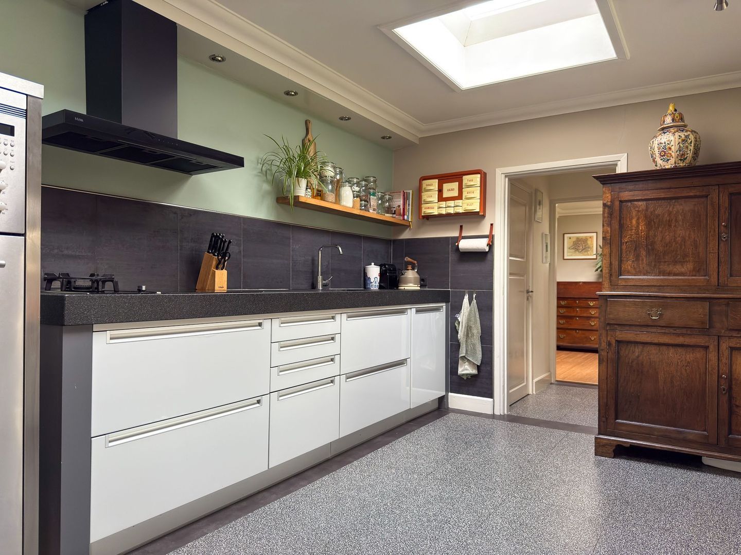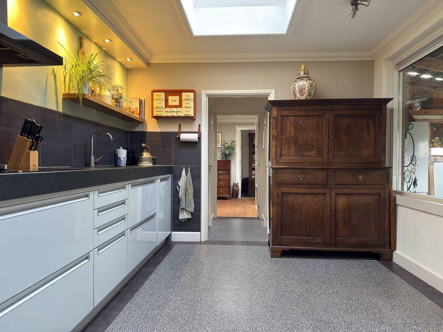 Vanuit de woonkamer loop je door naar de lichte keuken, die is voorzien van twee lichtkoepels. Achter de keuken bevindt zich een tweede hal met het toilet en een apart washok met aansluitingen voor wasmachine en droger. Vanuit de keuken heb je toegang tot een van de aangebouwde overkappingen aan de woning en de achtertuin.