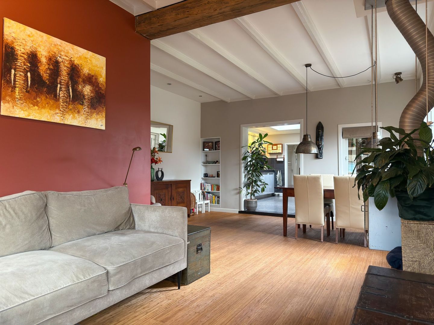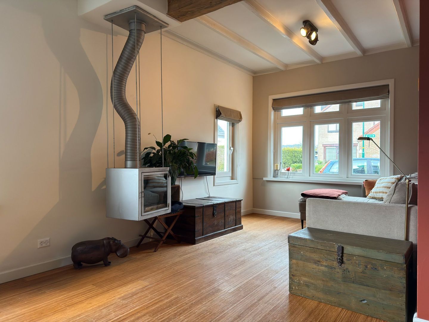 Je komt binnen in de hal met toegang tot de lichte woonkamer en de trap naar de bovenverdieping. Vanuit de hal loop je de karakteristieke woonkamer met haard en balkenplafond in. De woonkamer is van mooi formaat en biedt voldoende ruimte voor zowel een zitgedeelte als een eettafel. De vele ramen maken het naast sfeervol ook heerlijk licht, ideaal als je aan de tafel zit te hobbyen, huiswerk maakt of een boek leest bij de open haard.