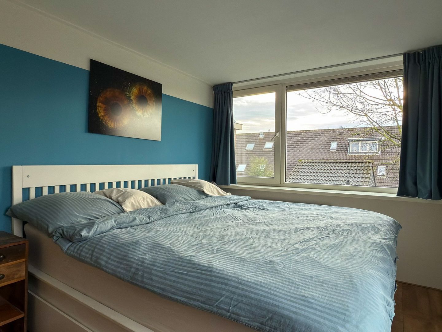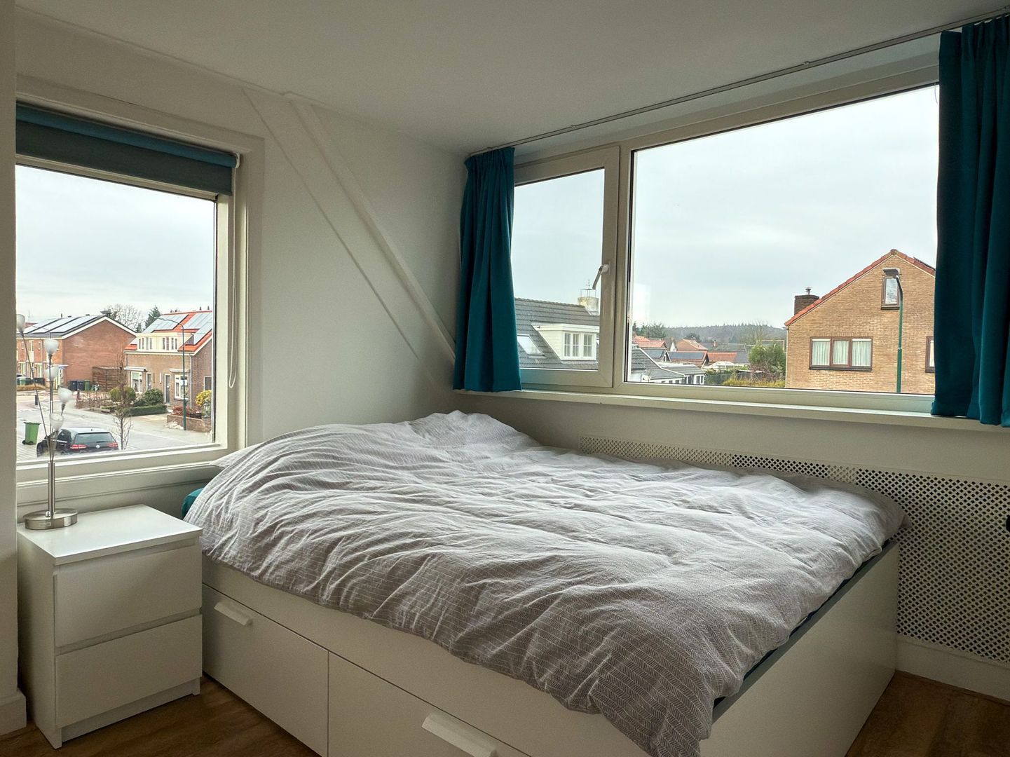 Als je de trap oploopt naar de eerste verdieping, word je aangenaam verrast door de hoeveelheid lichtinval die door het grote dakraam naar binnen valt. Op deze verdieping zijn drie lichte slaapkamers gerealiseerd. Aan de voorzijde, met uitzicht op de Utrechtse Heuvelrug, ligt een slaapkamer. Aan de achterzijde liggen de andere twee slaapkamers waaronder de ouderslaapkamer.