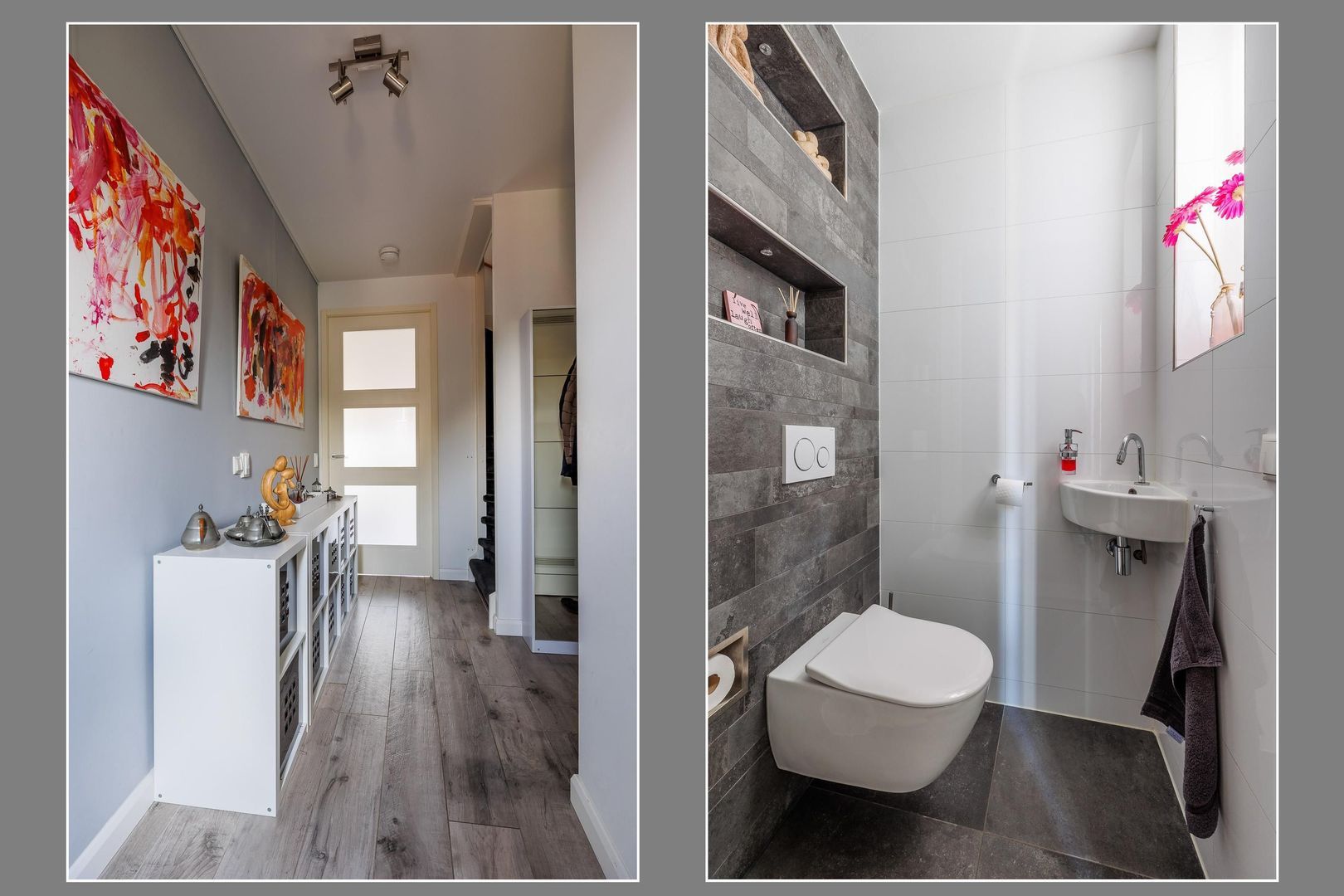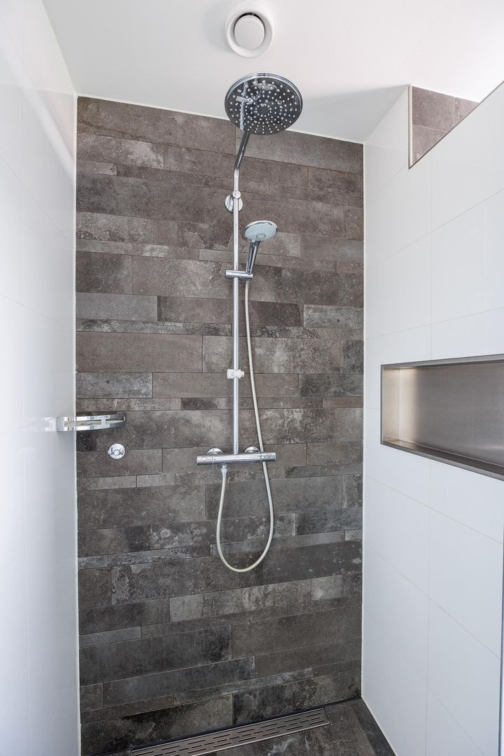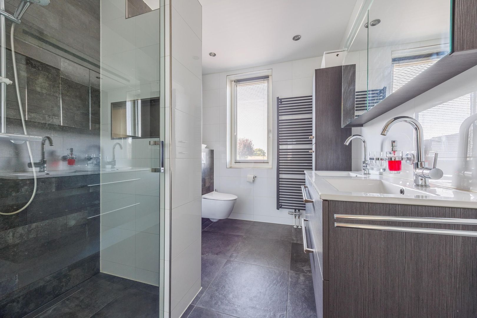 Op de eerste verdieping bevinden zich drie royale slaapkamers en een moderne badkamer. De slaapkamer aan de voorzijde is uitgerust met een airco, wat zorgt voor extra comfort in warme periodes. De badkamer heeft een strakke uitstraling en is voorzien van een douche, dubbele wastafelmeubel en toilet.