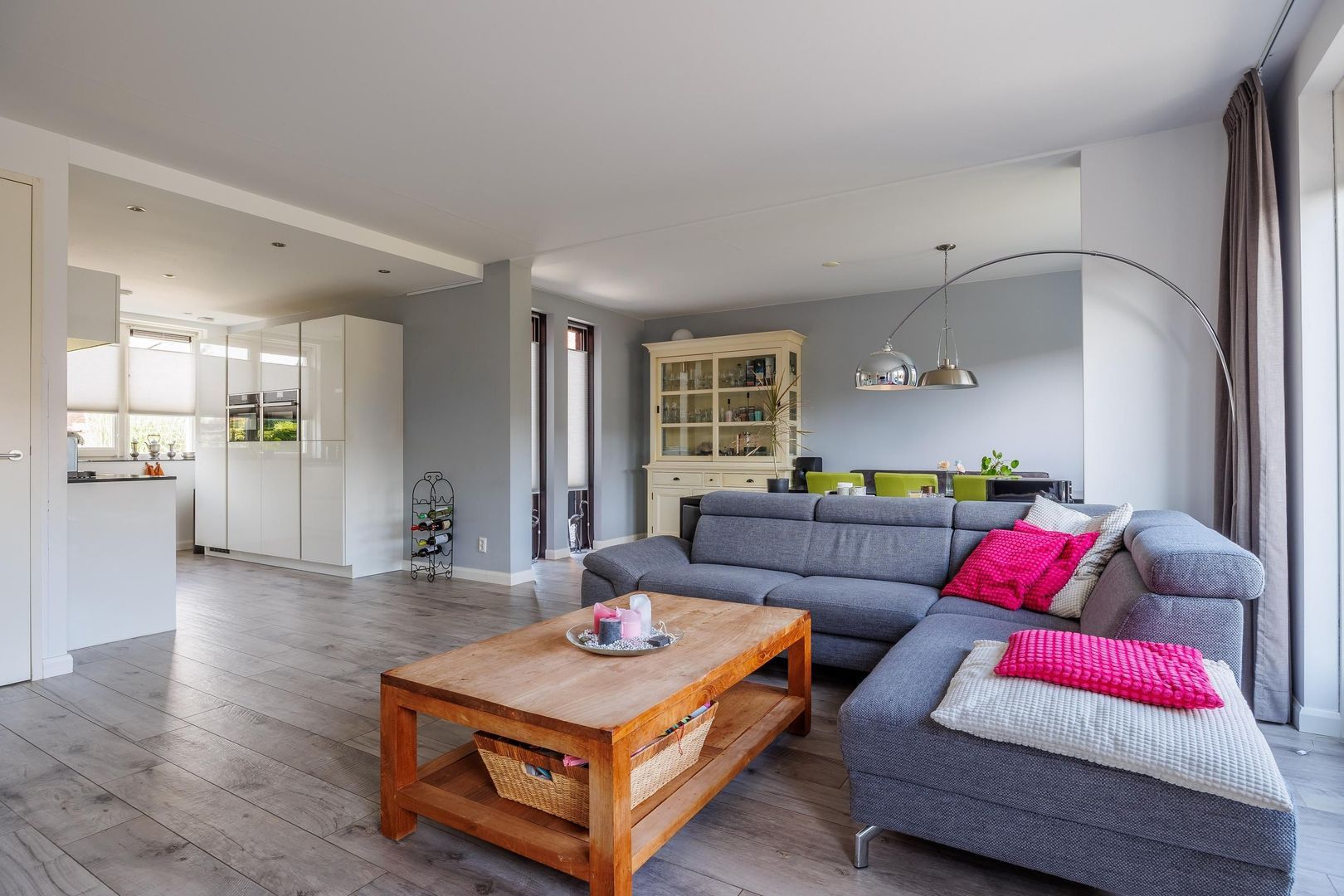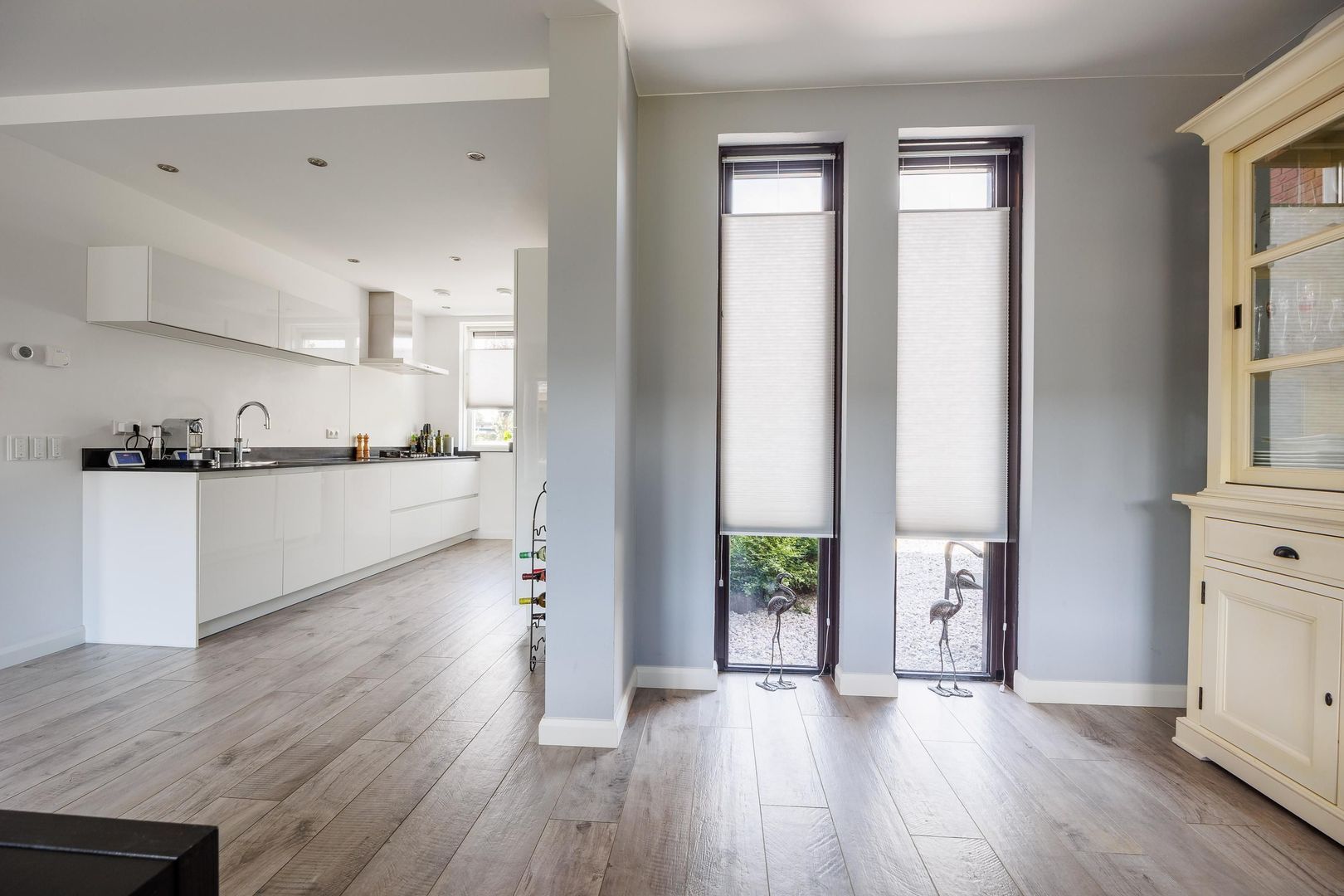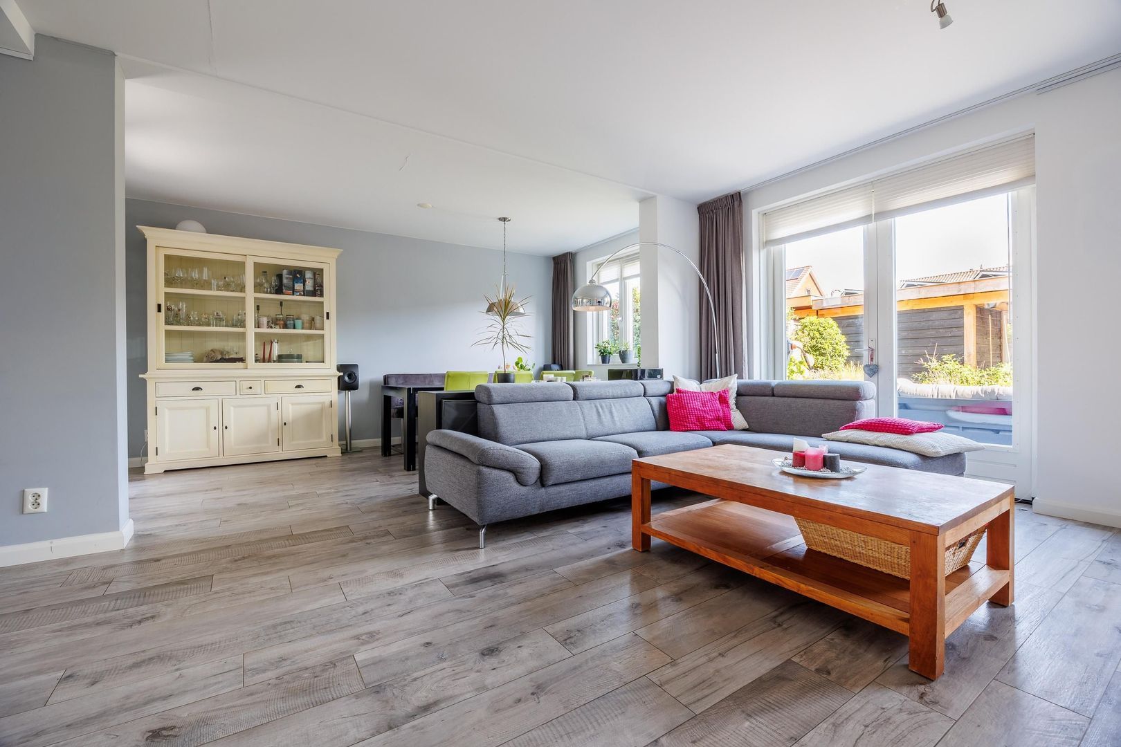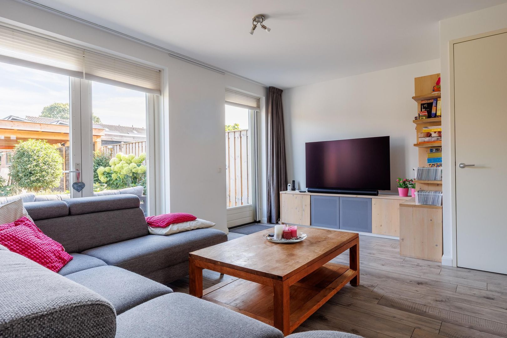De woonkamer voelt ruim en uitnodigend aan, met een mooie verdeling tussen de zithoek en de eethoek. Dankzij de openslaande deuren loopt de leefruimte naadloos over in de tuin, waardoor er een fijne verbinding ontstaat tussen binnen en buiten. De open keuken is eigentijds en slim opgezet, verdeeld in twee delen zodat er volop werk- en bergruimte aanwezig is. Hier wordt koken niet alleen praktisch, maar ook gezellig.