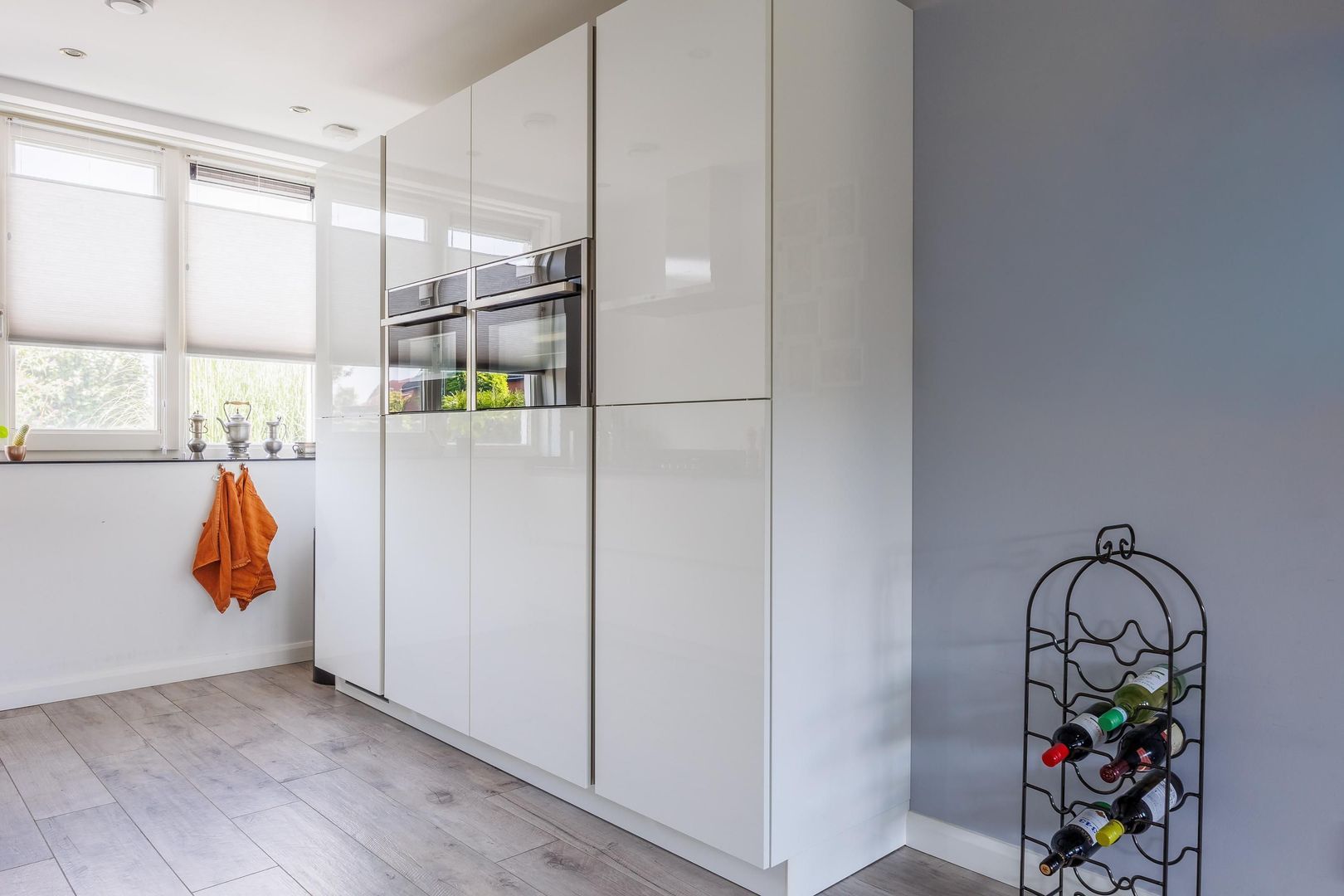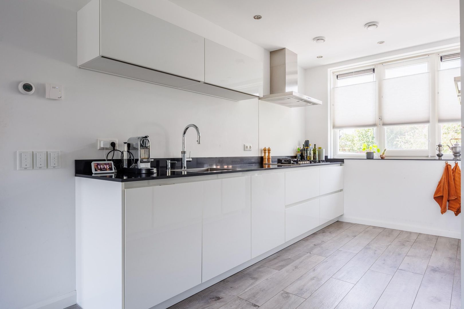 Je stapt binnen in een ruime hal met toilet, meterkast en toegang tot de woonkamer. De woonkamer is tuingericht en loopt vloeiend over naar de open keuken met een royale keukenopstelling. De opstelling is voorzien van een 5-pits gasfornuis, afzuigkap, Quooker, oven inclusief magnetron, oven inclusief stoomfunctie, vaatwasser en koelkast.