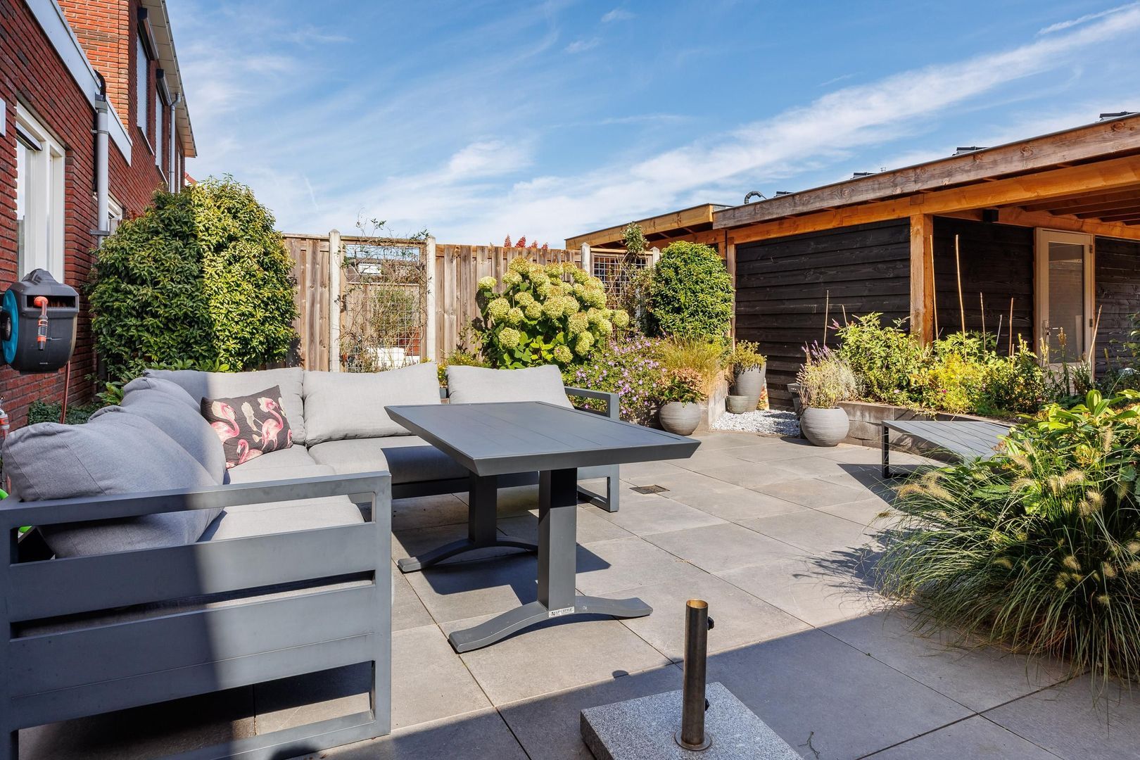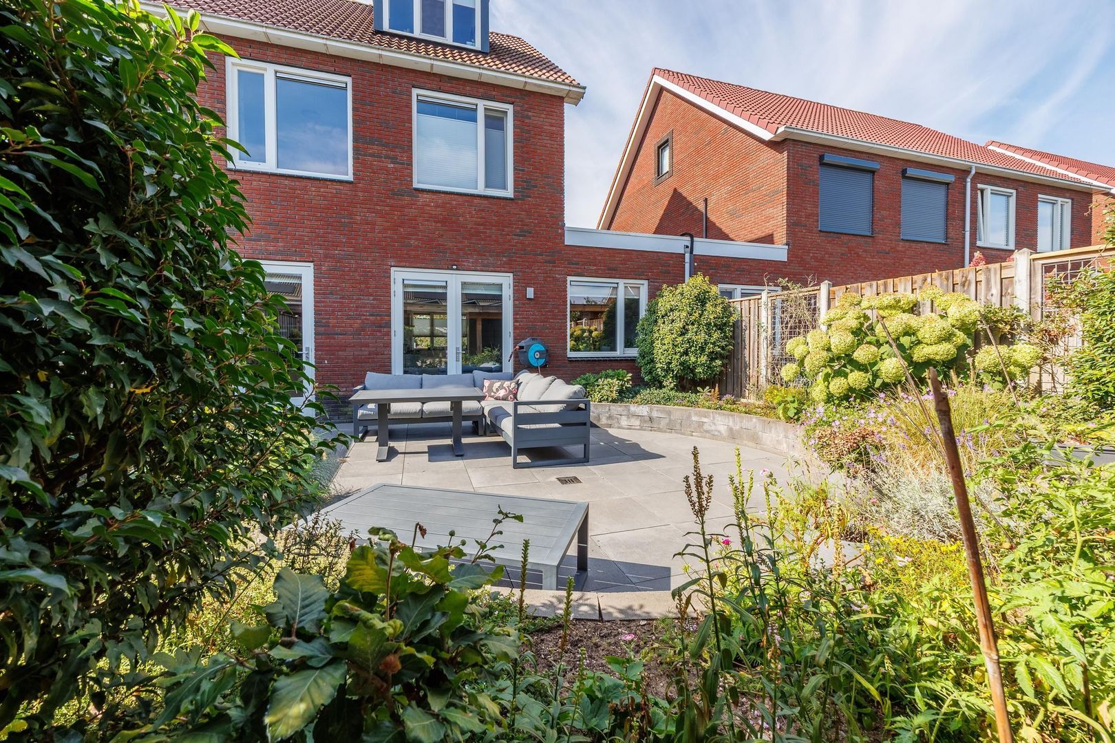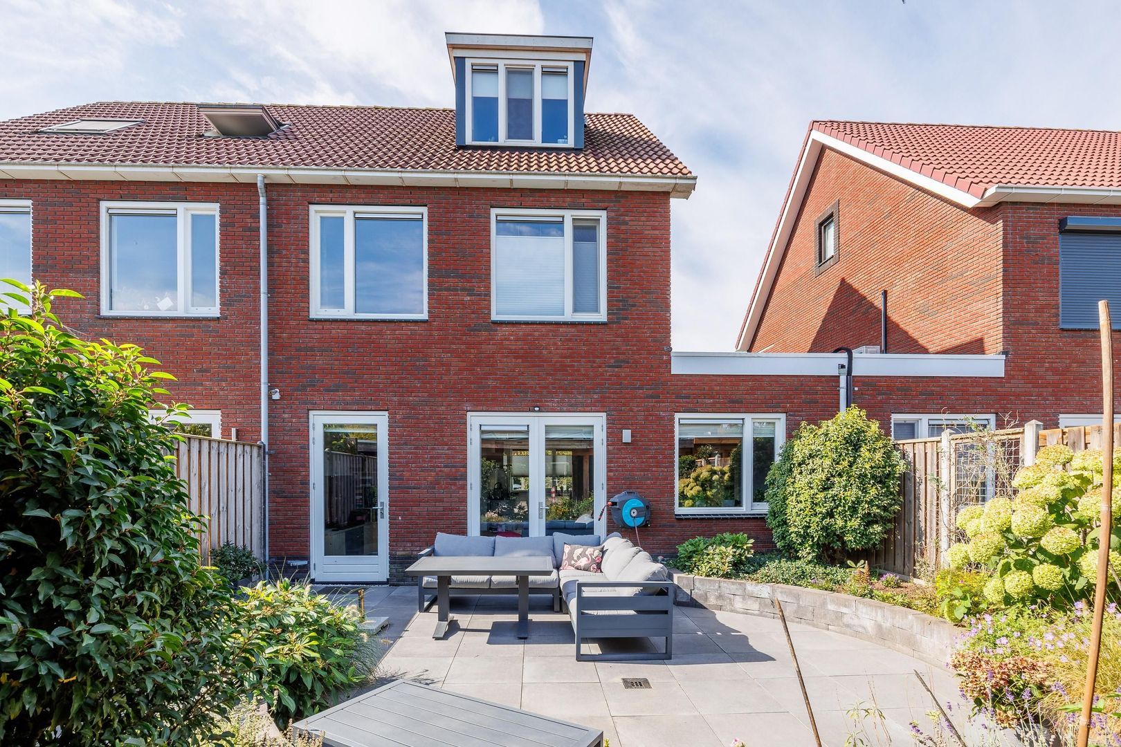 De achtertuin, gelegen op het noordoosten, is een heerlijke plek om te ontspannen. Het grote terras is perfect voor lange zomeravonden met vrienden en familie. De groene borders rondom zorgen voor een sfeervolle, natuurlijke uitstraling. Achter op het perceel vind je de carport en een praktische berging, waardoor parkeren en extra opslagruimte geen enkel probleem zijn.