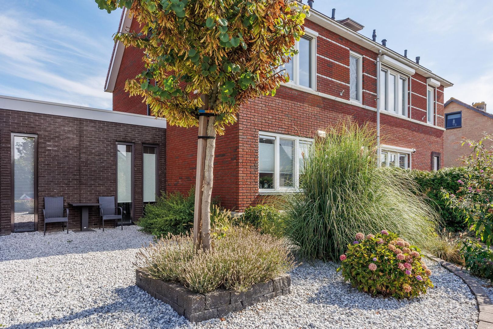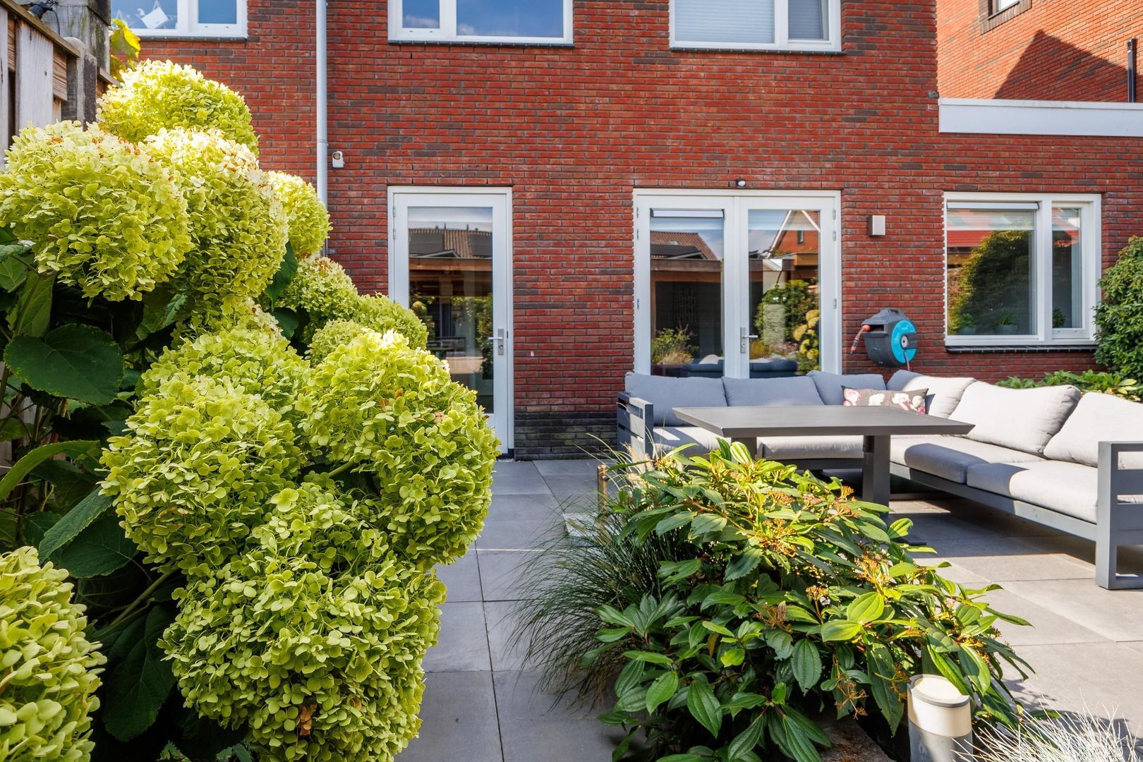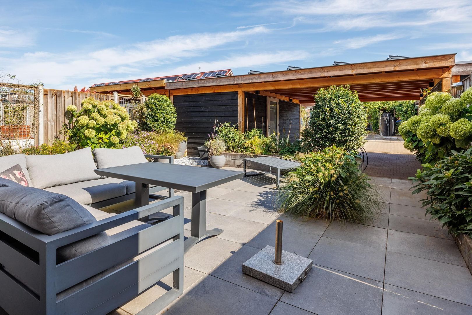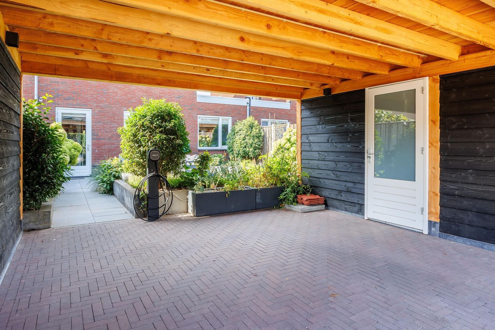 De achtertuin, gelegen op het noordoosten, is een heerlijke plek om te ontspannen. Het grote terras is perfect voor lange zomeravonden met vrienden en familie. De groene borders rondom zorgen voor een sfeervolle, natuurlijke uitstraling. Achter op het perceel vind je de carport en een praktische berging, waardoor parkeren en extra opslagruimte geen enkel probleem zijn.