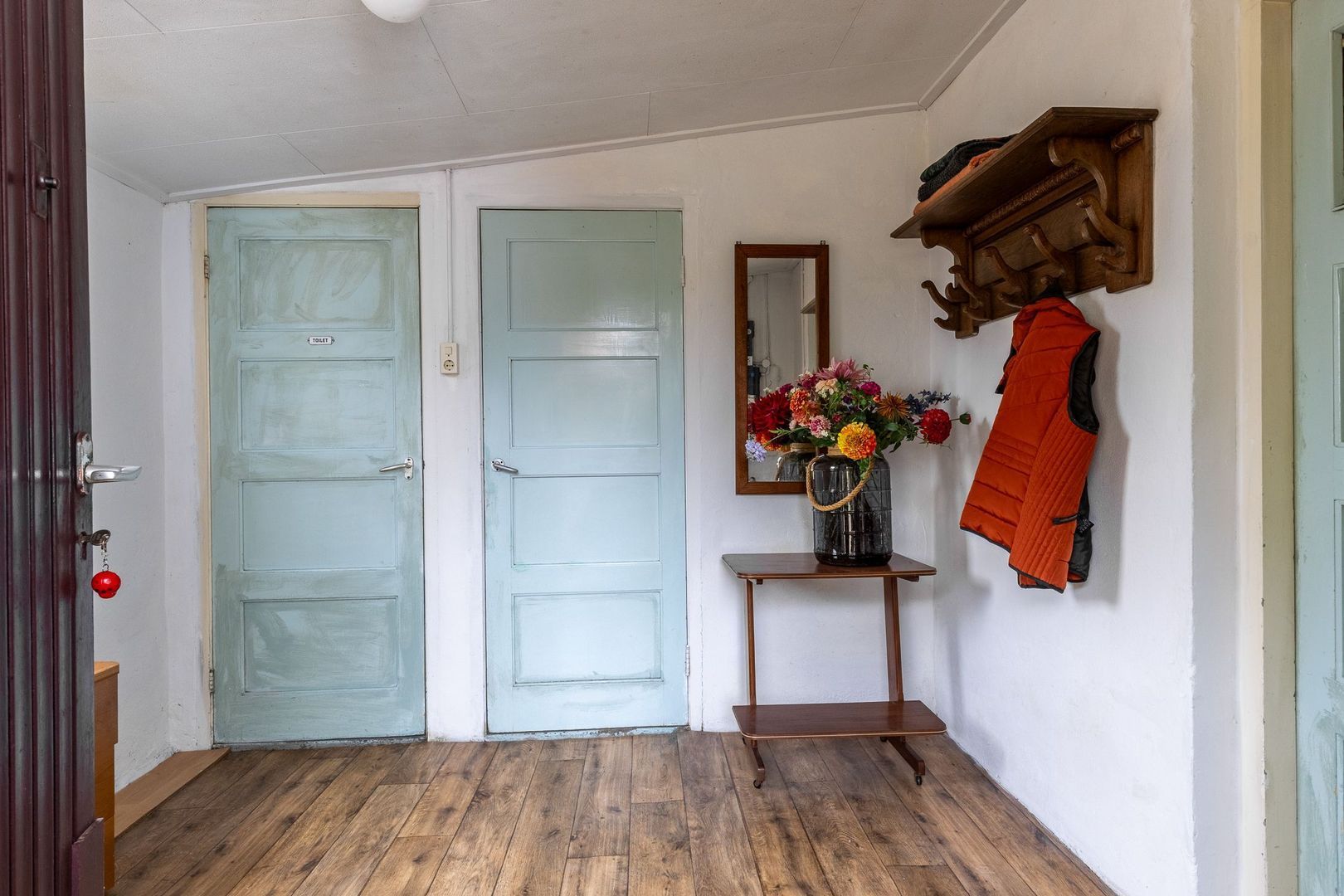 Je stapt binnen in de hal met garderobe en toegang tot de toiletruimte, doucheruimte en keuken. De gesloten keuken heeft een eenvoudige keukenopstelling. Vervolgens kom je in de woonkamer, door de en suitedeuren is deze opgesplitst in een woon- en eetkamer. Vanuit de eetkamer kom je in een apart kamer, nu in gebruik als slaapkamer. In deze kamer is er een luik naar de kelder, deze heeft geen stahoogte.