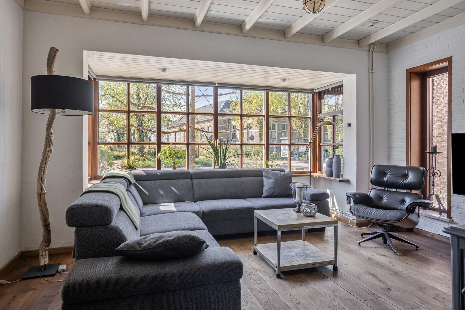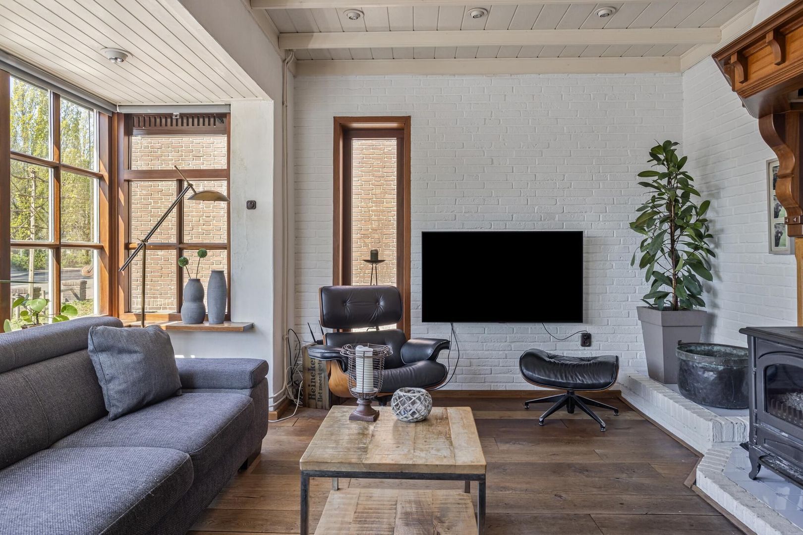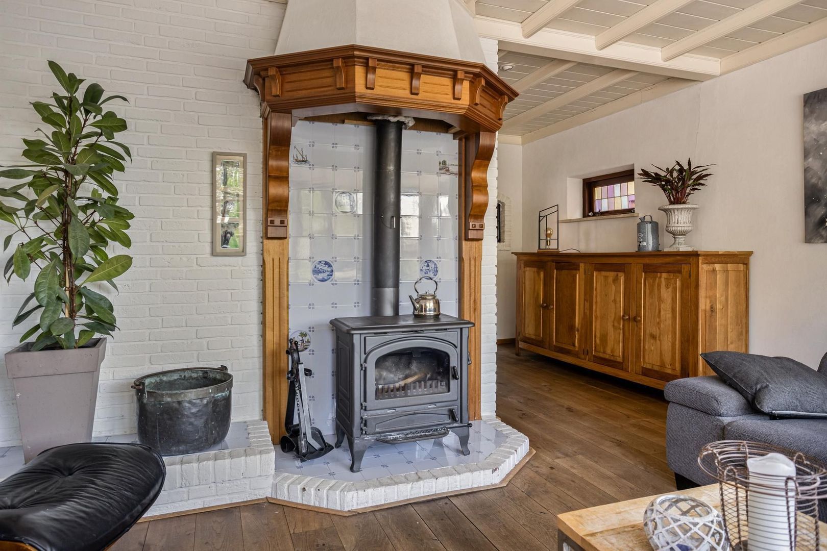 De woonkamer is een fijne ruimte om te ontspannen na een lange dag en om in de winterse maanden bij de houtkachel te vertoeven.