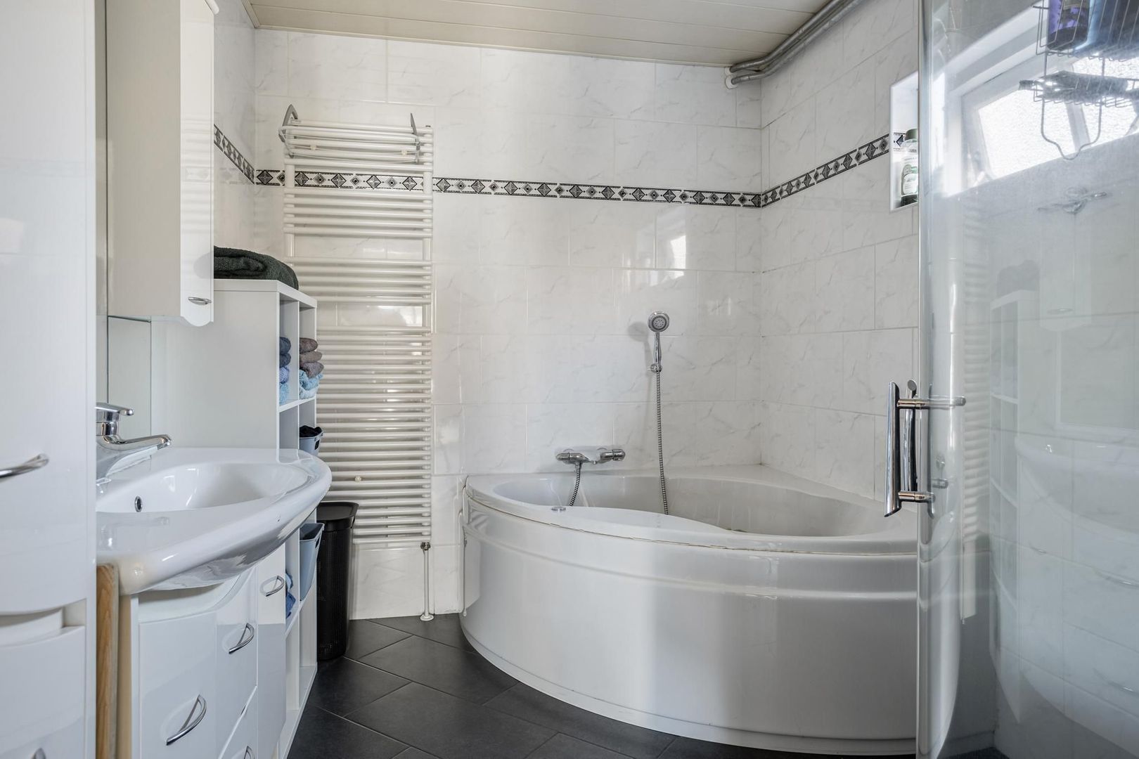 Aansluitend vanuit de keuken is aan de achterzijde een hal gelegen die toegang verleend tot onder andere het toilet met fontein, kastruimte met opstelling witgoedapparatuur en de badkamer met ligbad/ whirlpool, douche, wastafelmeubel, badkamerkast en designradiator.