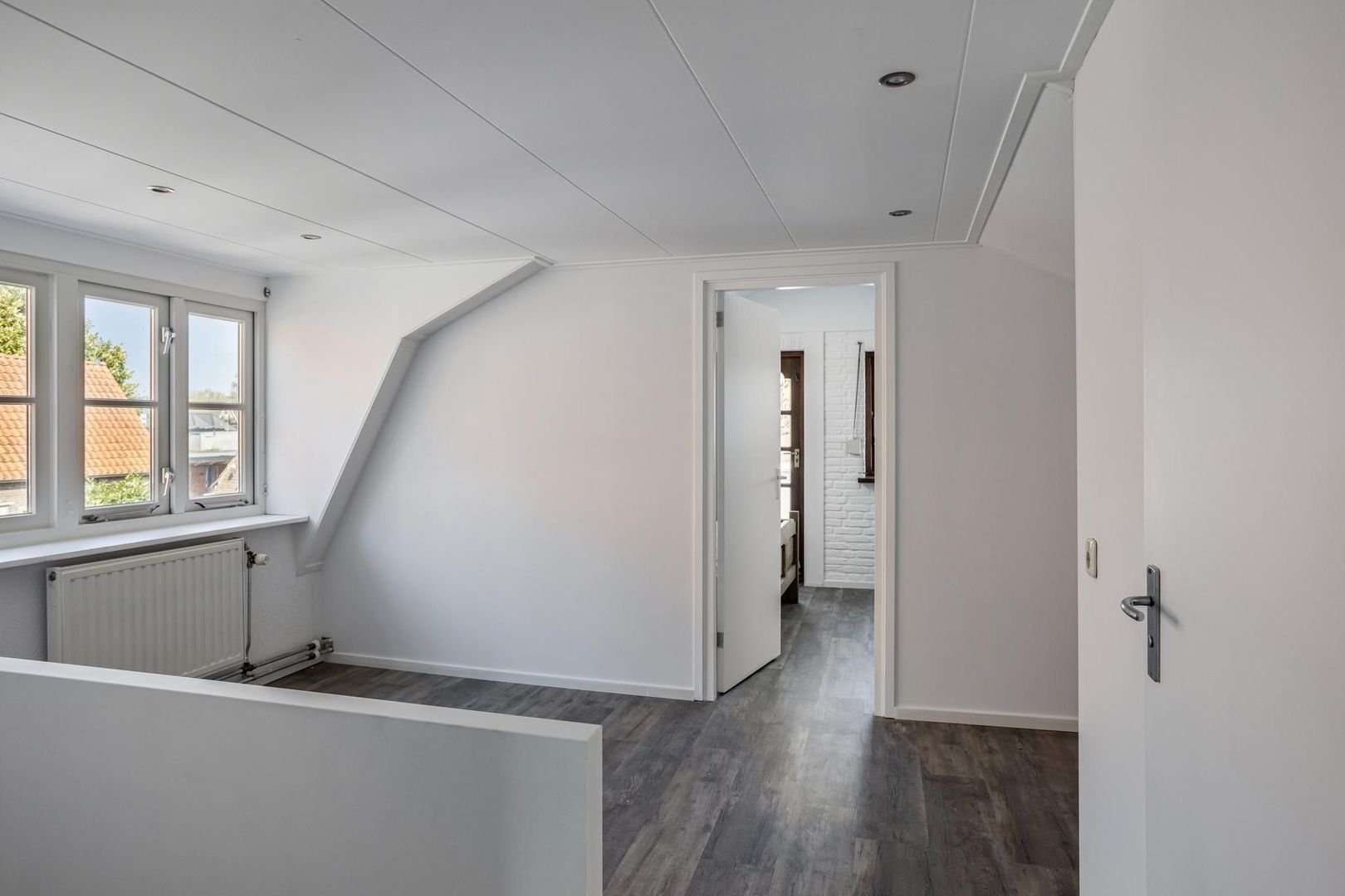 1e verdieping: via de trap bij de entree is de eerste verdieping te bereiken. Ruime overloop met dakkapel en eventueel de mogelijkheid om een extra kamer/ werkruimte te creëren. Toilet met fontein. Twee slaapkamers waarvan één aan de voorzijde en één aan de achterzijde.
