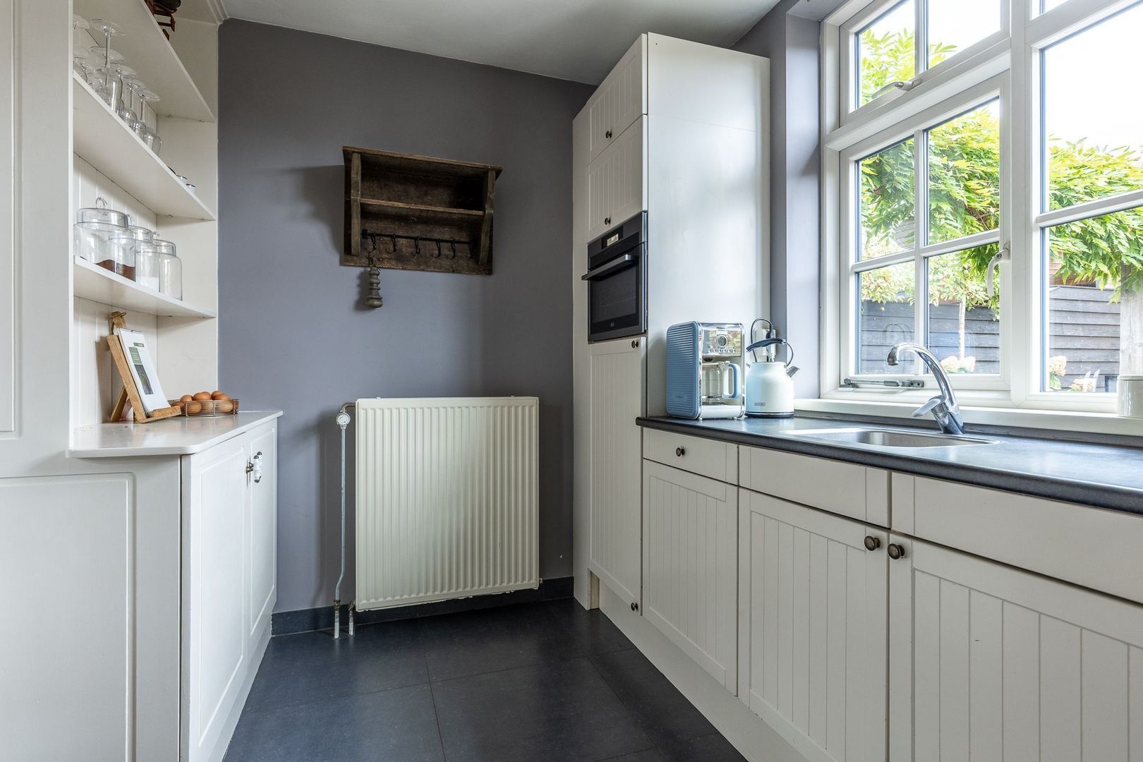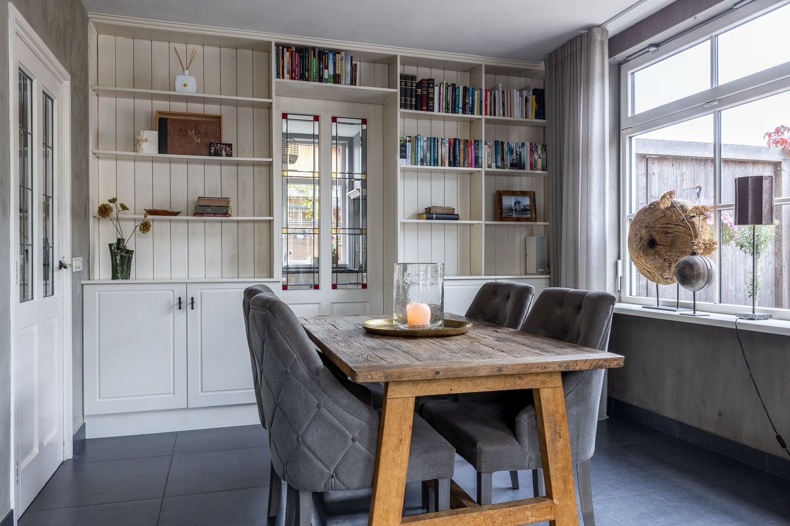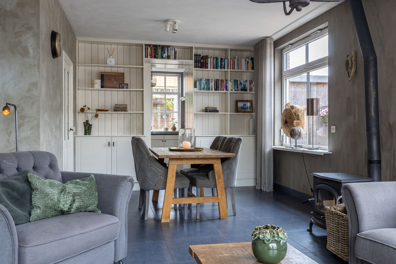 De woonkamer grenst aan de gesloten keuken, gescheiden door een prachtige houten boekenkast met glas-in-lood schuifdeur — een uniek detail dat perfect past bij het karakter van de woning. De keuken in lichte houttint is voorzien van diverse inbouwapparatuur en een breed werkblad met veel daglicht.