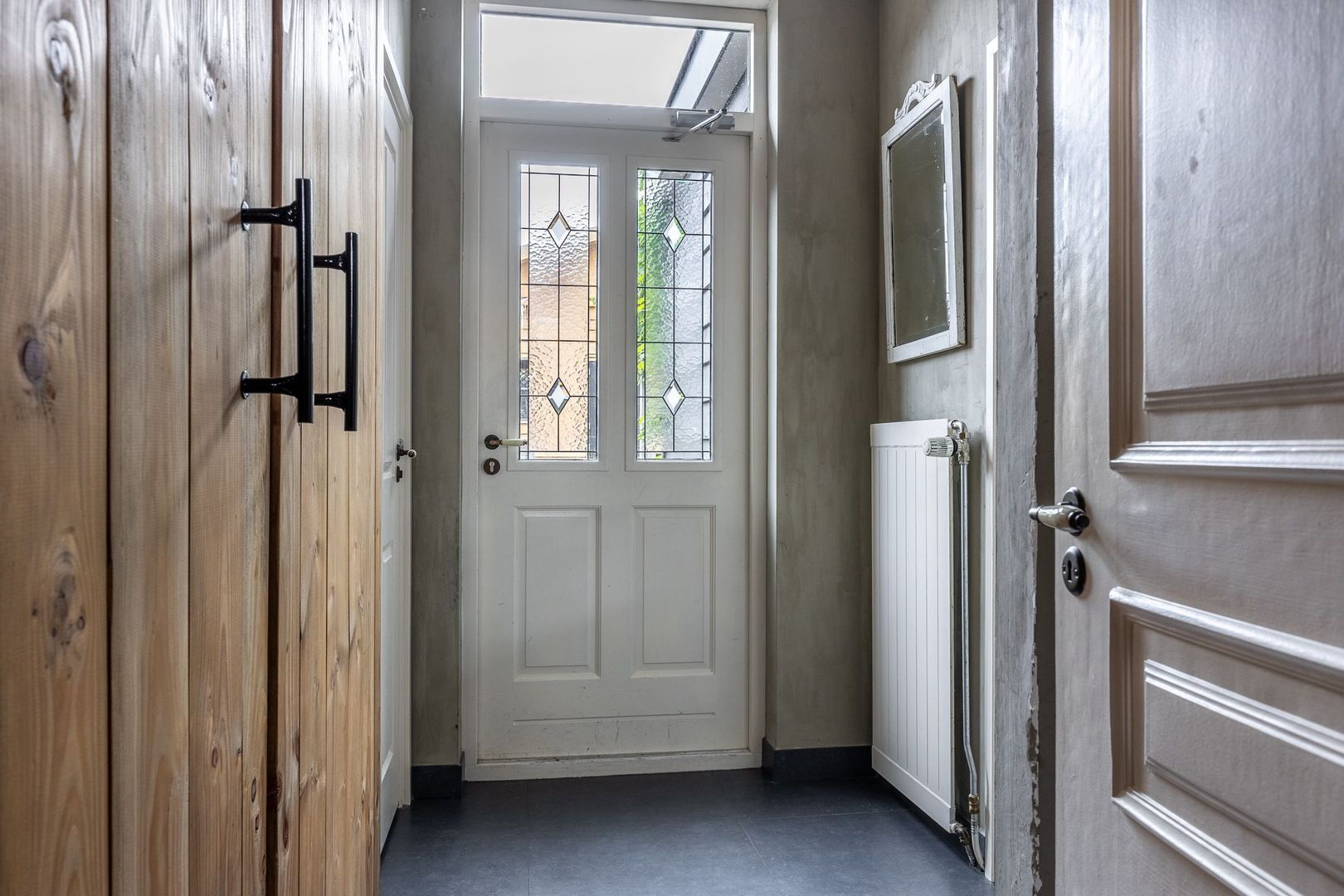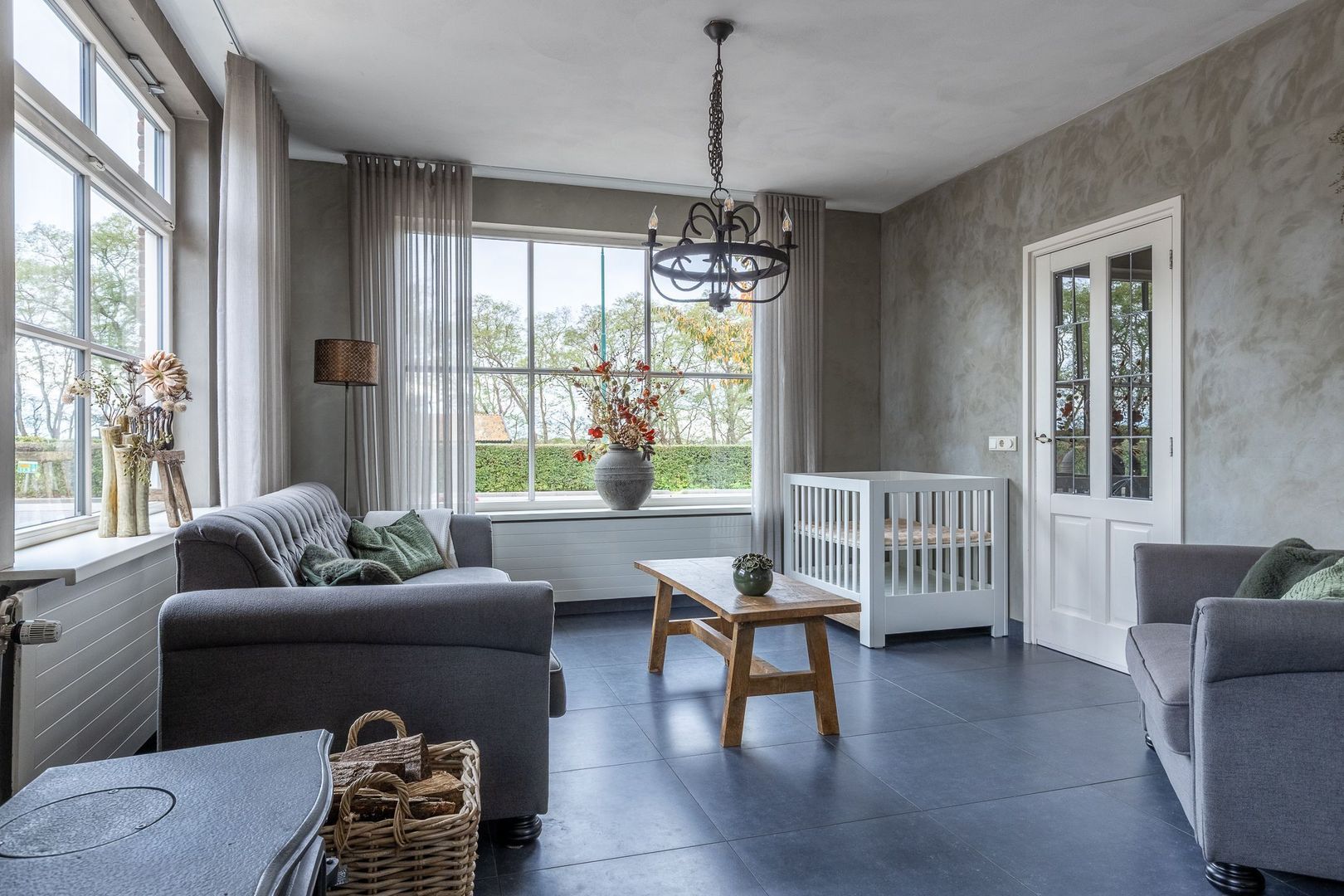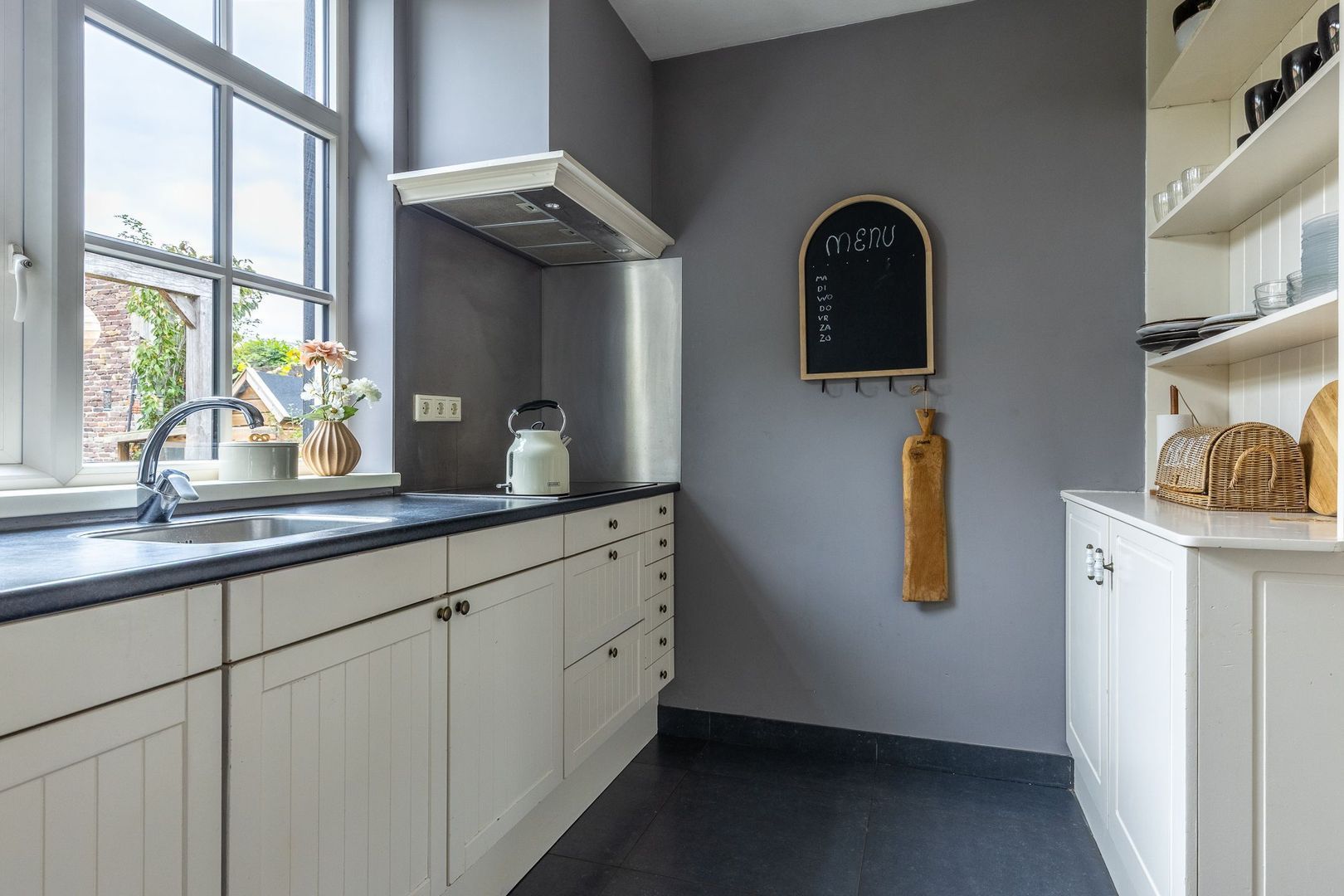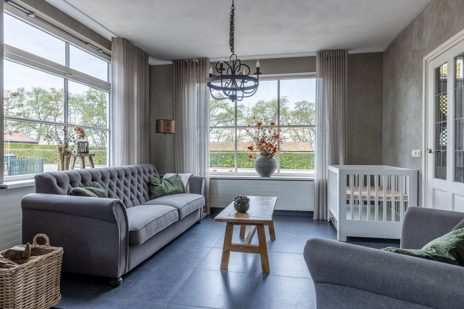 De woonkamer grenst aan de gesloten keuken, gescheiden door een prachtige houten boekenkast met glas-in-lood schuifdeur — een uniek detail dat perfect past bij het karakter van de woning. De keuken in lichte houttint is voorzien van diverse inbouwapparatuur en een breed werkblad met veel daglicht.