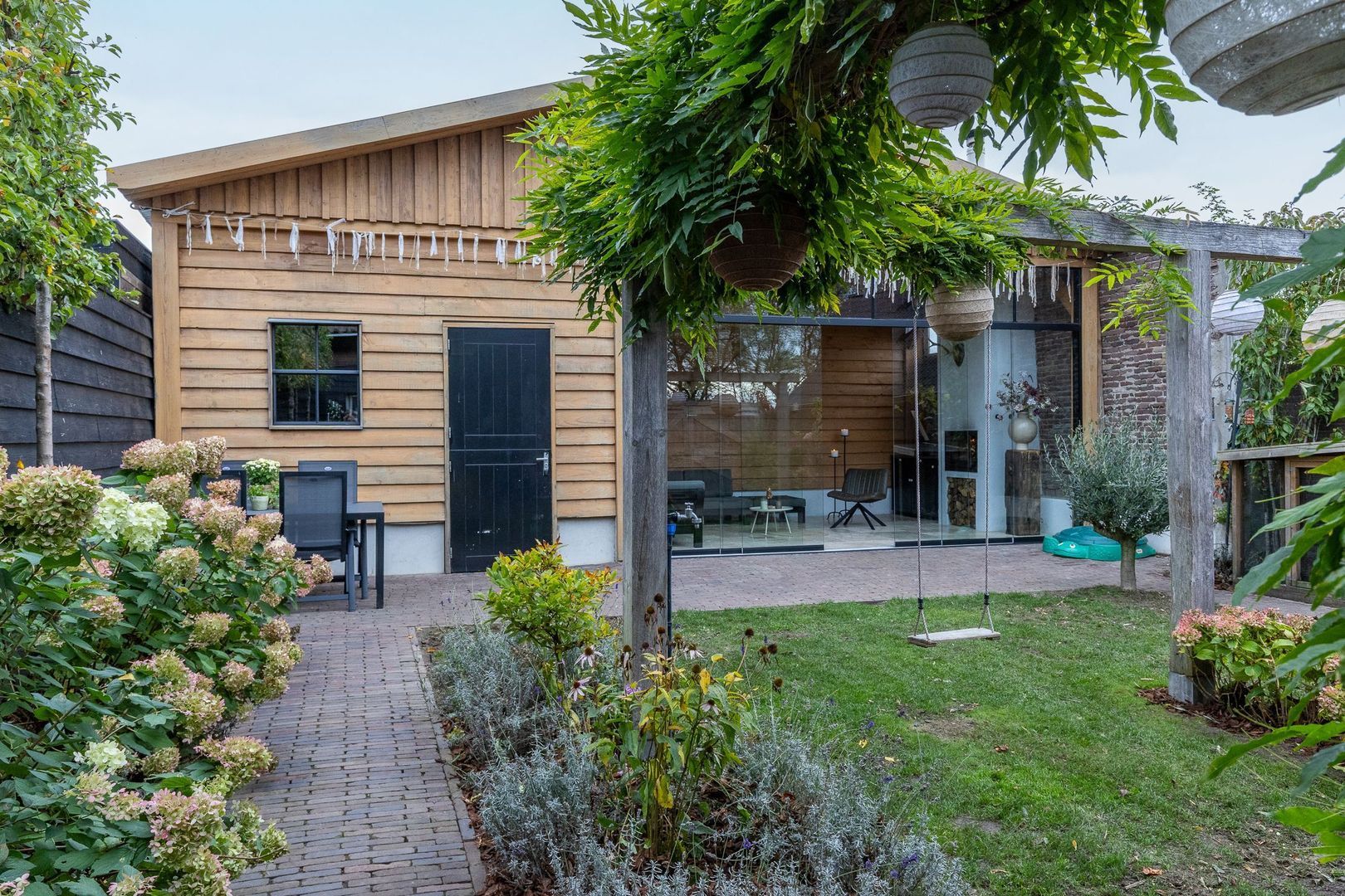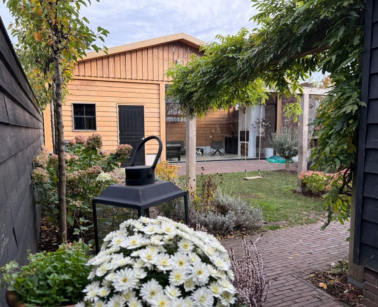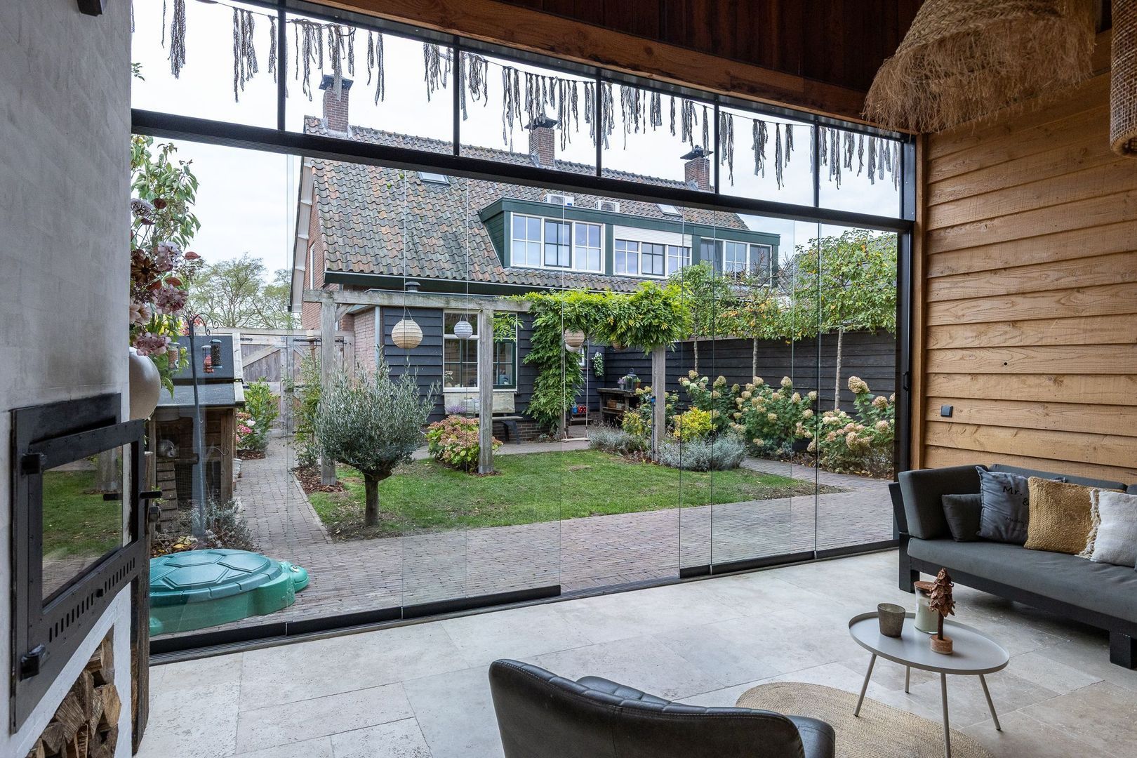 De tuin is een waar pareltje: sfeervol aangelegd met groen, terras en een royale veranda met aangrenzende schuur. De veranda is een heerlijke plek om het hele jaar door te genieten — met een houtkachel, keukenblok en glazen schuifpui is het dé ideale plek voor lange zomeravonden of knusse winterdagen.