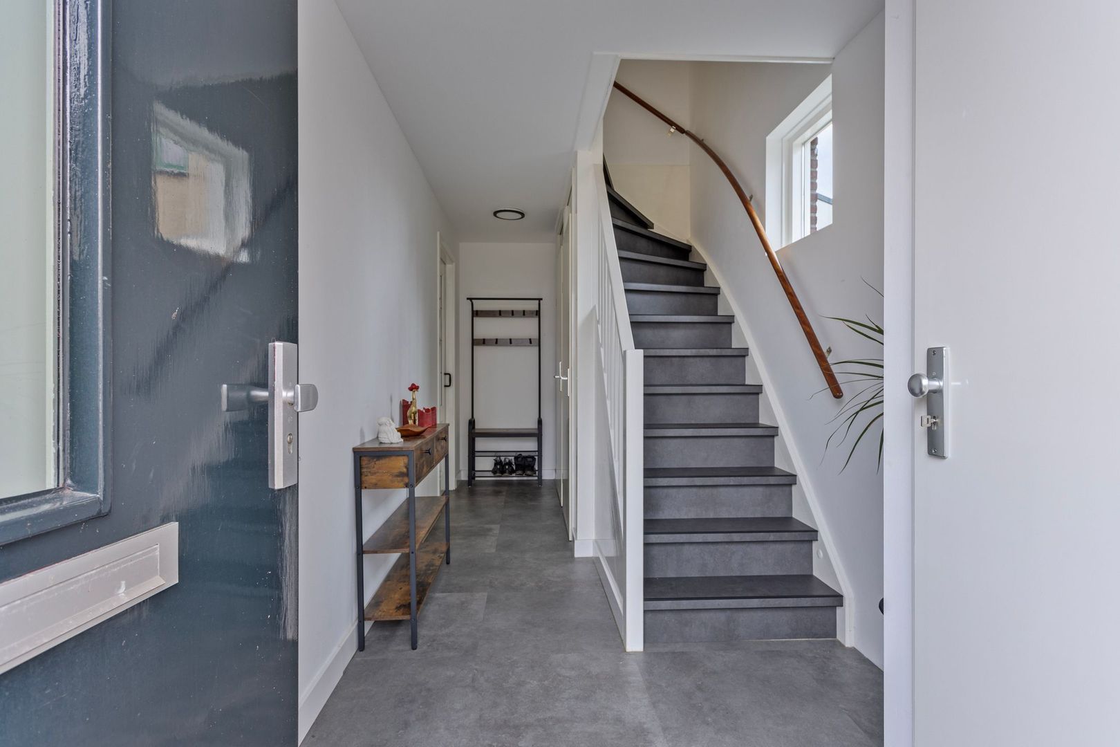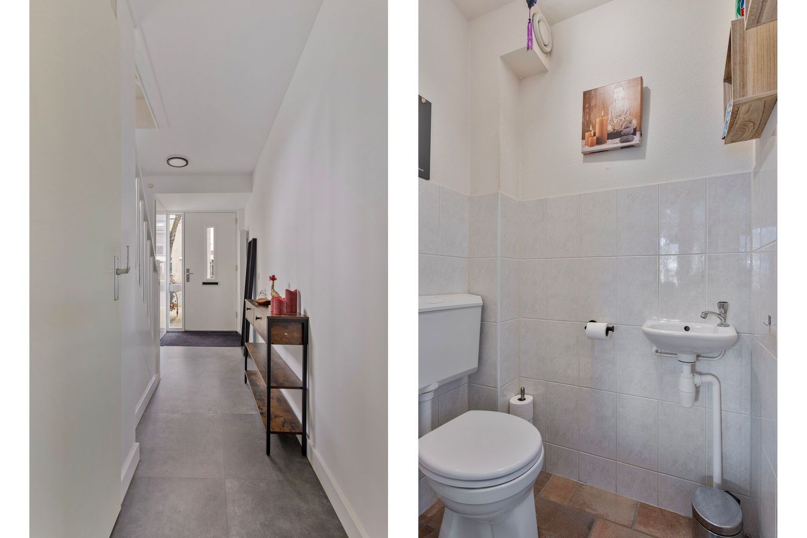 Via de voordeur treed je binnen in de ontvangsthal voorzien van pvc-vloer en vloerverwarming. Hier bevindt zich het toilet met fonteintje, meterkast en trapkast met opbergruimte.