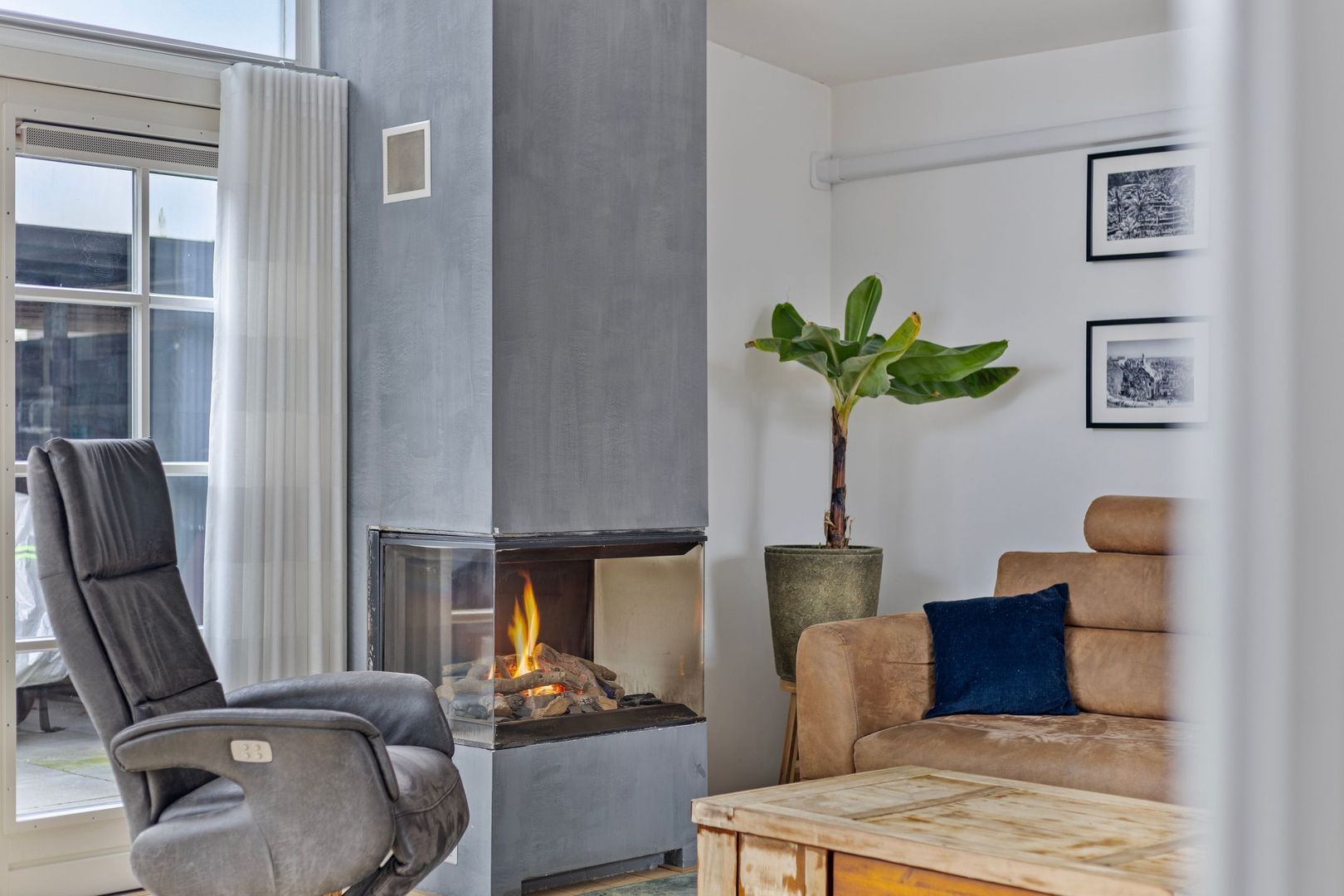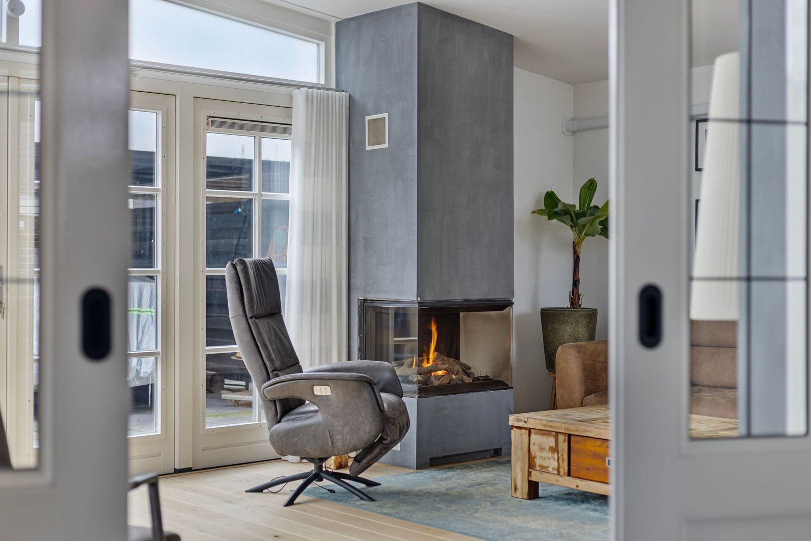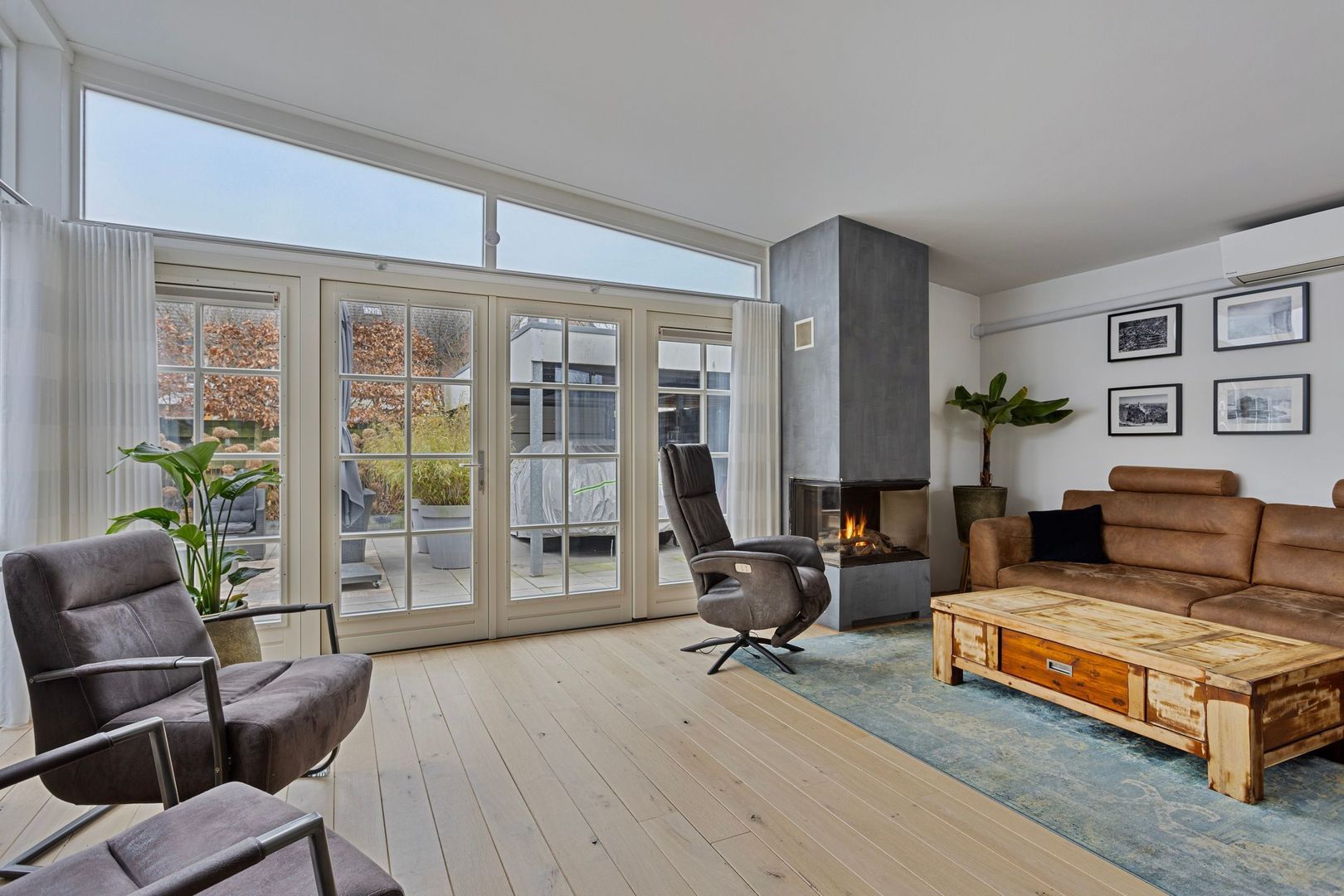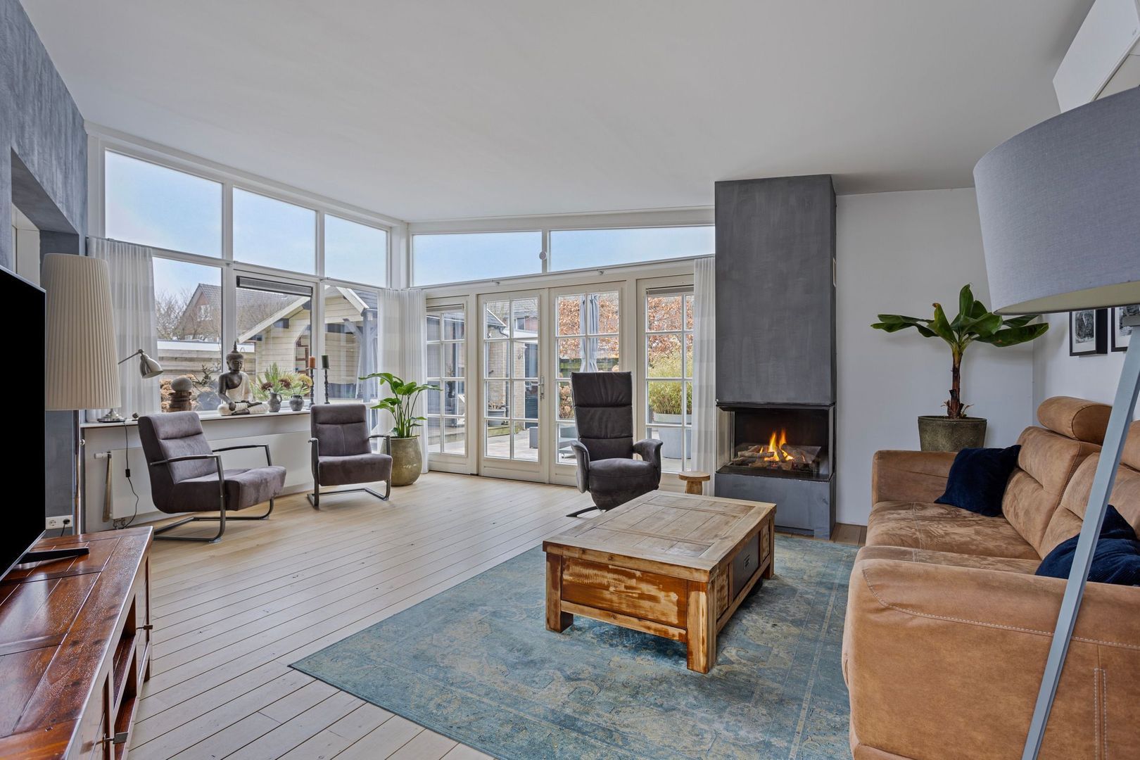 Via en-suite deuren betreed je de lichte woonkamer. Door de vele raampartijen en de openslaande deuren is er volop lichtinval. Een comfortabele woonruimte met sfeervolle gashaard wat in de winter een gezellige en fijne warmte geeft. In andere seizoenen kan de aanwezige airco een uitkomst zijn.