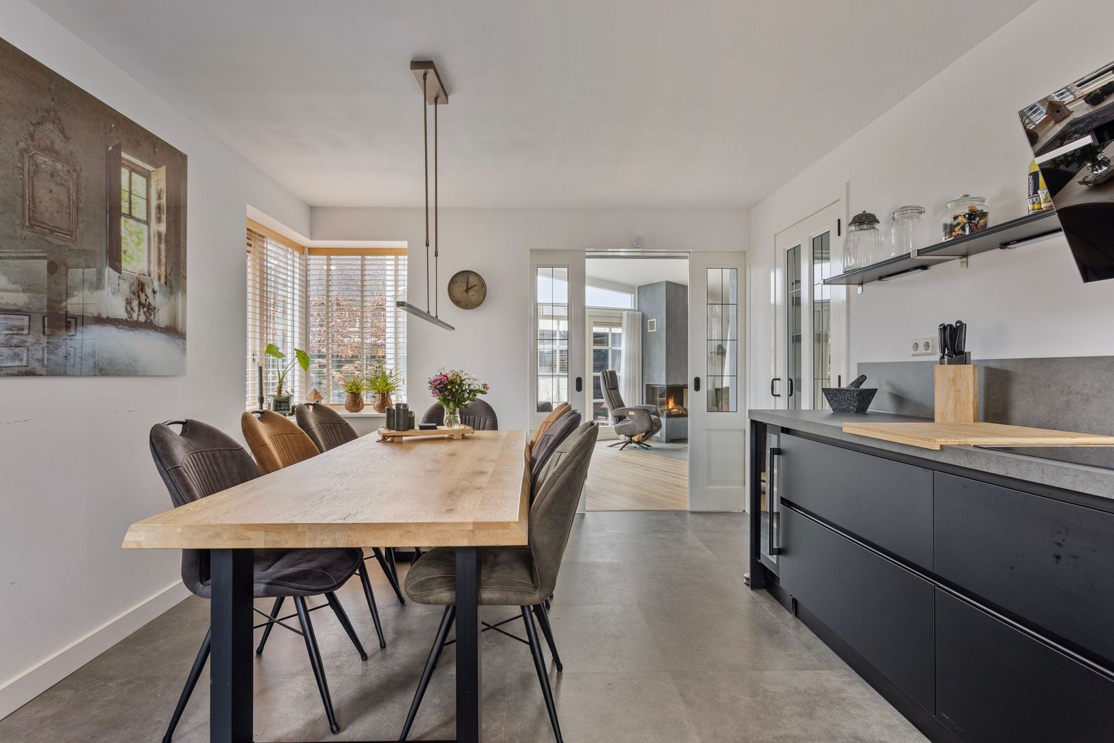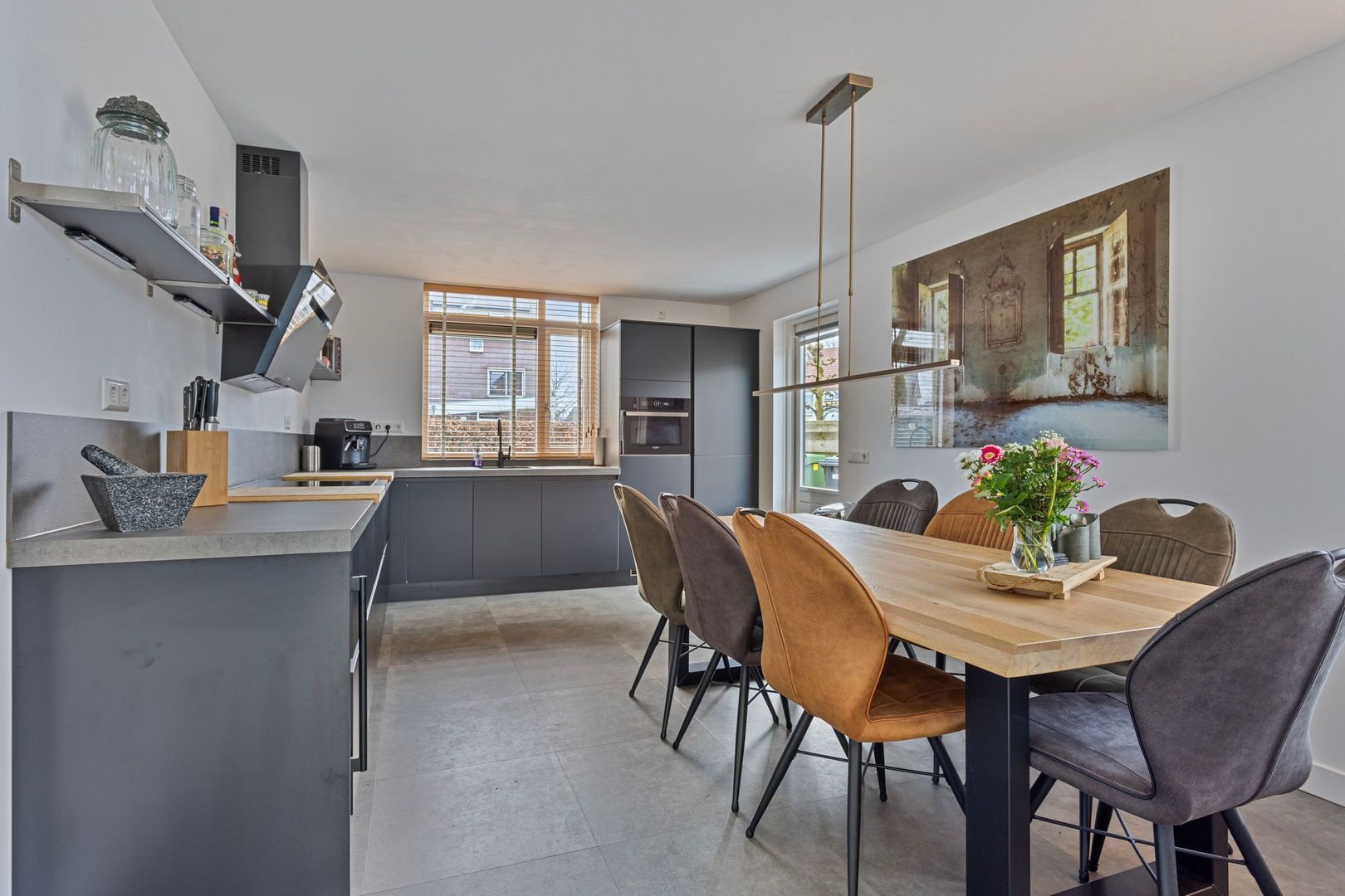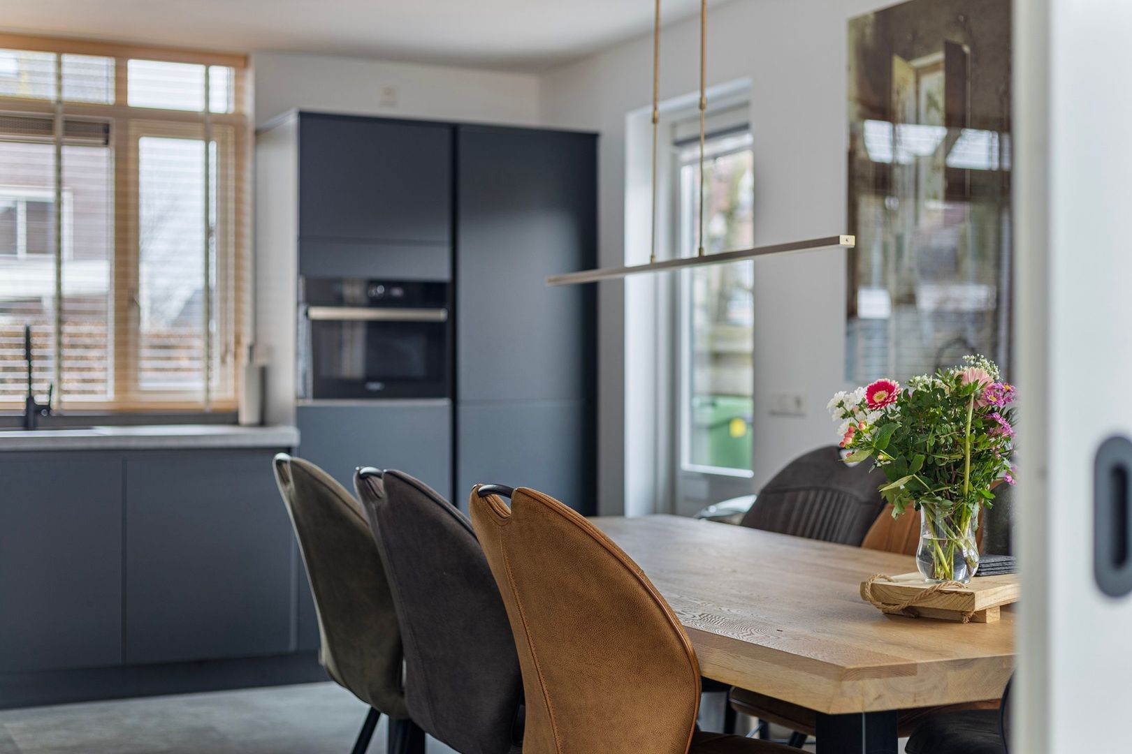 Vanuit de hal kom je binnen in de sfeervolle ruime en luxe woonkeuken (2022). De keuken is voorzien van een strakke en stijlvolle L- opstelling voorzien van een werkblad met een composiet look, keramische kookplaat, wandafzuigkap, koelkast, vriezer met 3 lades en ijslade, combimagnetron, en vaatwasser en om het geheel compleet te maken een klimaatkast om o.a. de wijnen op de juiste temperatuur te bewaren. Daarnaast is de woonkeuken voorzien van vloerverwarming en een pvc-vloer.