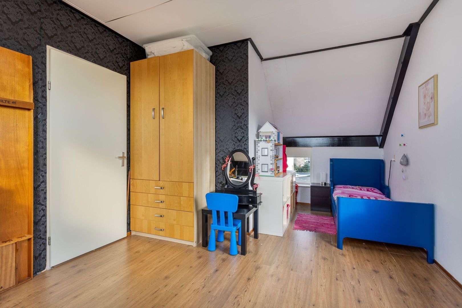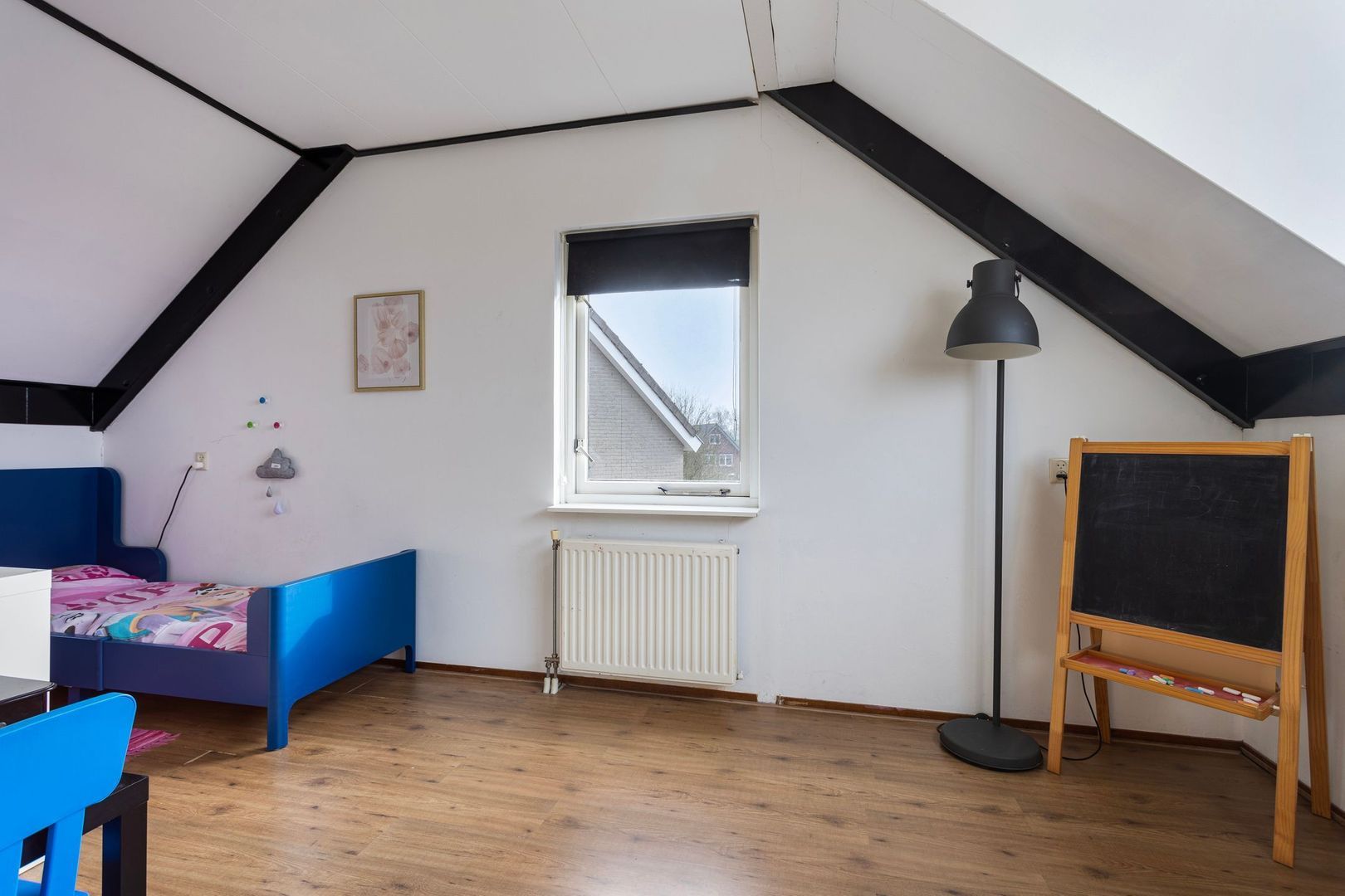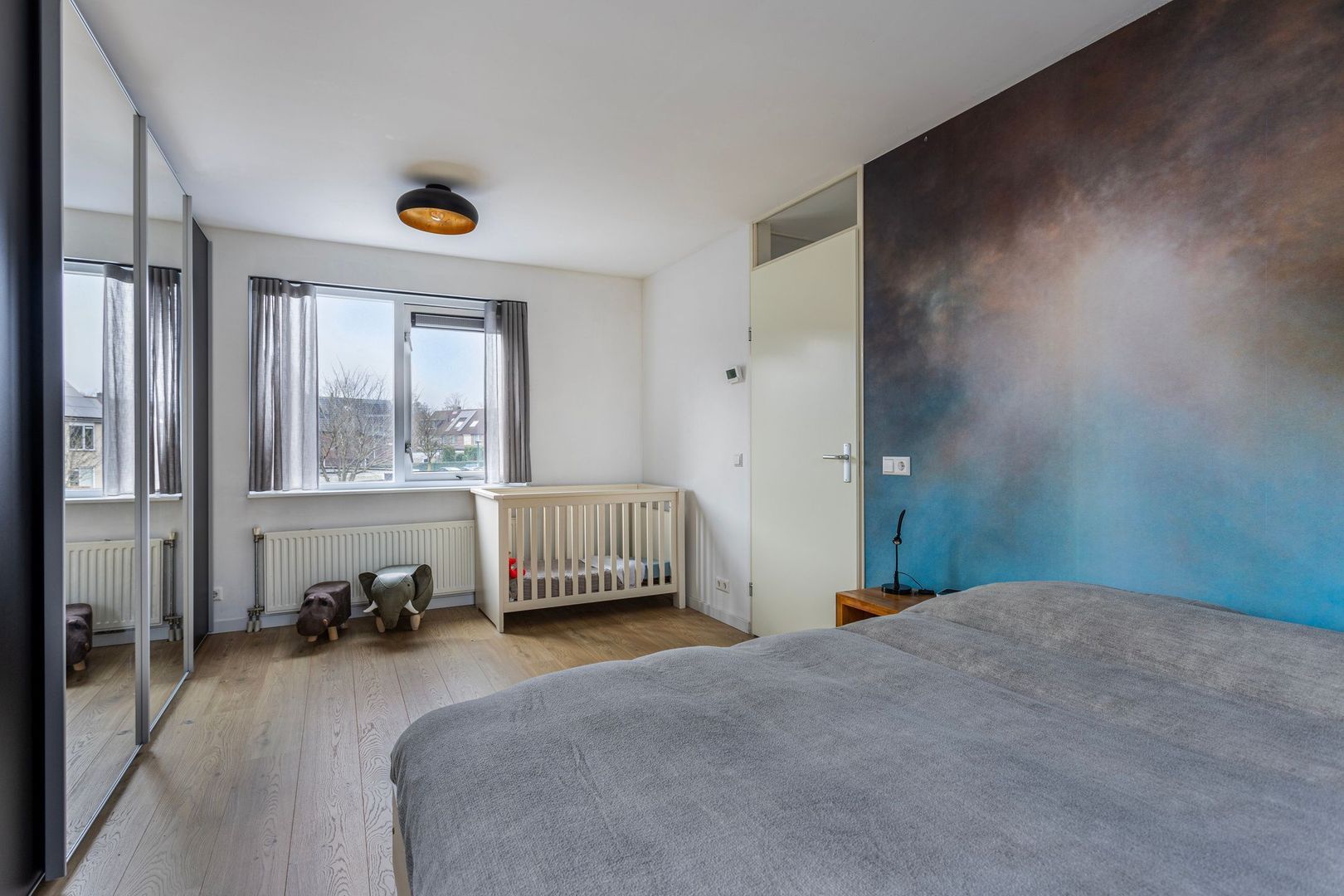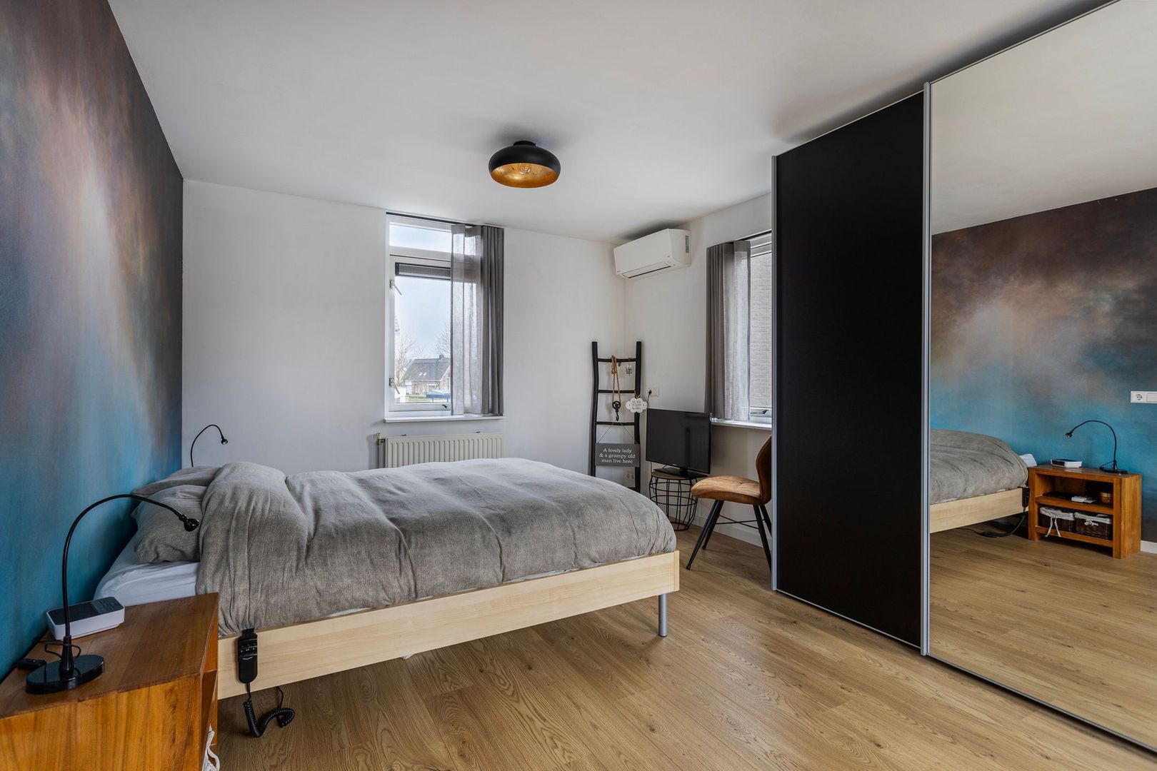 Eerste verdieping: via de pvc-trapopgang (vernieuwd in 2023) komen we op de overloop, deze geeft toegang tot de royale ouderslaapkamer (voorheen 2 slaapkamers). Deze slaapkamer loopt vanaf de voorzijde door naar de achterzijde. Door de ramen aan beide zijden en een zijraam is dit een prachtig licht slaapvertrek. De aanwezige airco zorgt voor de juiste temperatuur in verschillende jaargetijden.