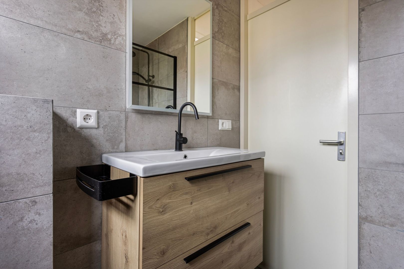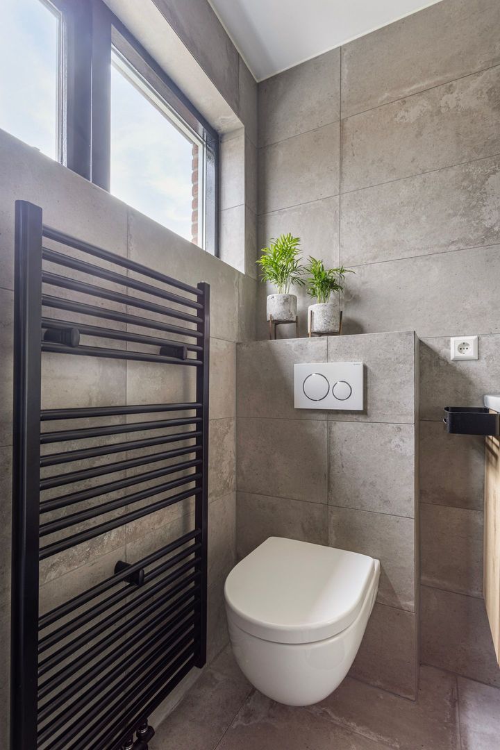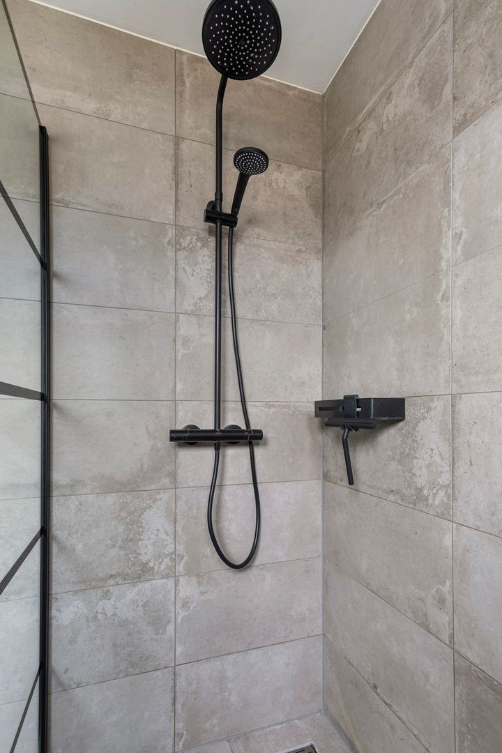 De stijlvolle badkamer (2023) is aan de voorzijde gelegen en heeft een luxe uitstraling met inloopdouche met regendouche, wastafelmeubel, verwarmde spiegel, design radiator en zwevend toilet.