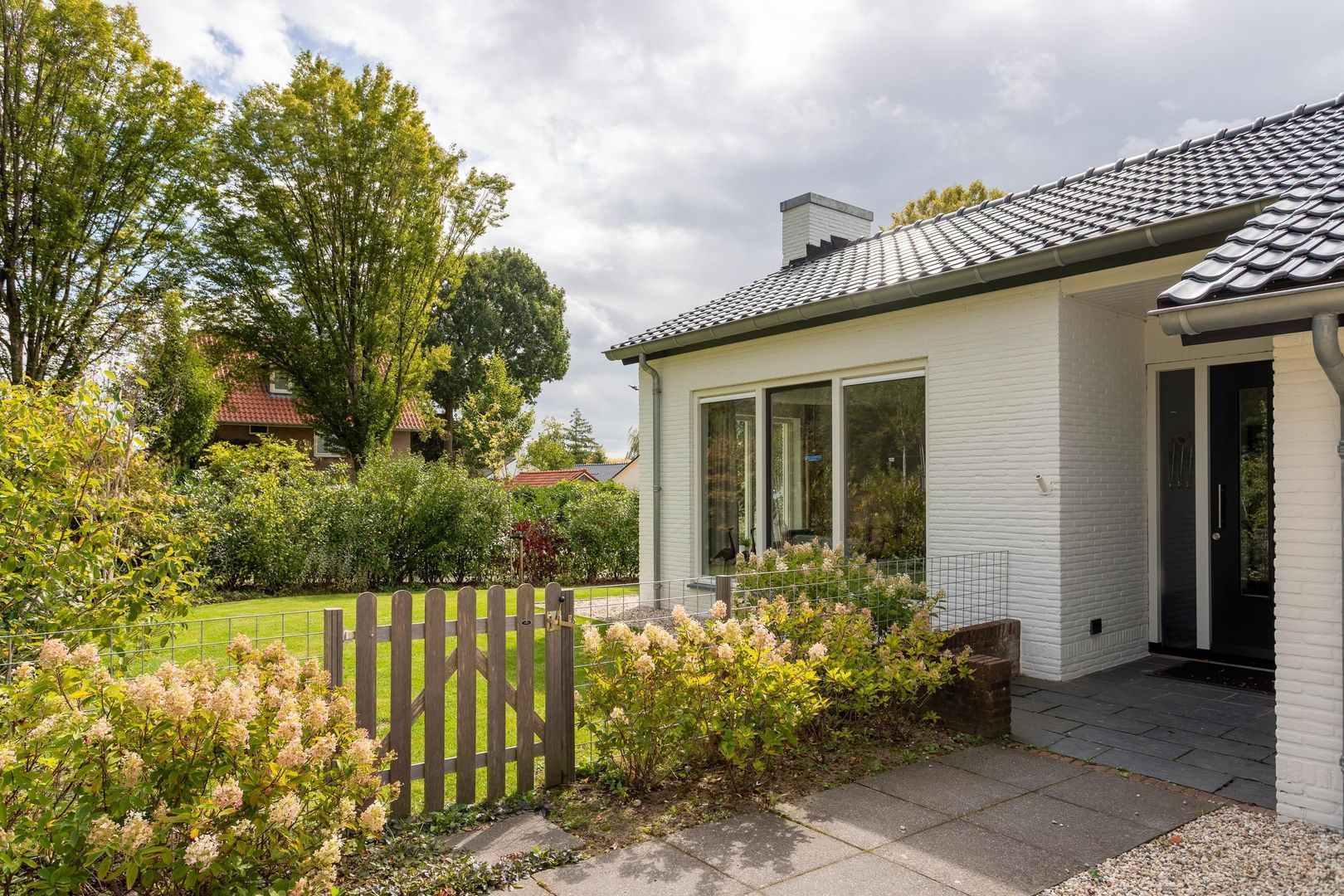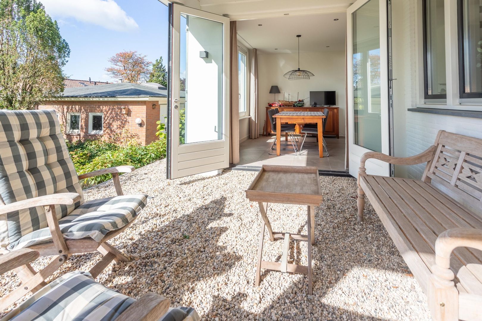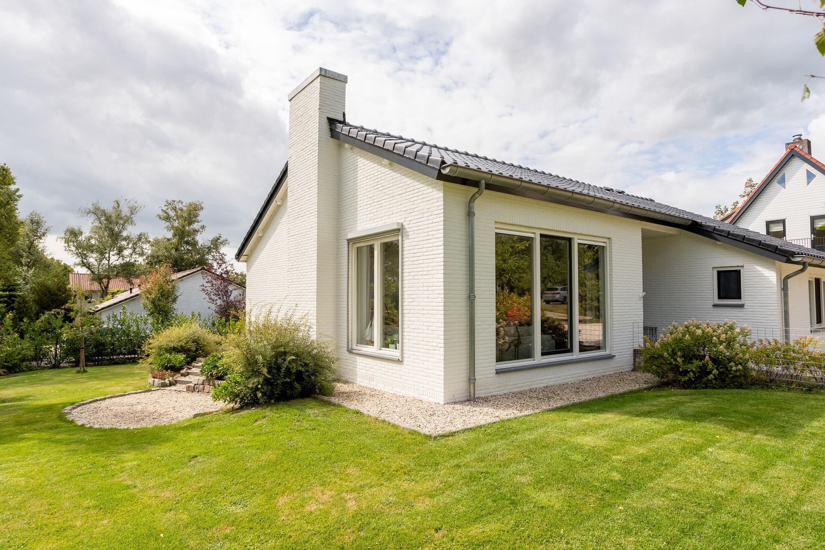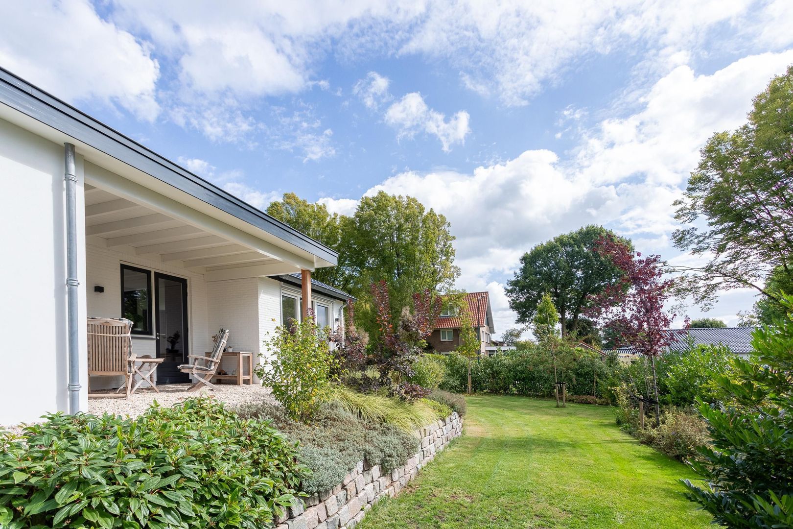 Rondom de bungalow ligt een fraai aangelegde tuin die altijd wel een plekje in de zon of schaduw biedt. Aan de zijde van de keuken is een veranda in dezelfde stijl als de woning gerealiseerd: een verlengstuk van je leefruimte, perfect voor ontbijt buiten of een lange zomeravond met uitzicht op het groen.